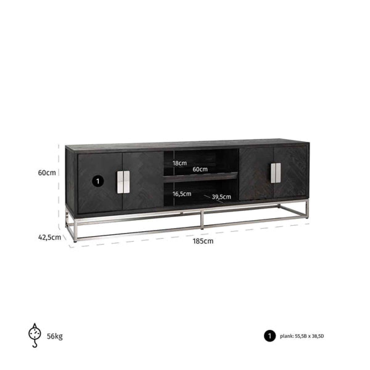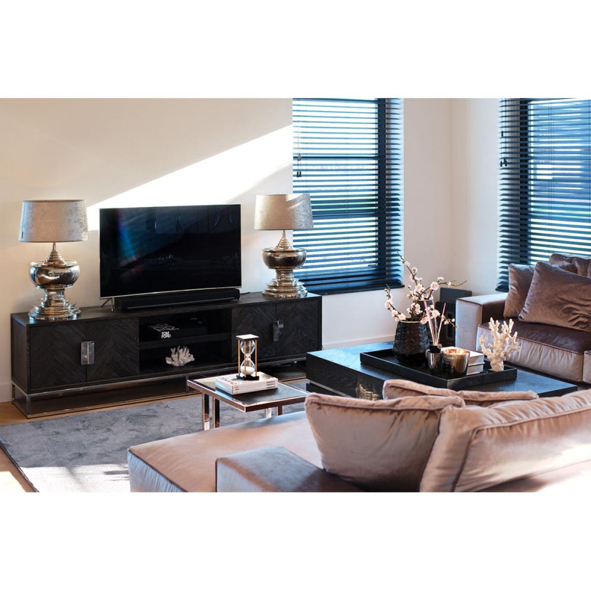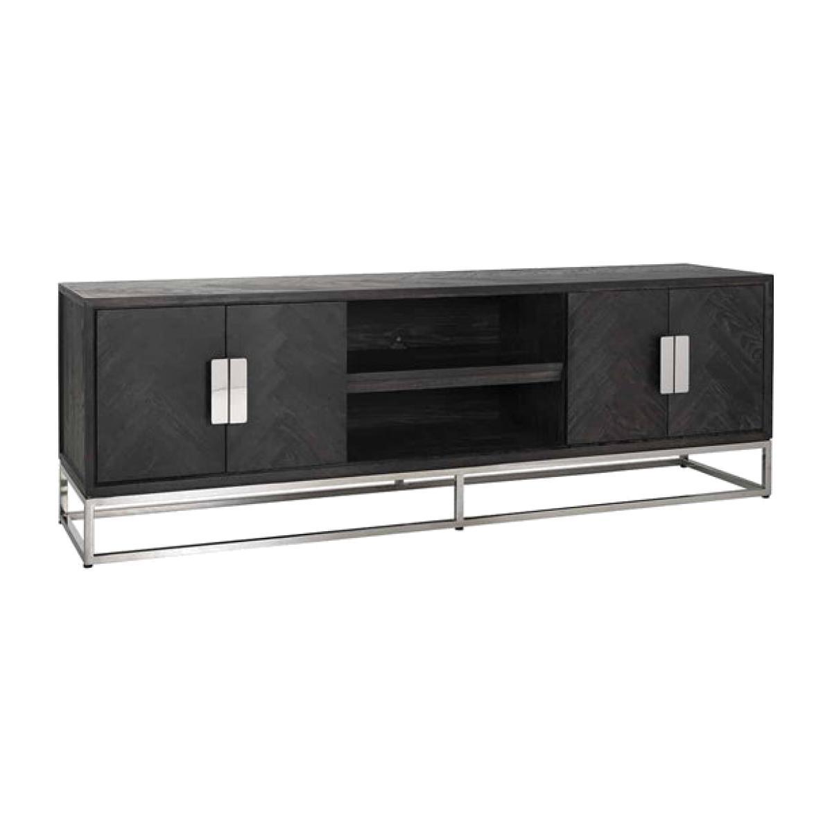 The Richmond Blackbone Silver TV Unit is a quality piece which will suit any home. Made from oak, the unit sits on a stainless-steel frame and has plenty of space for technical and audio equipment. Each end has a double front cupboard with doors, and the centre piece features an open shelving space. Measuring H: 60cm, W: 185cm and D: 42cm this piece is ideal for storing DVDs, remote controls and gaming equipment, making everything easy to access when needed and tidy away when not in use. The top of the unit features a unique herringbone design, giving it a sophisticated finish. *Moot Trading Ltd is not a lender and acts only as an introducer. The credit product is provided by Klarna Bank AB (publ). Credit is only available to permanent UK residents aged 18 and over, subject to status. Terms and conditions apply. Please note that the following products are not regulated by the FCA: Pay in 30 days and Pay in 3 instalments. Read More.