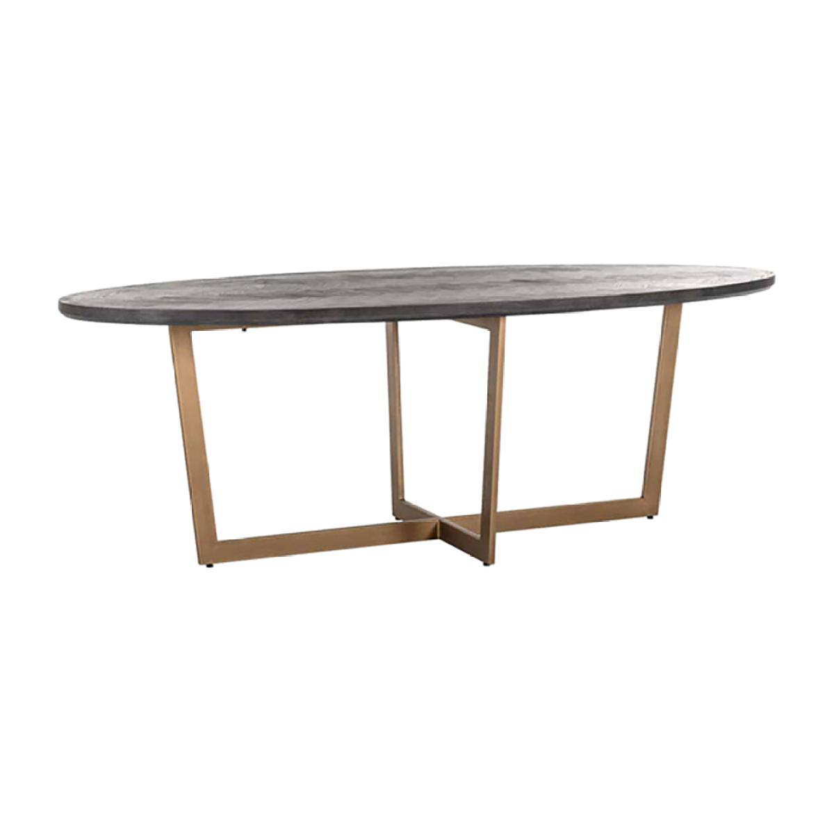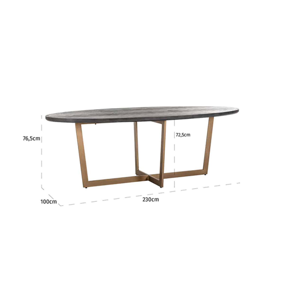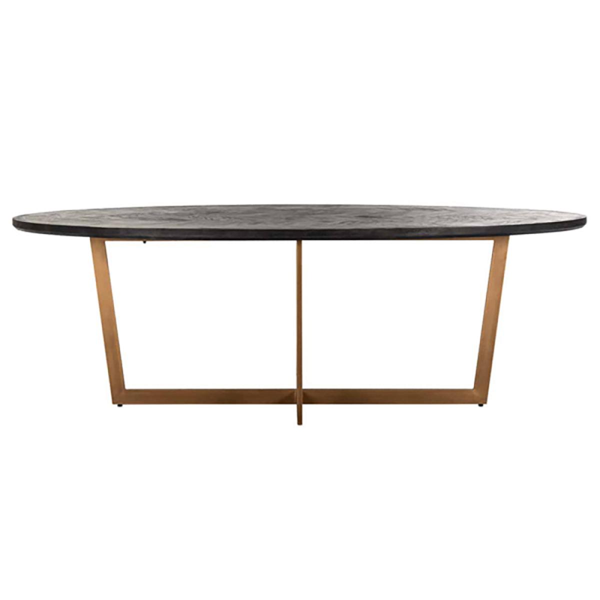 Making a statement isn't necessarily about extravagant materials, flamboyant shapes and startling colours. The team at Richmond Interiors on the Netherlands understand the value and power of simplicity. Carefully chosen lines, shapes and angles executed in thoughtful combinations of texture can be utterly stunning. The Blackbone oval dining table elevates simplicity to a winning level of design excellence. What home wouldn't gain a touch of style from this beautifully plain, richly textured black table-top mounted on a simple brushed brass metal frame. Determinedly minimalist in conception, its rejection of detail and adornment makes its visual effect all the more memorable. Pure class. Dimensions: H: 76.5 x W: 230 x D: 100 cm Materials: Top: Oak | Legs: metal. Weight: 50kg Assembly Required: No