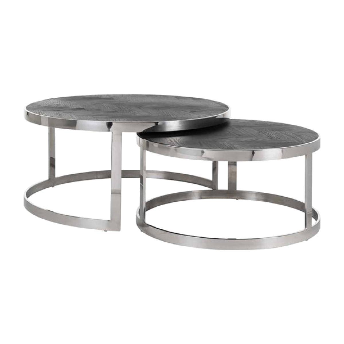 Make a bold design feature with the Richmond Blackbone Set of 2 Silver Round Coffee Table. This set of tables works beautifully both when arranged for an overlapping look or when separated, making them a versatile choice that's perfect for those who enjoy entertaining. Their nested design also ensures they can be neatly stored away when space is required. The table tops are crafted in chic blackened oak and set in sleek stainless steel for a contemporary aesthetic that is sure to delight. The smooth, circular motifs ensure this duo are as timelessly stylish as they are practical and complement a range of interior themes. *Moot Trading Ltd is not a lender and acts only as an introducer. The credit product is provided by Klarna Bank AB (publ). Credit is only available to permanent UK residents aged 18 and over, subject to status. Terms and conditions apply. Please note that the following products are not regulated by the FCA: Pay in 30 days and Pay in 3 instalments. Read More.