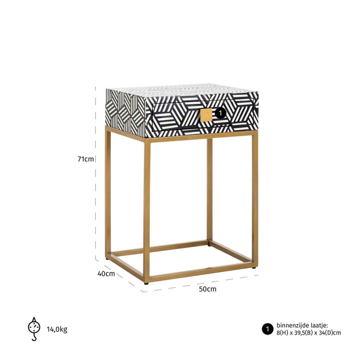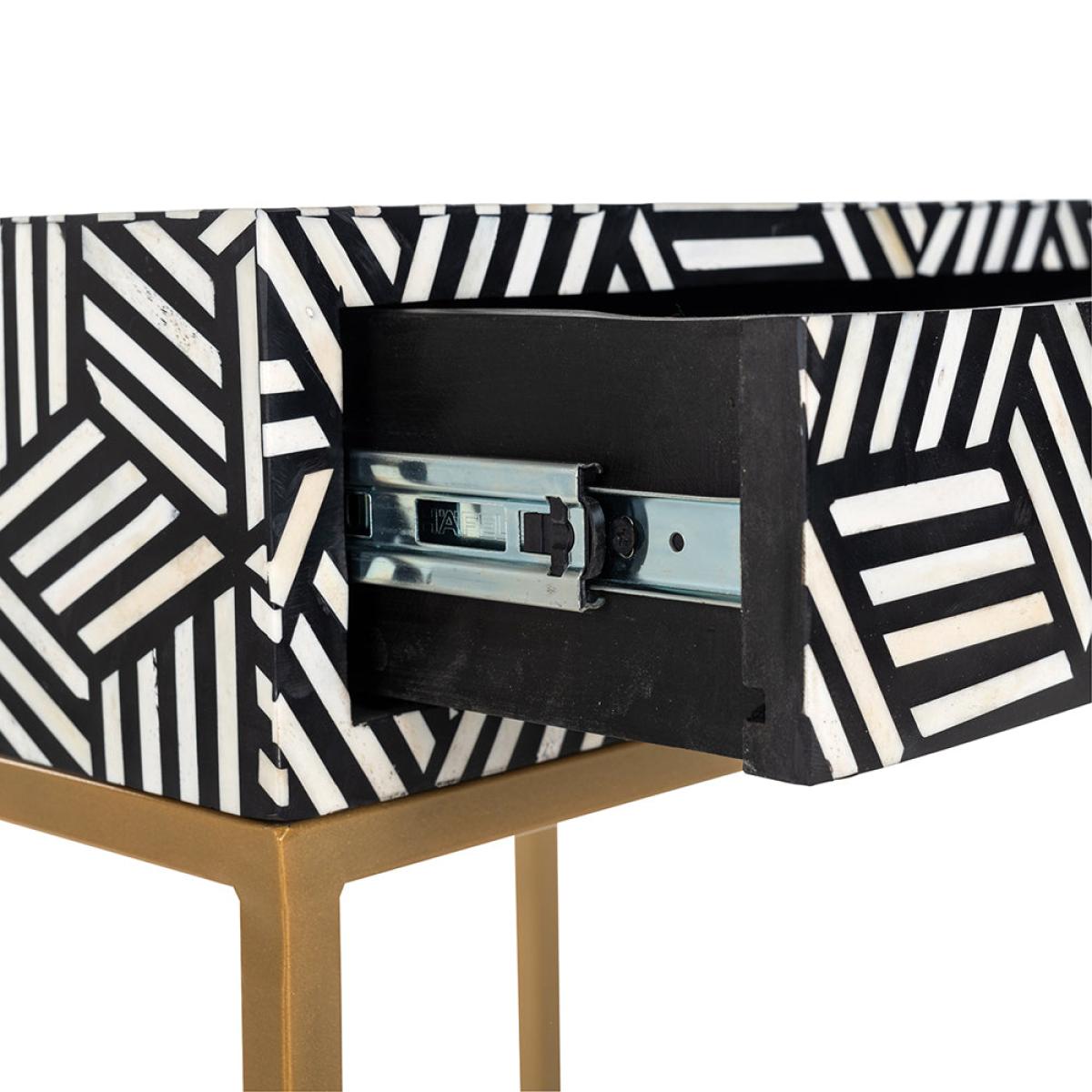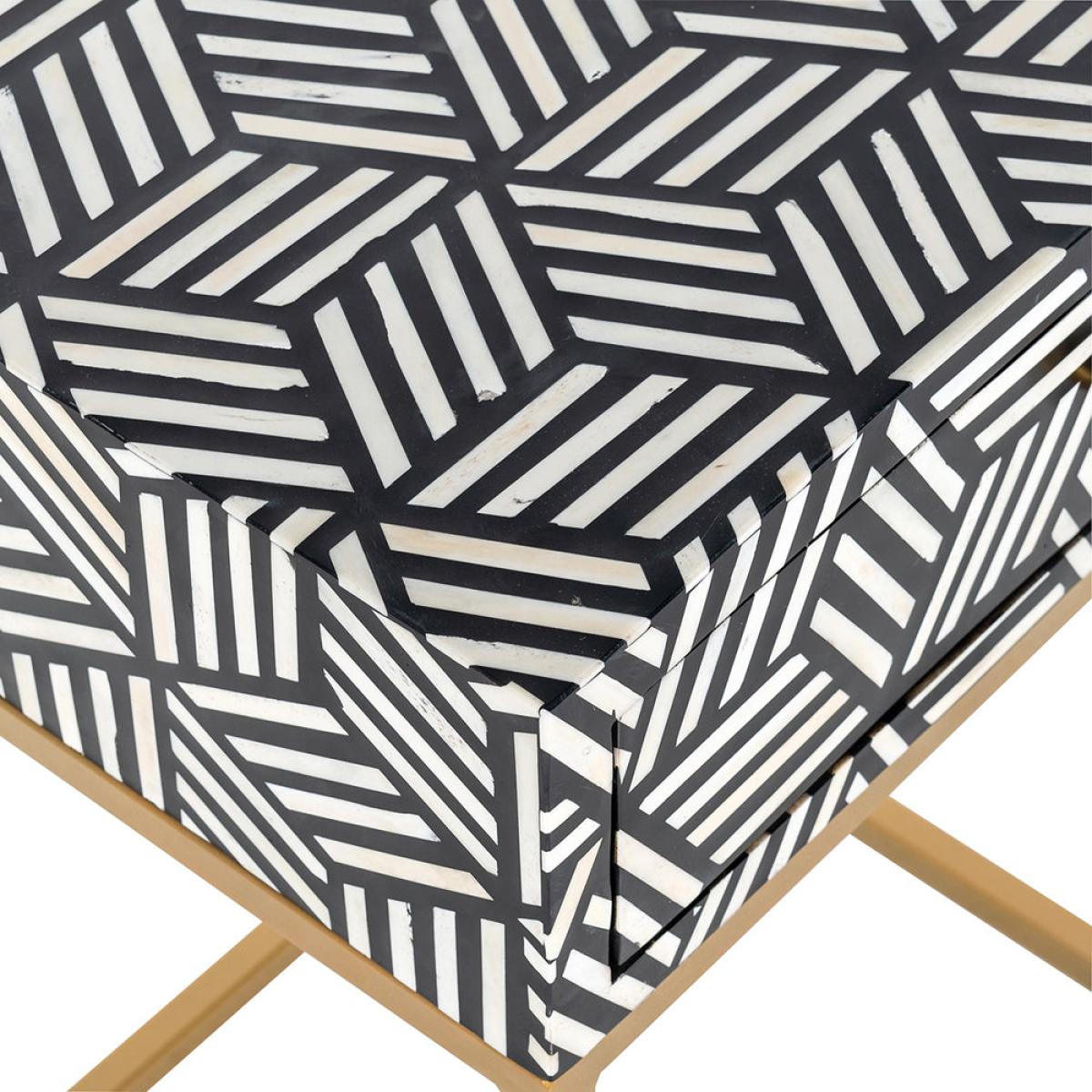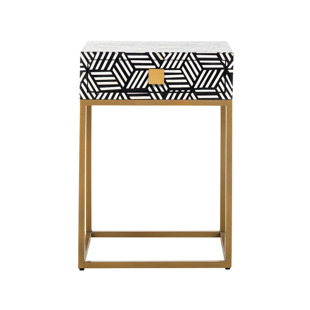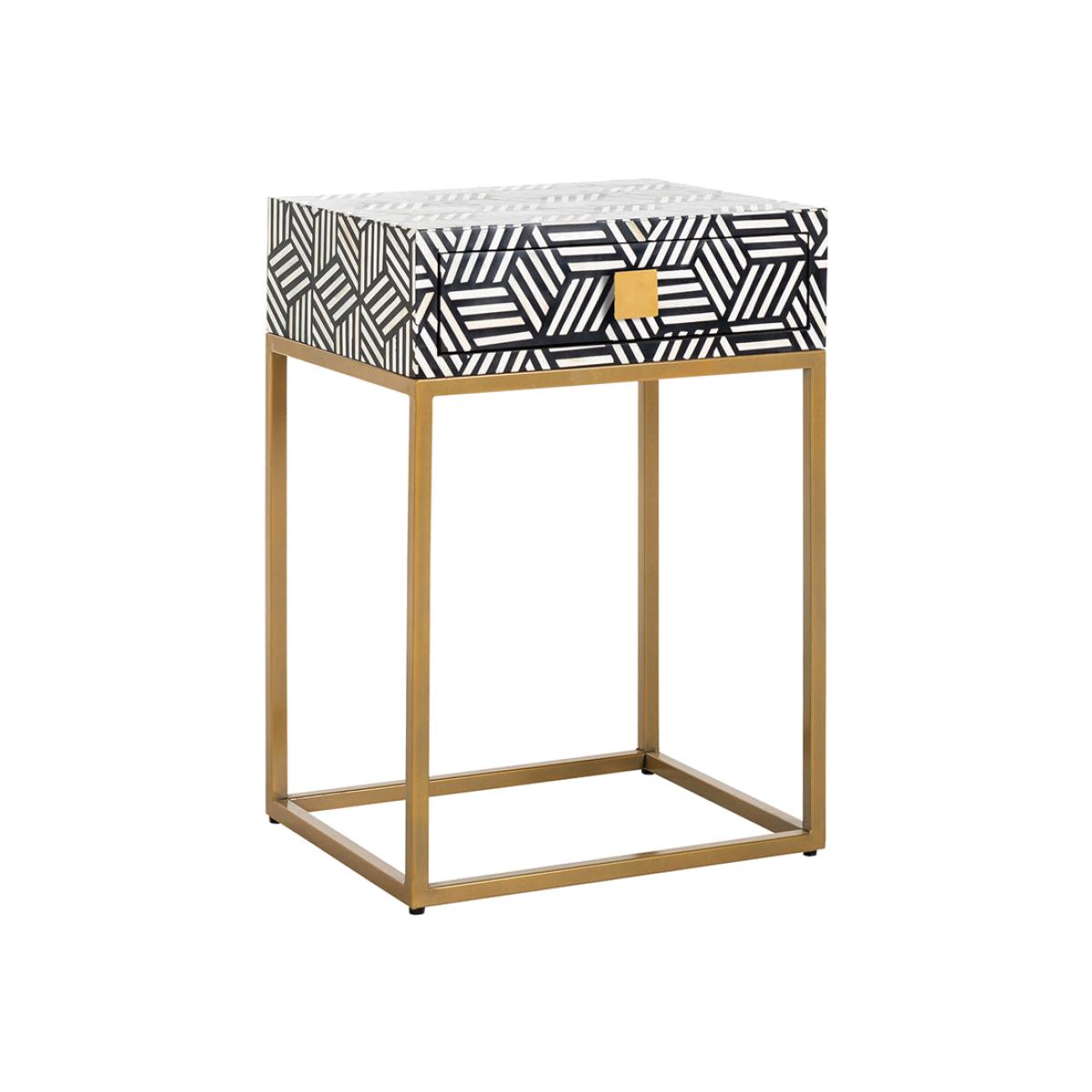 The Bliss nightstand by Richmond Interiors is bold and is certain to make a big impression in your bedroom. With a single drawer that provides ample storage for your night-time essentials, the tabl. View More. The Bliss nightstand by Richmond Interiors is bold and is certain to make a big impression in your bedroom. With a single drawer that provides ample storage for your night-time essentials, the table is practical as well as beautiful. The striking geometric pattern in black and white is made from recycled bone and wood, making this piece a good choice for the environment. Hard-wearing with a strong and durable iron frame, this luxurious nightstand is perfect for placing a lamp or candle on and looks stunning as a pair on either side of the bed. Sustainable, practical and beautiful, what more could you wish for?.