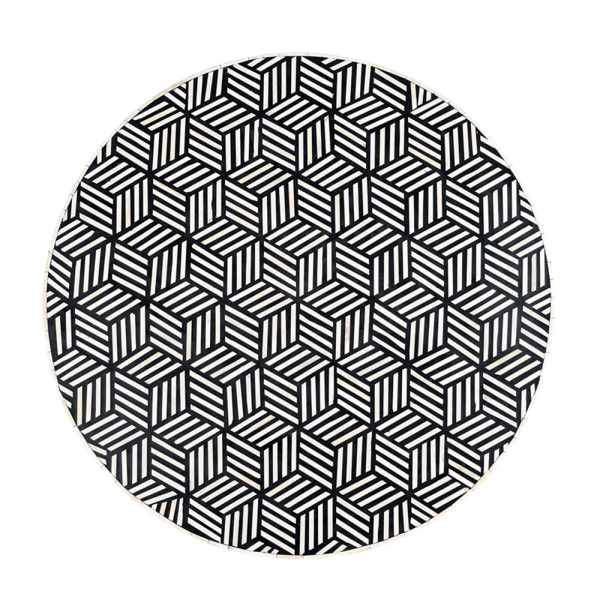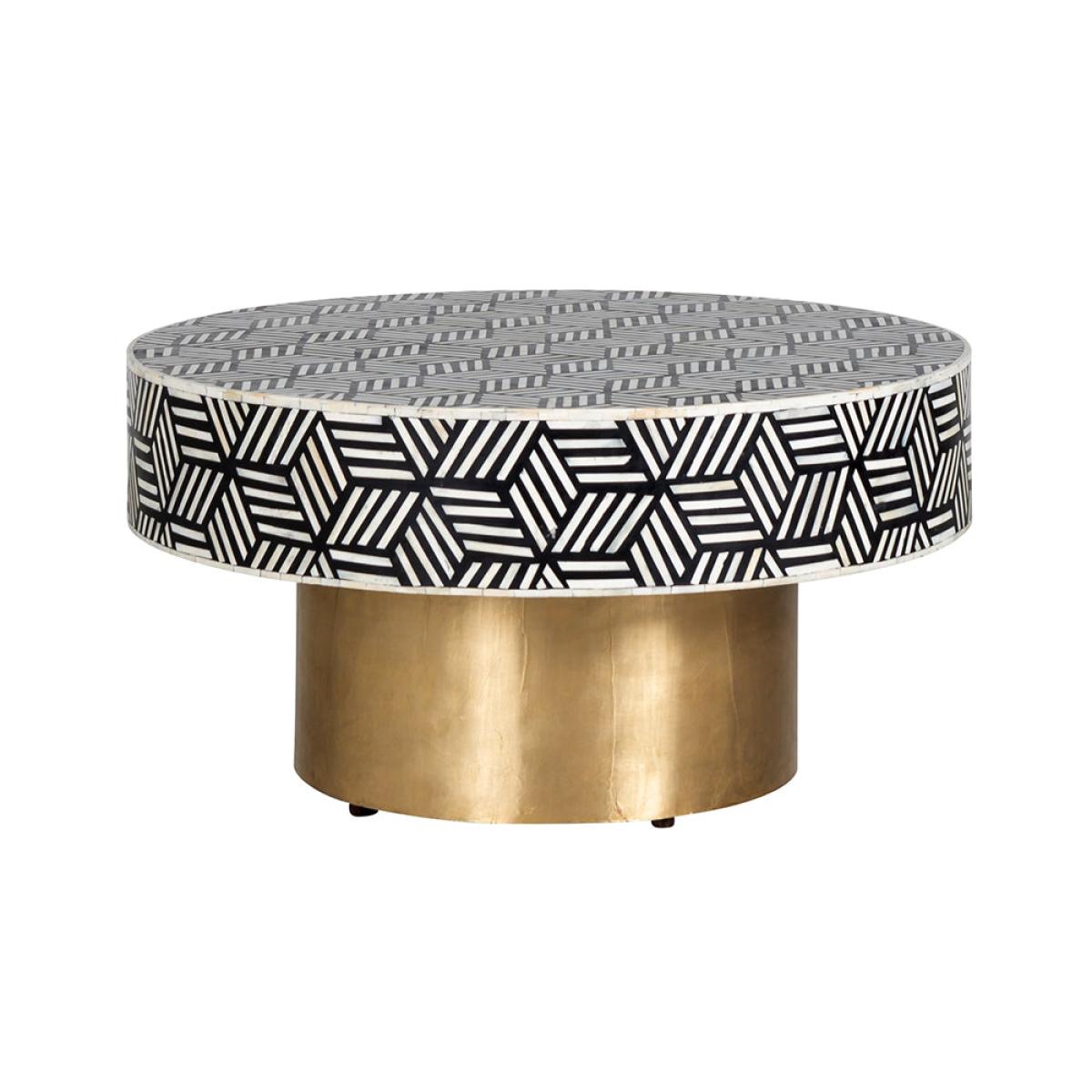The bold geometric pattern on the Richmond Bliss Coffee Table makes it an eye-catching addition to any seating area. The round monochrome tabletop and the sleek, gold iron base combine to create a. View More. The bold geometric pattern on the Richmond Bliss Coffee Table makes it an eye-catching addition to any seating area. The round monochrome tabletop and the sleek, gold iron base combine to create a thoroughly modern coffee table, a standout piece in any home. The table top is made from wood and cruelty-free animal bone and the striking black and white design has a unique, almost 3D effect. Use it in your lounge or snug to add a splash of pattern and plenty of interest. It is the perfect piece to liven up a neutral scheme, complement a monochrome theme or to embrace maximalist style.