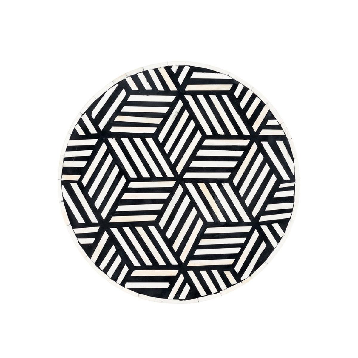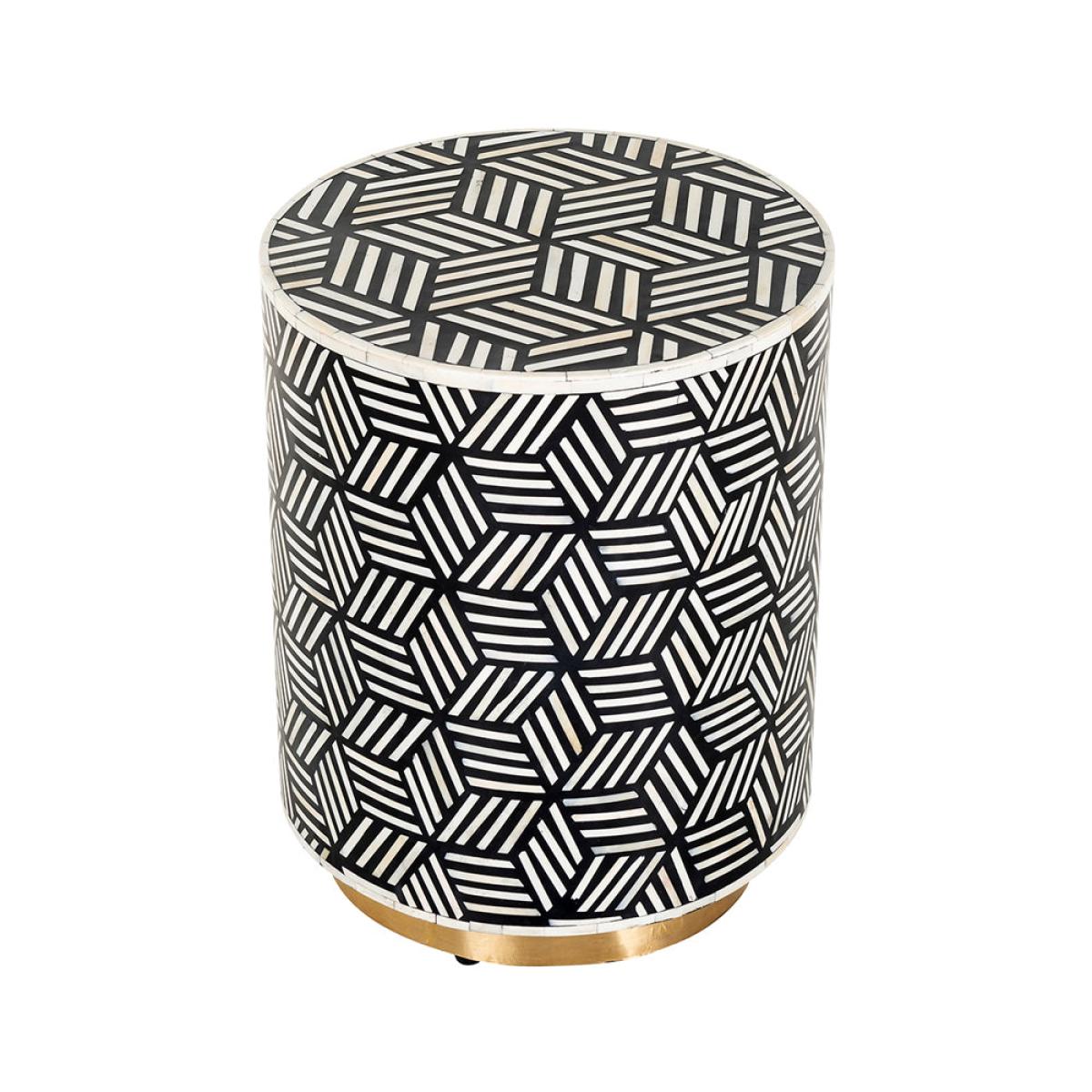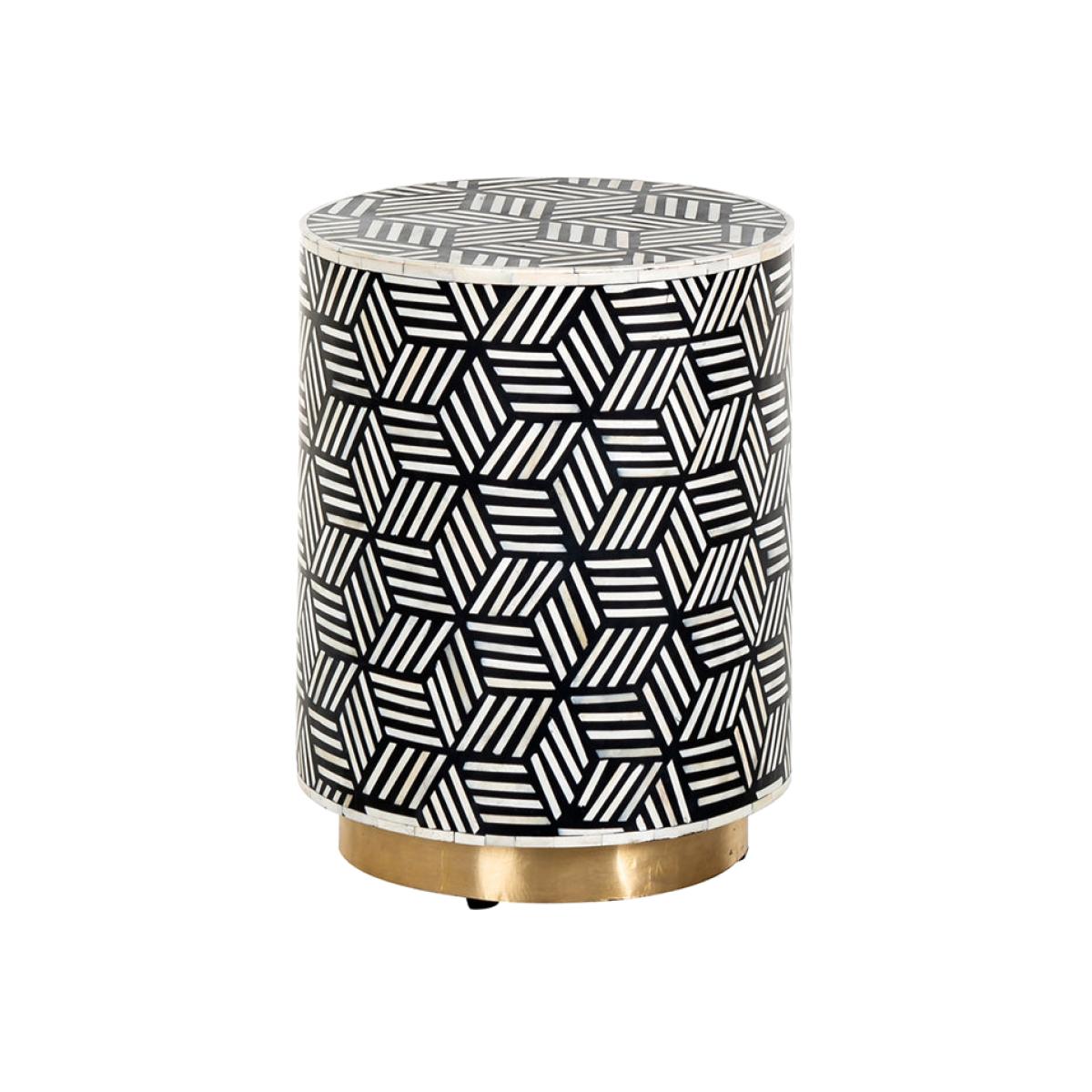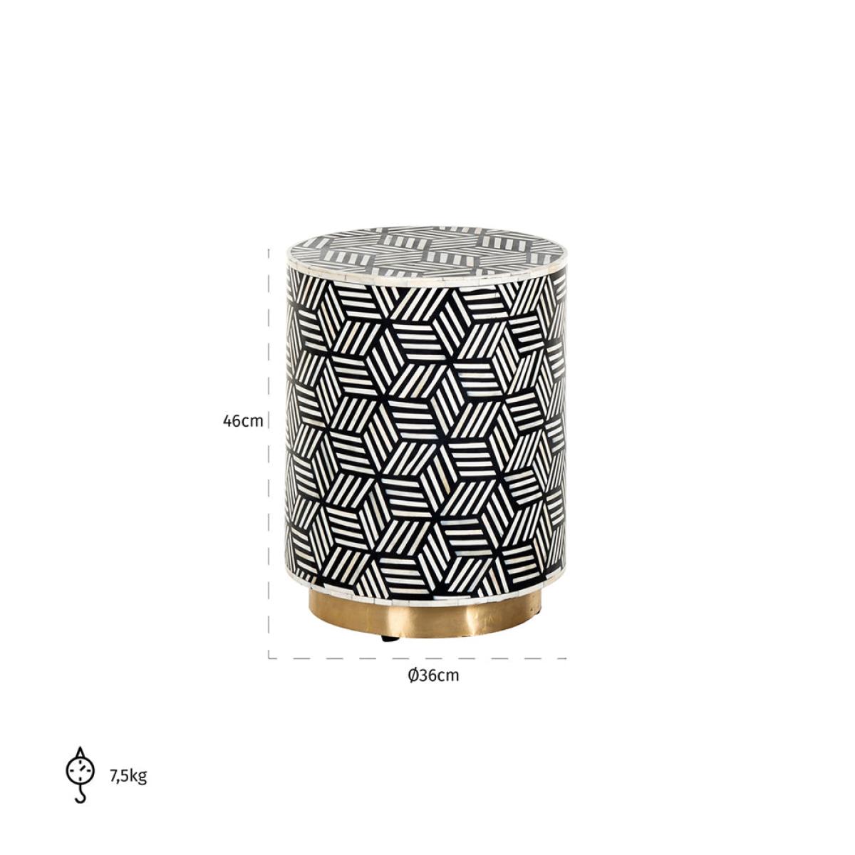 This unique end table from Richmond is part of the Bliss range. Measuring 46cm in height, it has a diameter of 36cm. The Richmond Bliss End Table is something of a statement piece. With its strikin. View More. This unique end table from Richmond is part of the Bliss range. Measuring 46cm in height, it has a diameter of 36cm. The Richmond Bliss End Table is something of a statement piece. With its striking, yet intricate and detailed geometric pattern, which is made from cruelty free animal bone, this table certainly makes a bold impression. The Richmond Bliss End Table has a contrasting golden base, and will look fantastic in a hallway or lounge. The golden base adds a modern and sleek look, whilst the patterned geometric detail adds a unique and eye-catching element to this beautiful table.