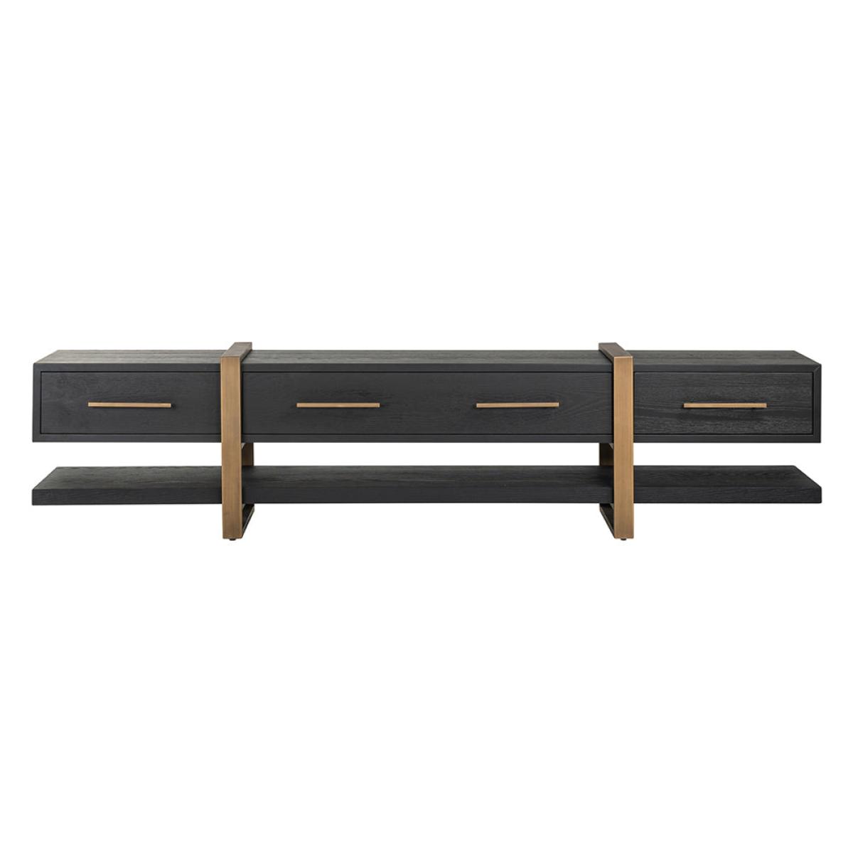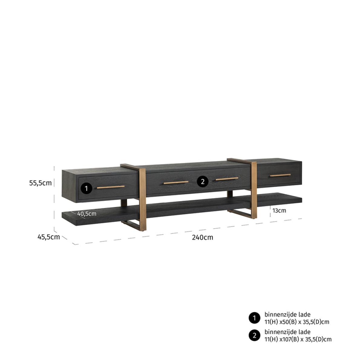 Cool and contemporary, the Richmond Cambon three-drawer TV unit is an elegant piece that will complement your home. Its modern sleek lines, slim handles and the combination of oak and metal make it a much sought-after unit. Handy drawers for storage and ample shelving space are appealing additions and this delightful unit will suit any colour or style of décor. There is plenty of staging space for your entertainment system and the unit will look stunning in a contemporary open plan living area. It can also be placed in a smaller guest lounge alongside your modern artwork and fine furnishings. Dimensions: H: 55 x W: 240 x D: 45 cm Materials: Oak Veneer, Metal Assembly Required: No Care Instructions: Wipe with a clean, dry cloth