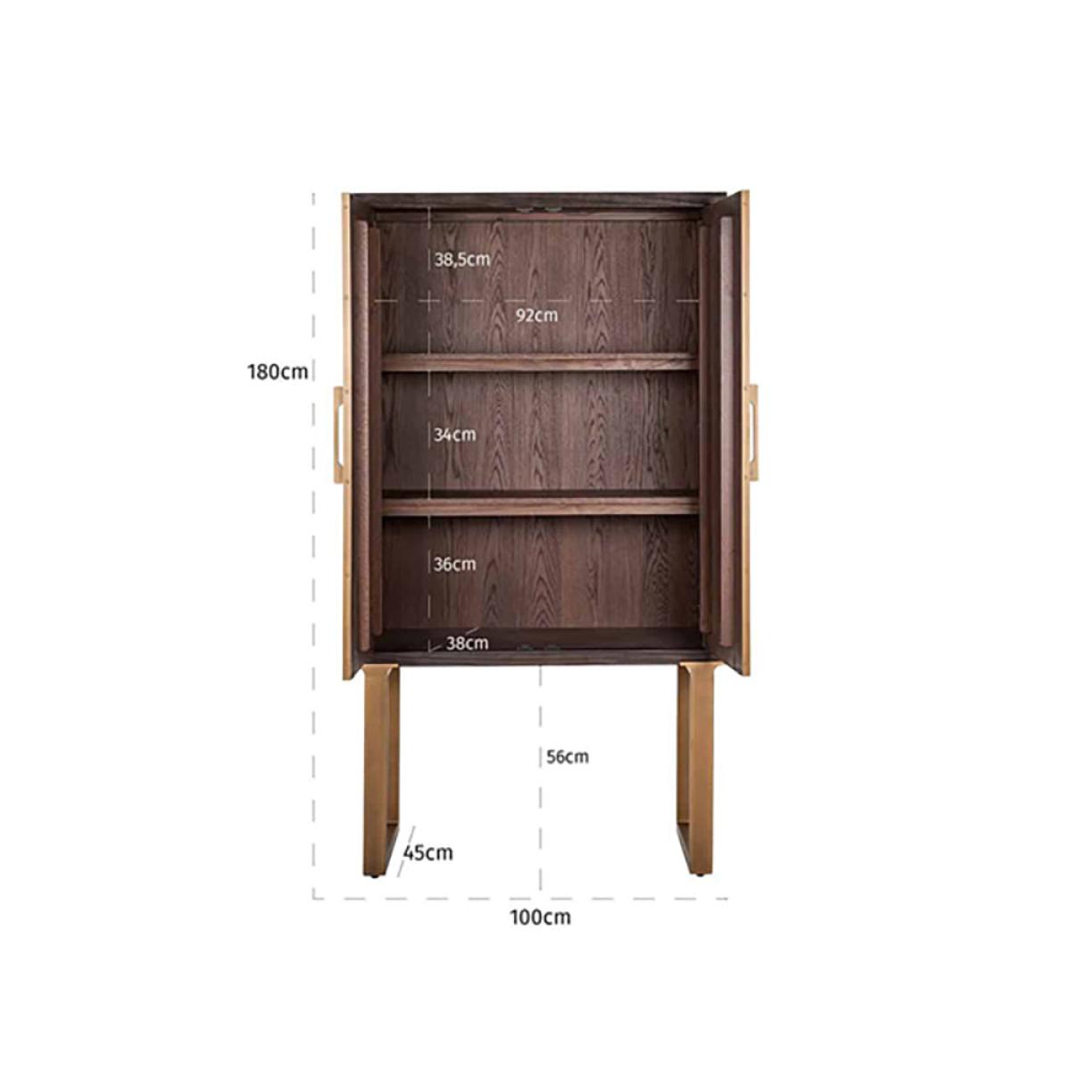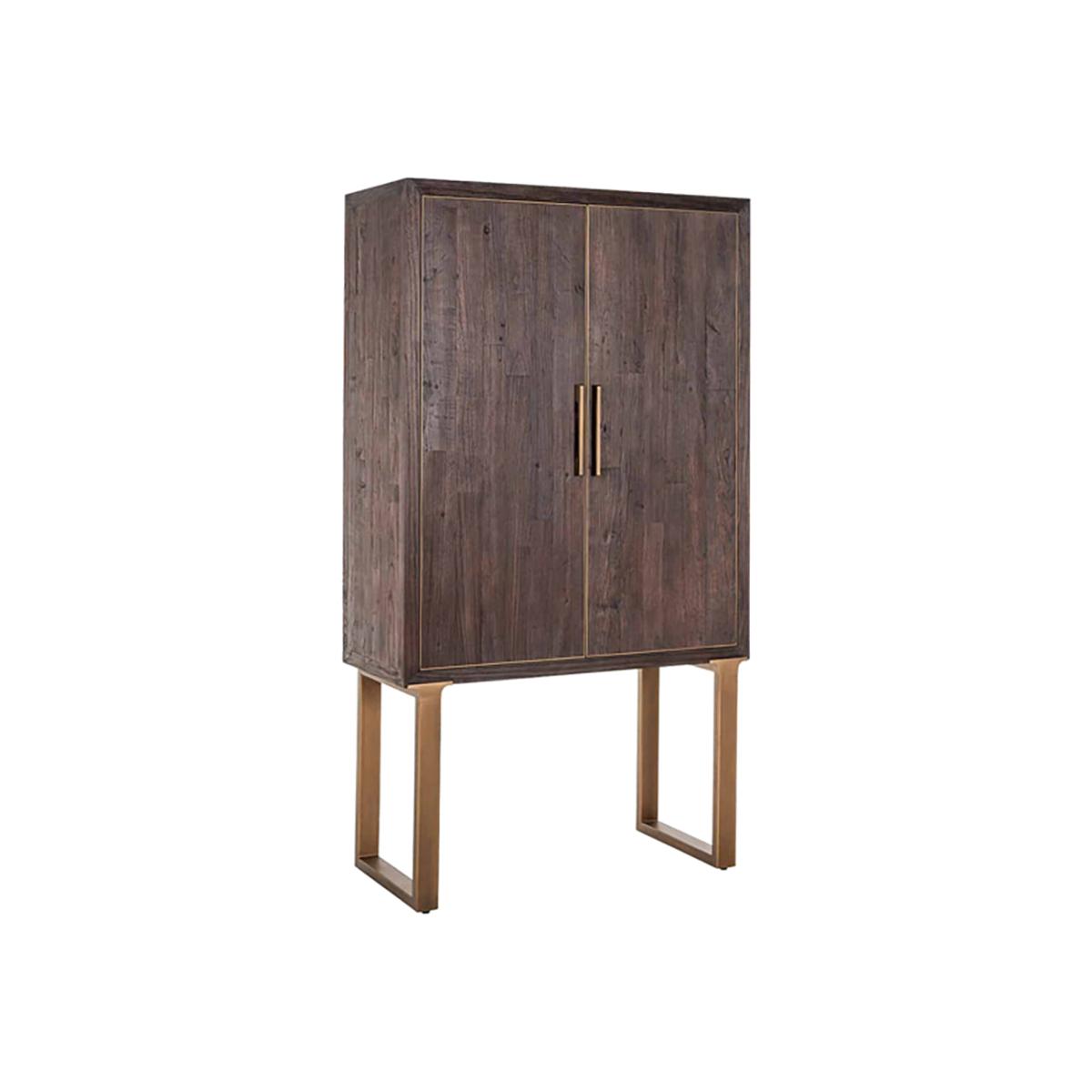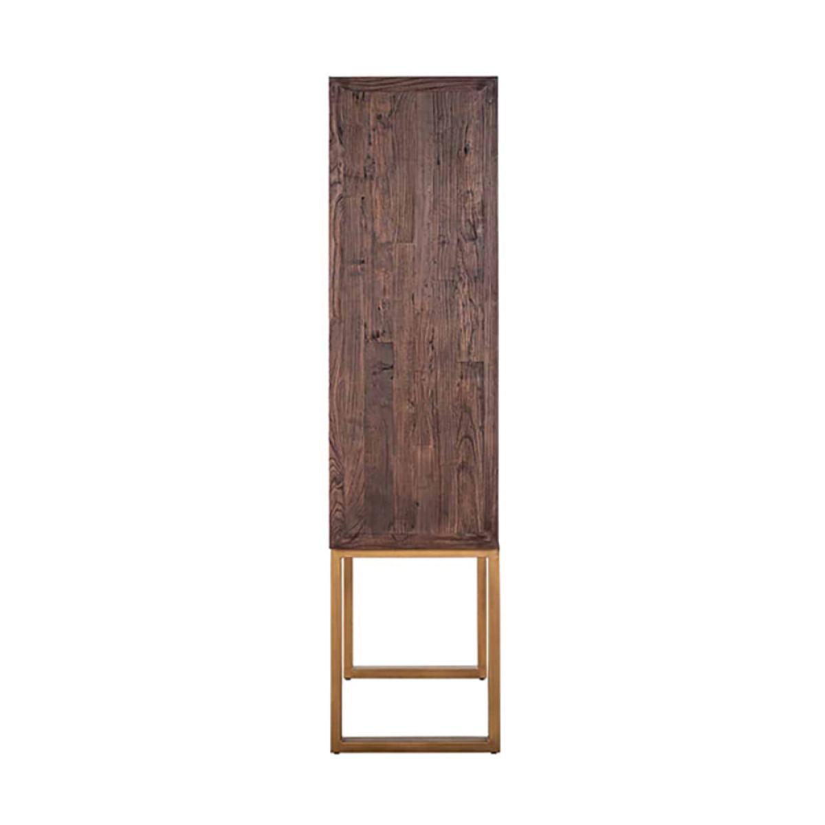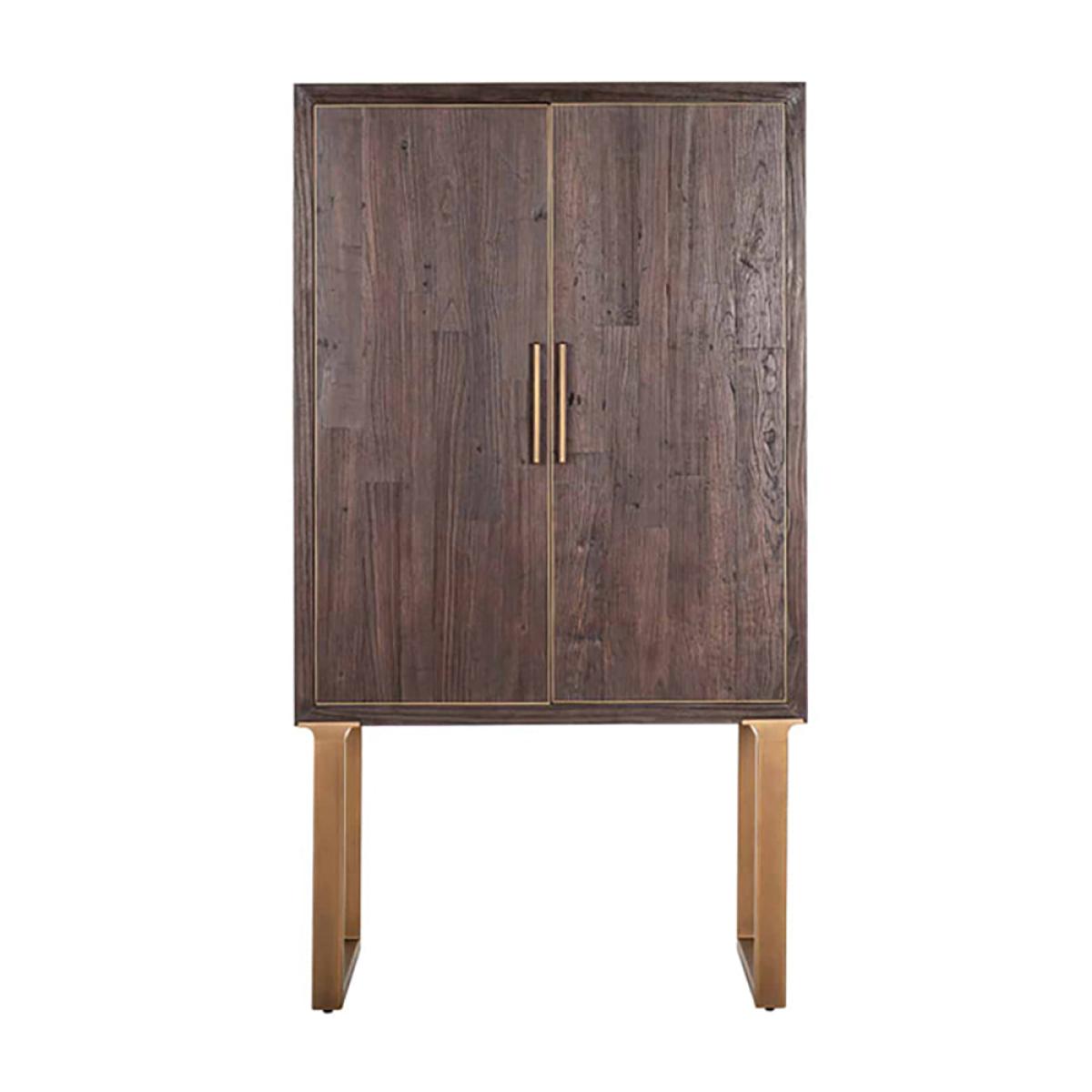 Here is how to make a bold statement with your storage solution - the Cromford 2-door elm-wood cabinet. This stunning piece demonstrates how simple design essentials can be elevated by choosing quality materials carefully. A rich recycled elm is paired with a metal base, trims and accents in sleek bronze. The result is effortlessly warm and dignified. The Cromford is also highly functional: it lifts your storage to a comfortable height and leaves the floor uncluttered. This attractive cupboard will complement a wide range of decorative styles and palettes, from uptown fashion through to sophisticated minimalism. It measures 180cm high, 100cm wide and 45cm deep. Dimensions: H: 180 x W: 100 x D: 45 cm Weight: 74kg Materials: Recycled elm, Metal Assembly Required: No