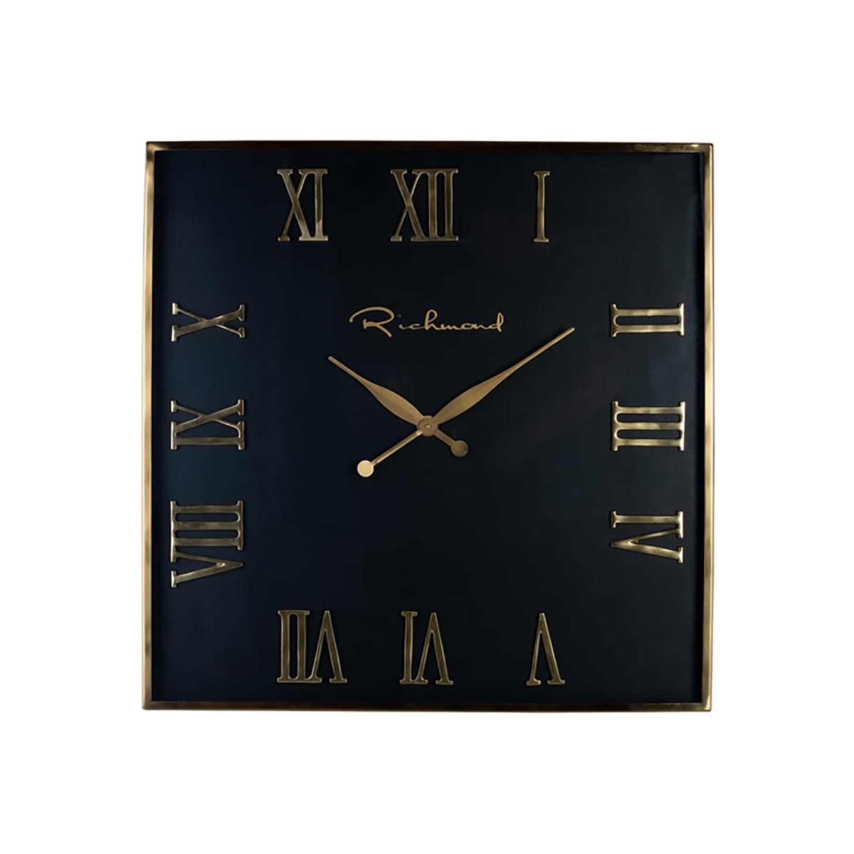 Add sophisticated functionality to your living space with the Derial Wall Clock from the Richmond design studio. An elegant spin on a timeless design, this beautifully different wall clock boasts an attractive square design that will look great on the wall. The Derial's outstanding presence is sure to draw the eye, her matte black face providing a stunning contrast against the beautifully golden Roman numerals and perfectly sculpted hands which adorn it. Measuring 76cm square and 5cm deep, this piece is so adaptable that it will pair perfectly well with almost any décor, adding a sense of sophistication along with precise practicality. Dimensions: H: 76 x W: 76 x D: 5 cm. Weight: 13.8kg Materials: Steel, Glass, Aluminium, Wood Assembly Required: No
