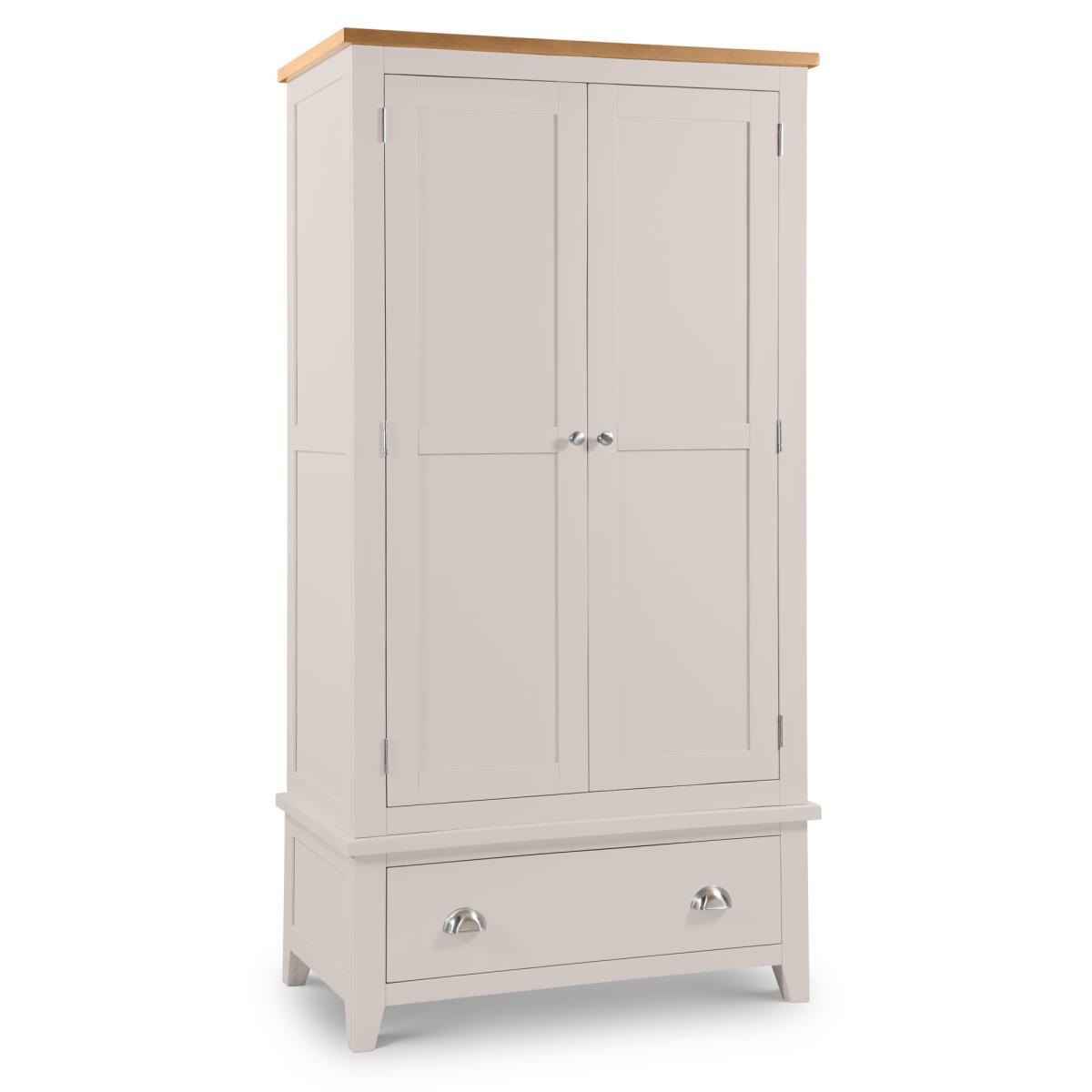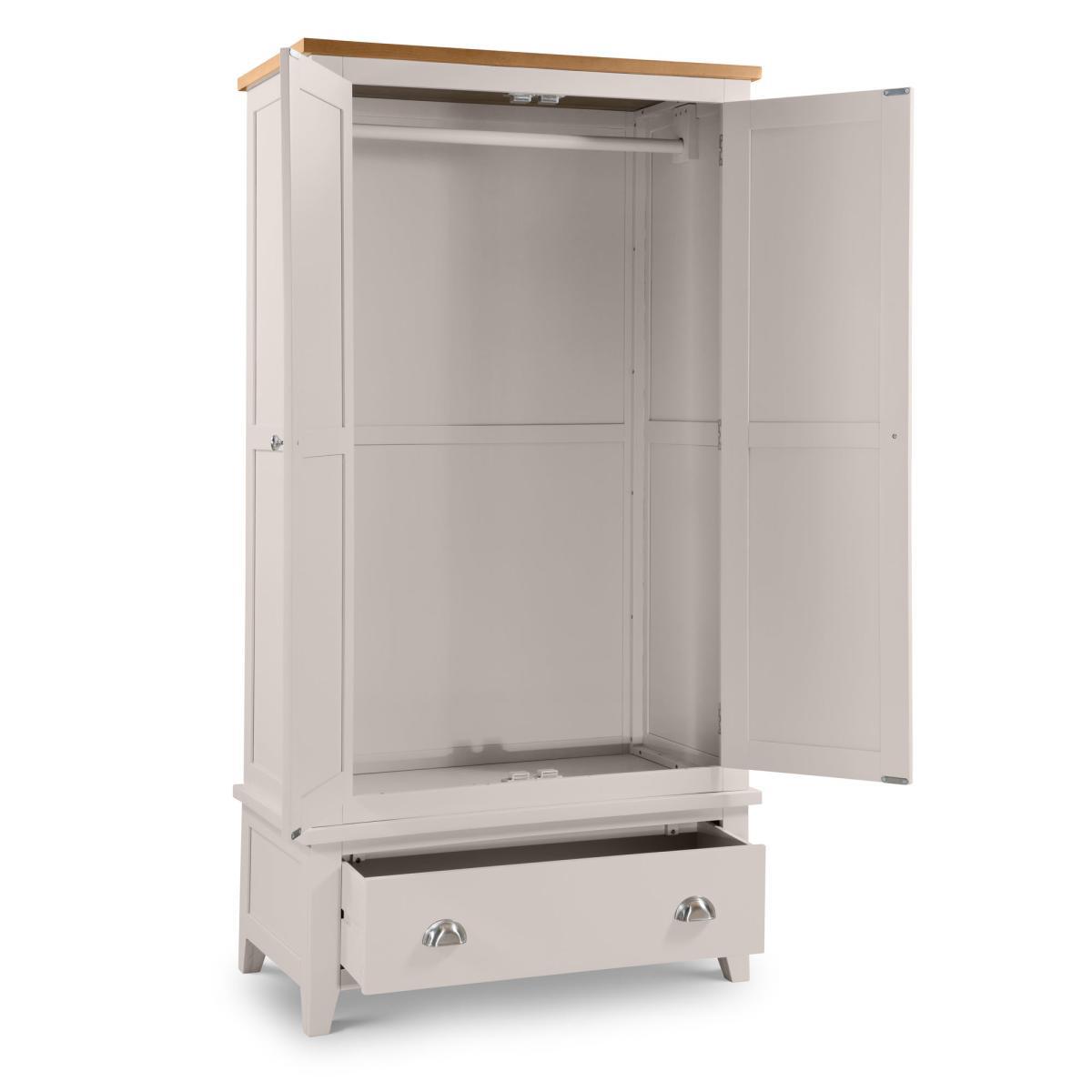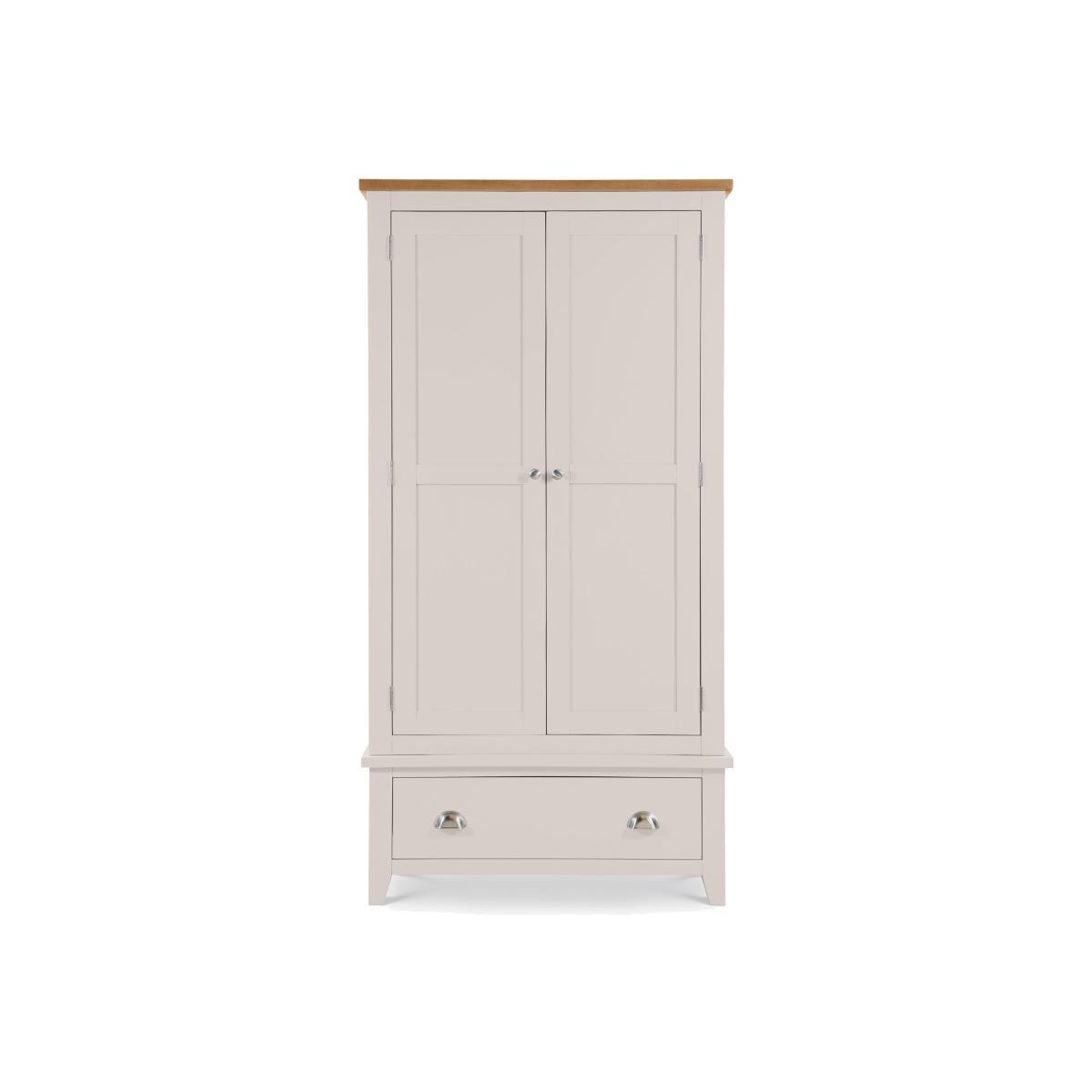 The stylish Richmond double wardrobe is presented in an immaculate painted, soft grey finish with a beautiful pale oak top, crafted from a combination of high-grade American oak and veneers. This cwardrobe provides ample storage space with its large hanging space, and the spacious signle drawer, accented with chic cupped handles in a brushed steel finish. The combination of superior quality materials and classic design ensures a timeless appeal and fits perfectly alongside both traditional and contemporary decor.