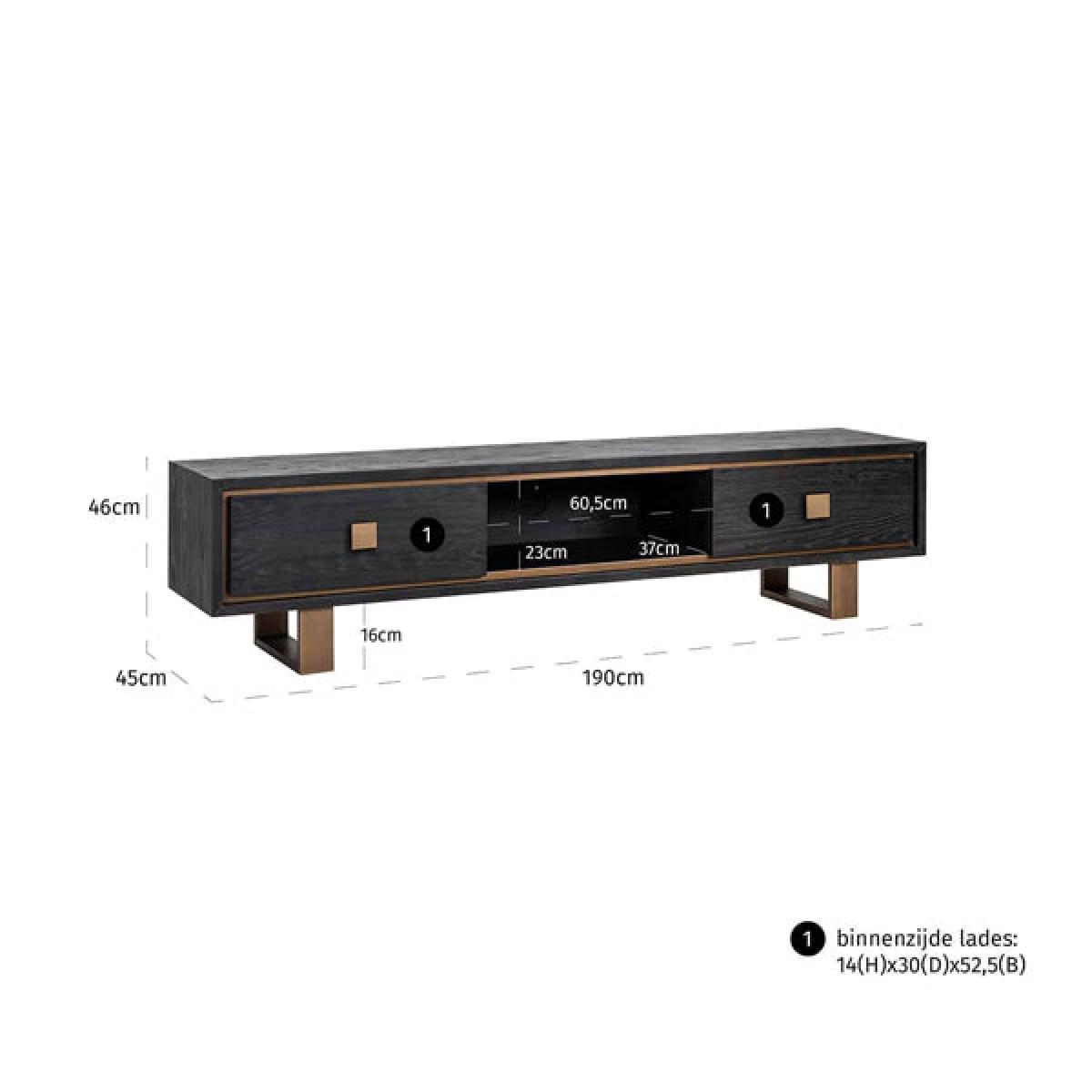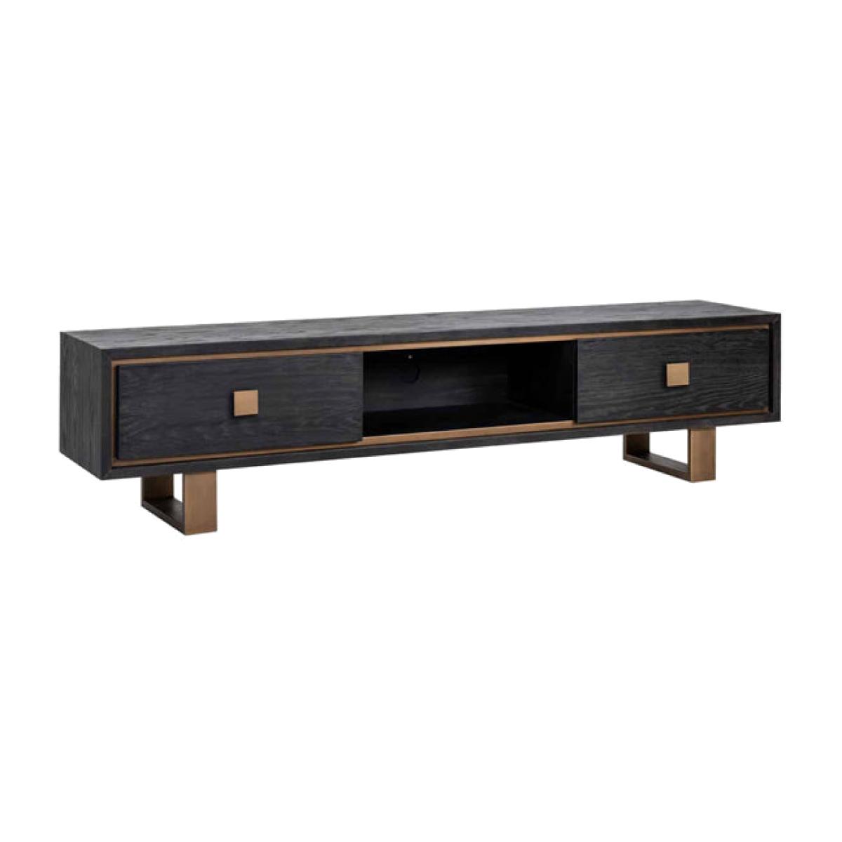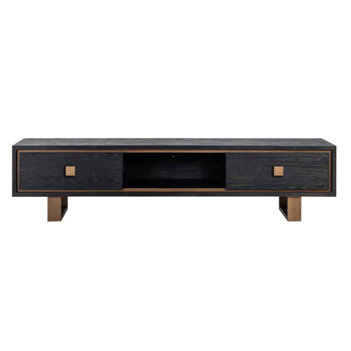 Create a beautifully modern and classic effect in your living area with the Richmond Hunter two-drawer black TV unit. This contemporary and elegant TV unit is the perfect addition to your home - imagine sitting back and relaxing on your sofa with your feet up and enjoying a good film on your TV on this stunning stand. The black oak Richmond Hunter TV unit, which has matt gold details and two black drawers for storage, stands at 46cm in height, 190cm wide, and 40cm from the wall. This versatile piece will particularly suit classic and simple décor in your home. Dimensions: H: 46 x W: 190 x D: 40 cm. Weight: 49kg Materials: Oak veneer, Metal Assembly Required: No