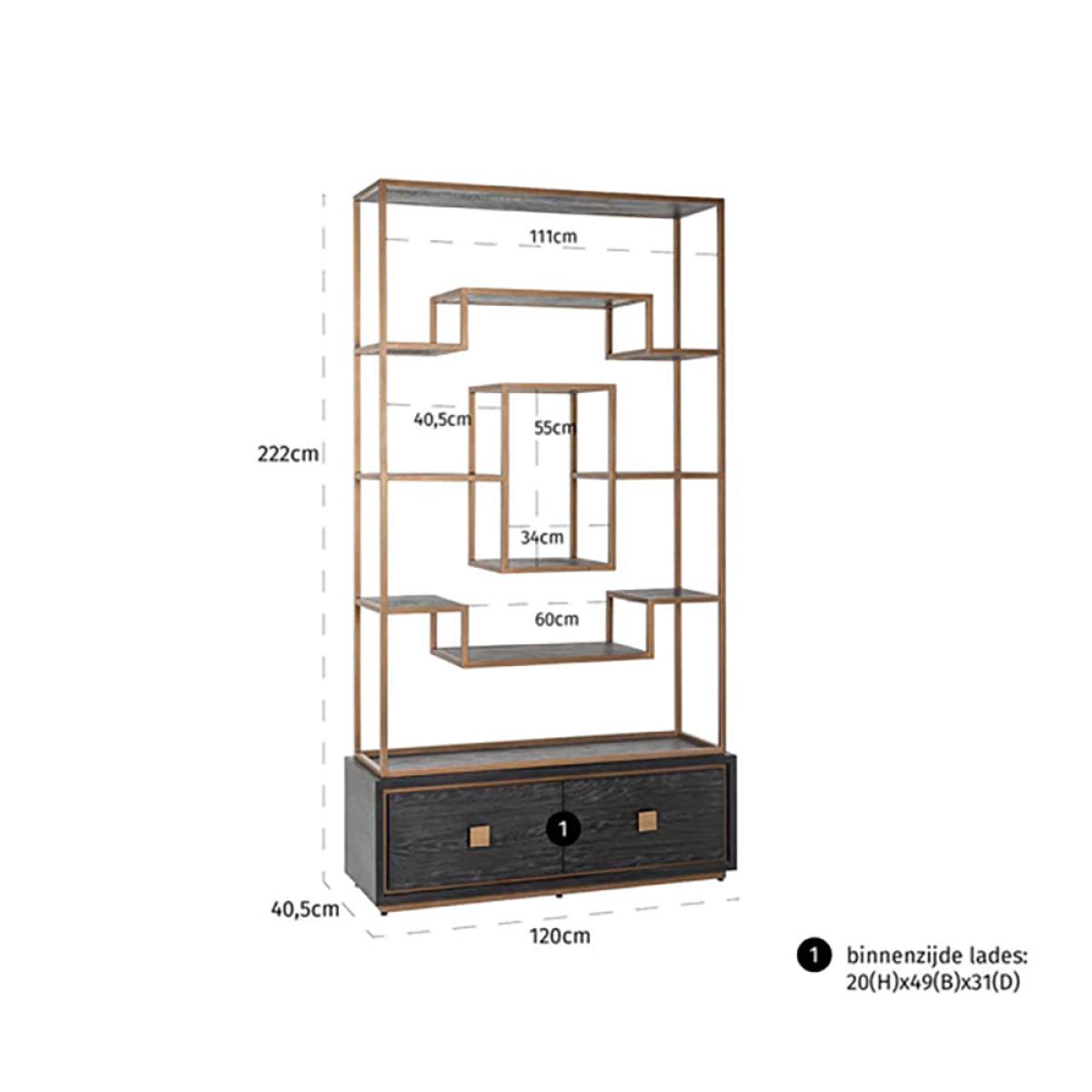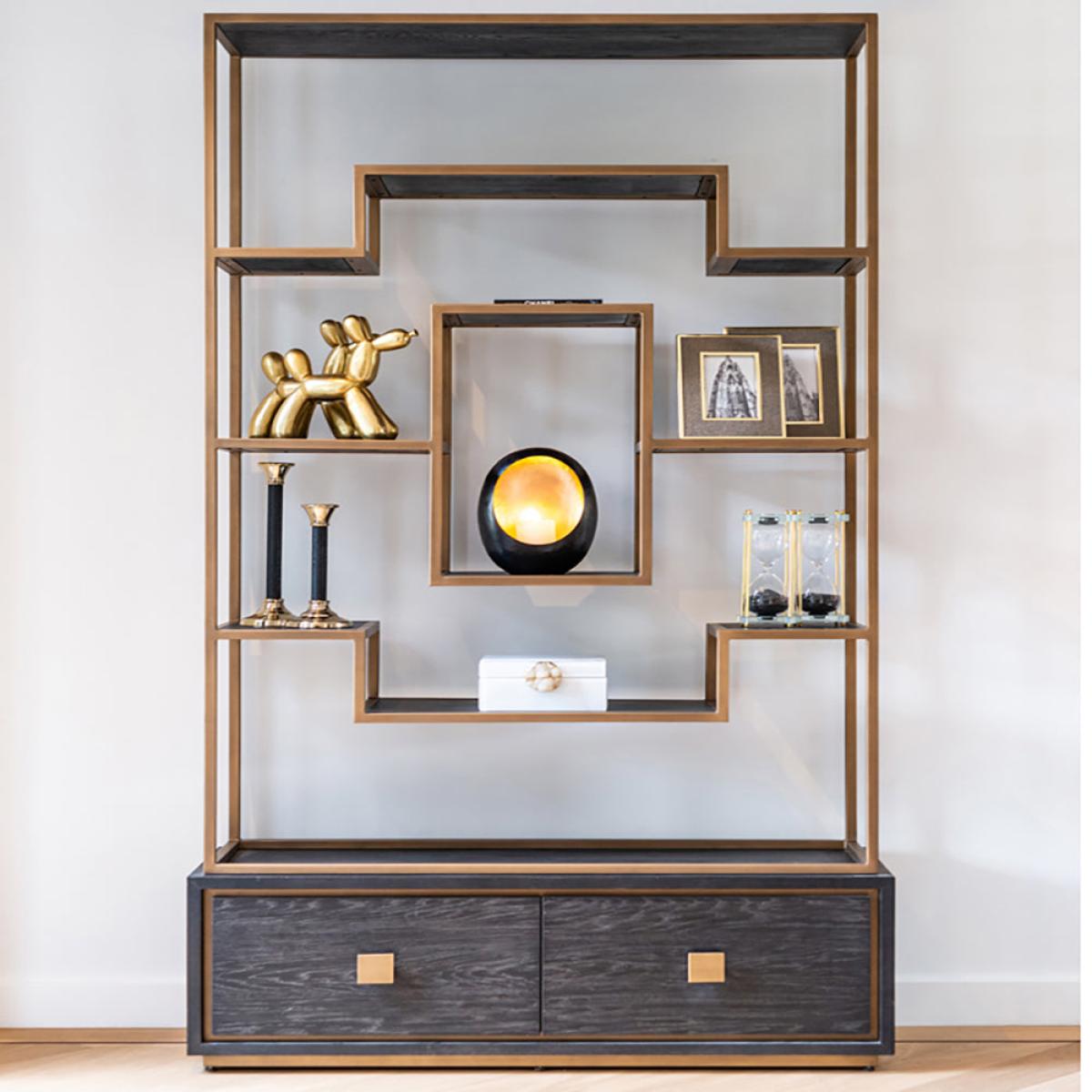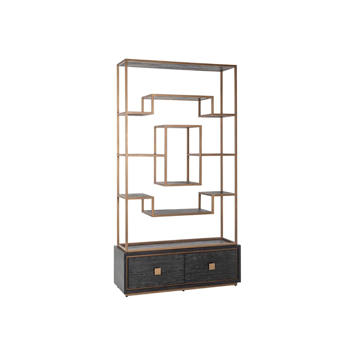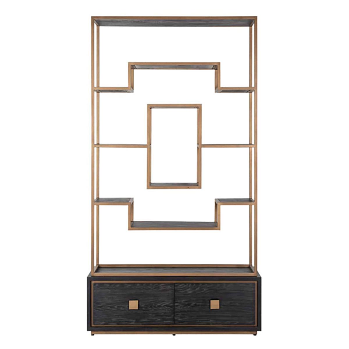 This modern cupboard has taken the traditional style of a shelving unit and given it a dynamic modern twist. It is a wonderful way to display your favourite accessories, photographs and flowers, so place this unit in your living room to appreciate its modern styling. This unit has a luxury feel too, with the black oak veneer and matt gold finish that will certainly bring a shine to your interior. There are two drawers at the base to store other items too. The Hunter two drawer brushed gold cabinet measures: H:222 x W:120 x D: 40.5 cm and weighs 91 kg. Dimensions: H: 222 x W: 120 x D: 40. 5 cm. Weight: 91kg Materials: Oak veneer, Metal Assembly Required: No
