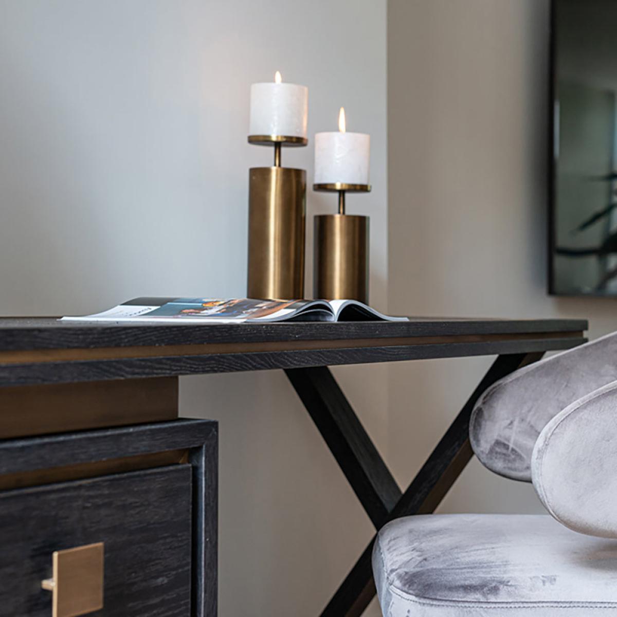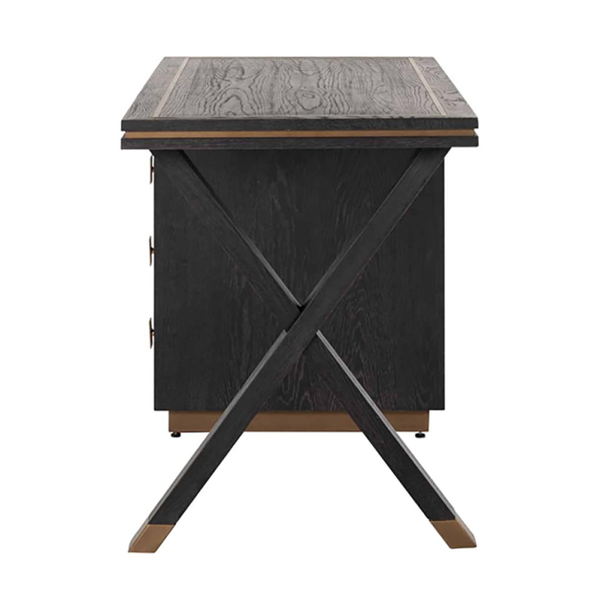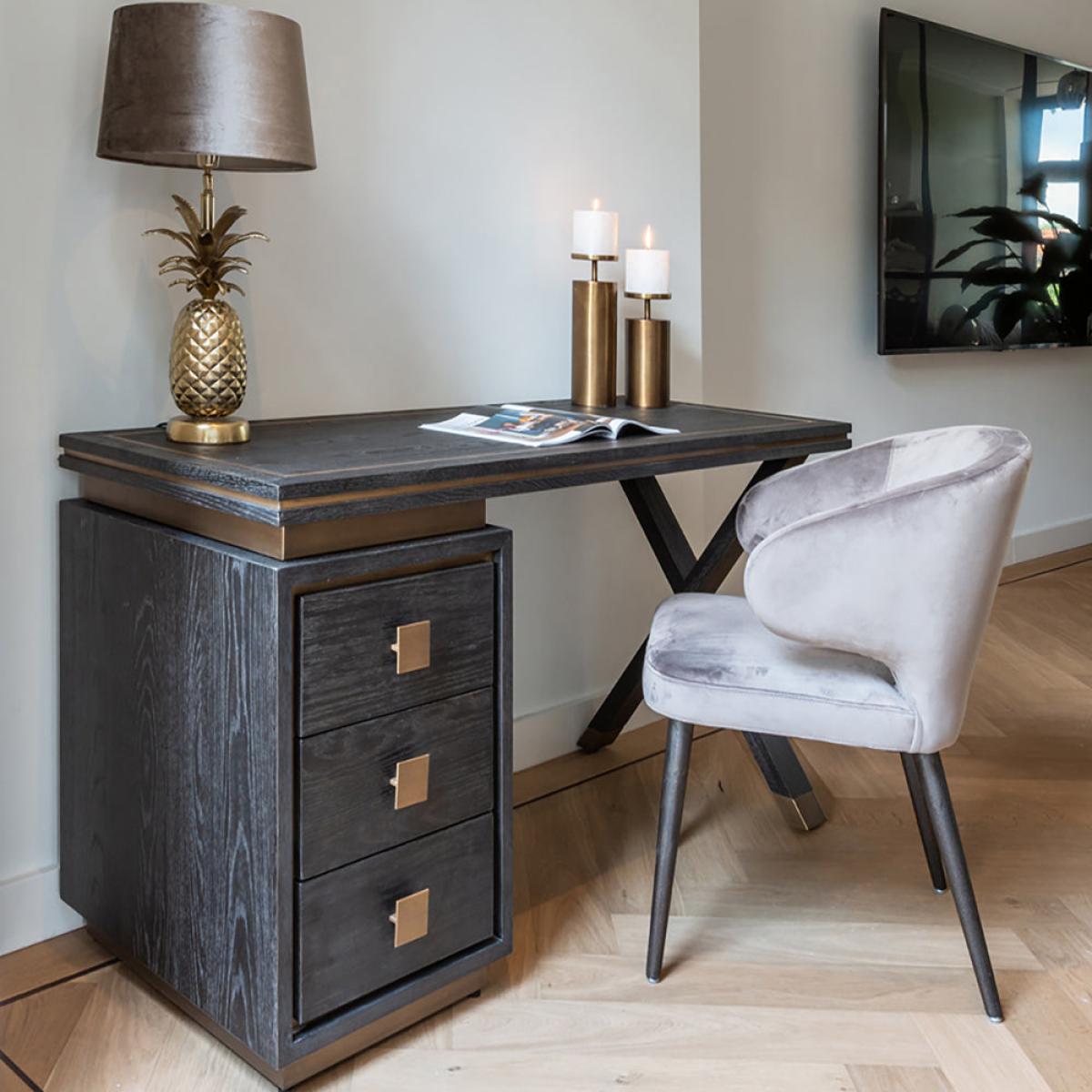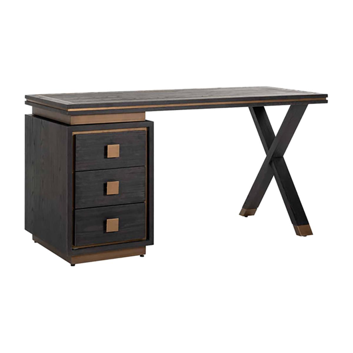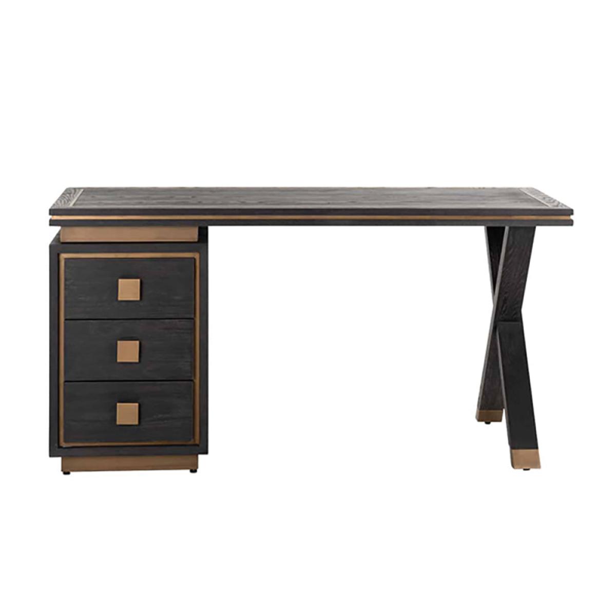 Organise your workspace with the Richmond Hunter three-drawer black desk. A stylish way to create a pleasing and productive environment, the Hunter desk features three generous drawers and an ample top to accommodate you as you work, making it perfect for tidying away paperwork, stationery and other office items. Finished in sophisticated textured black, the Hunter exudes style; in particular, its cross-shaped legs really set it apart as a piece that will complement any style of décor. With dimensions of 75cm high, 150cm wide and 60cm deep, the Hunter will make a fantastic addition to any home office or office space in your home. Dimensions: H: 75 x W: 150 x D: 60 cm. Weight: 80kg Materials: Metal, Oak veneer Assembly Required: Yes