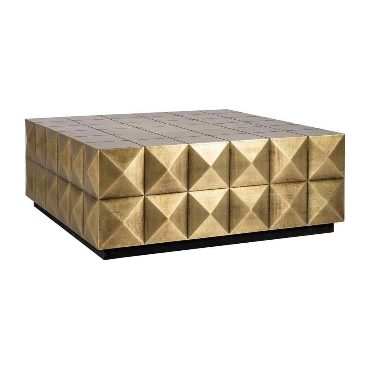 I love this coffee table for its bold, statement-making design and luxurious brushed gold finish. It works particularly well in contemporary or modern interiors, adding a touch of glamour without feeling overly formal. The geometric faceting on the sides creates visual interest, making it a focal point even when styled minimally. Practical tips include balancing its shiny finish with soft, textured accessories like plush throws or natural wood elements to prevent it from feeling too metallic. It's also versatile enough to work in eclectic or luxe interiors, where it can be styled with a mix of artwork, vases, or even as a platform for sculpture-making it quite a stylish yet functional addition for any living space.