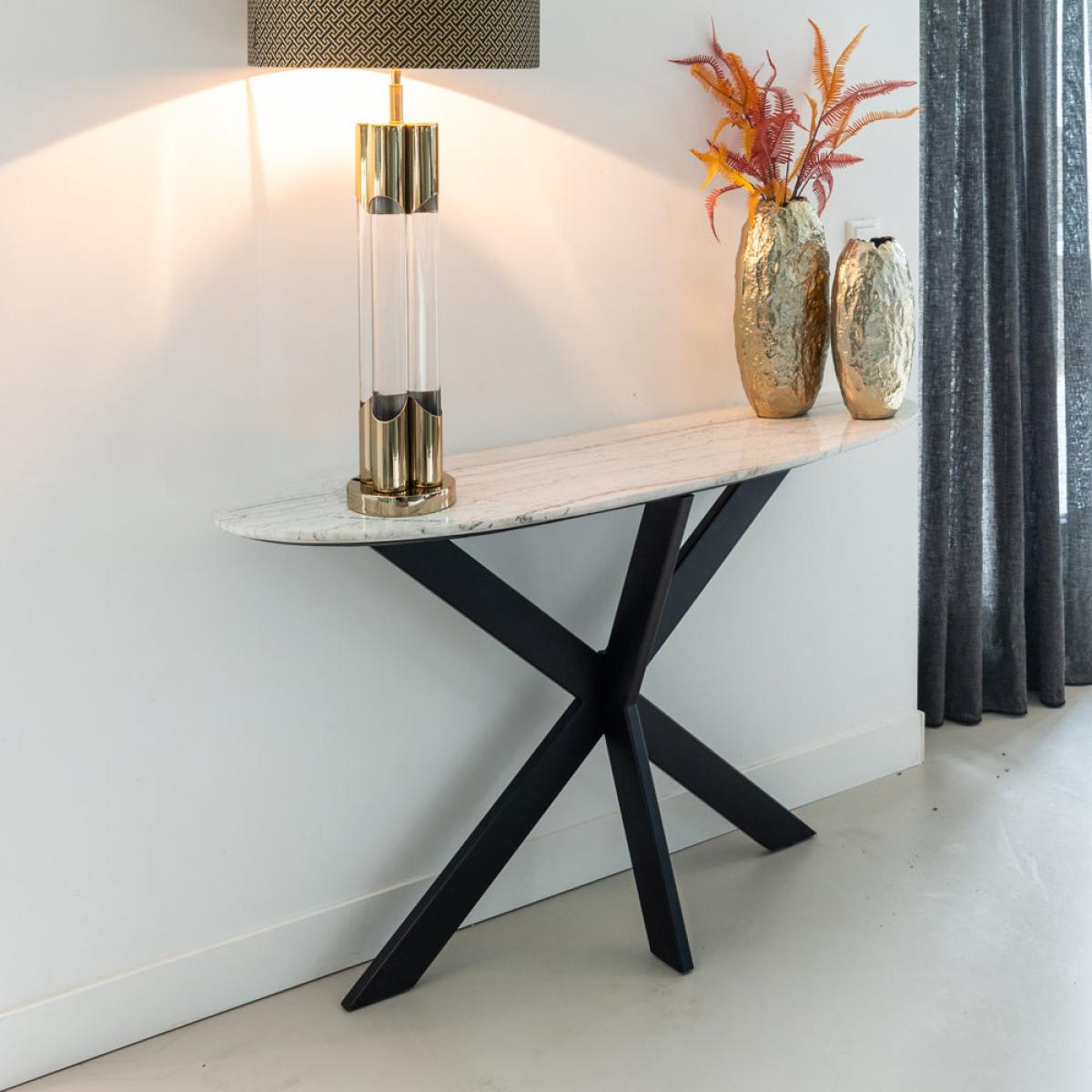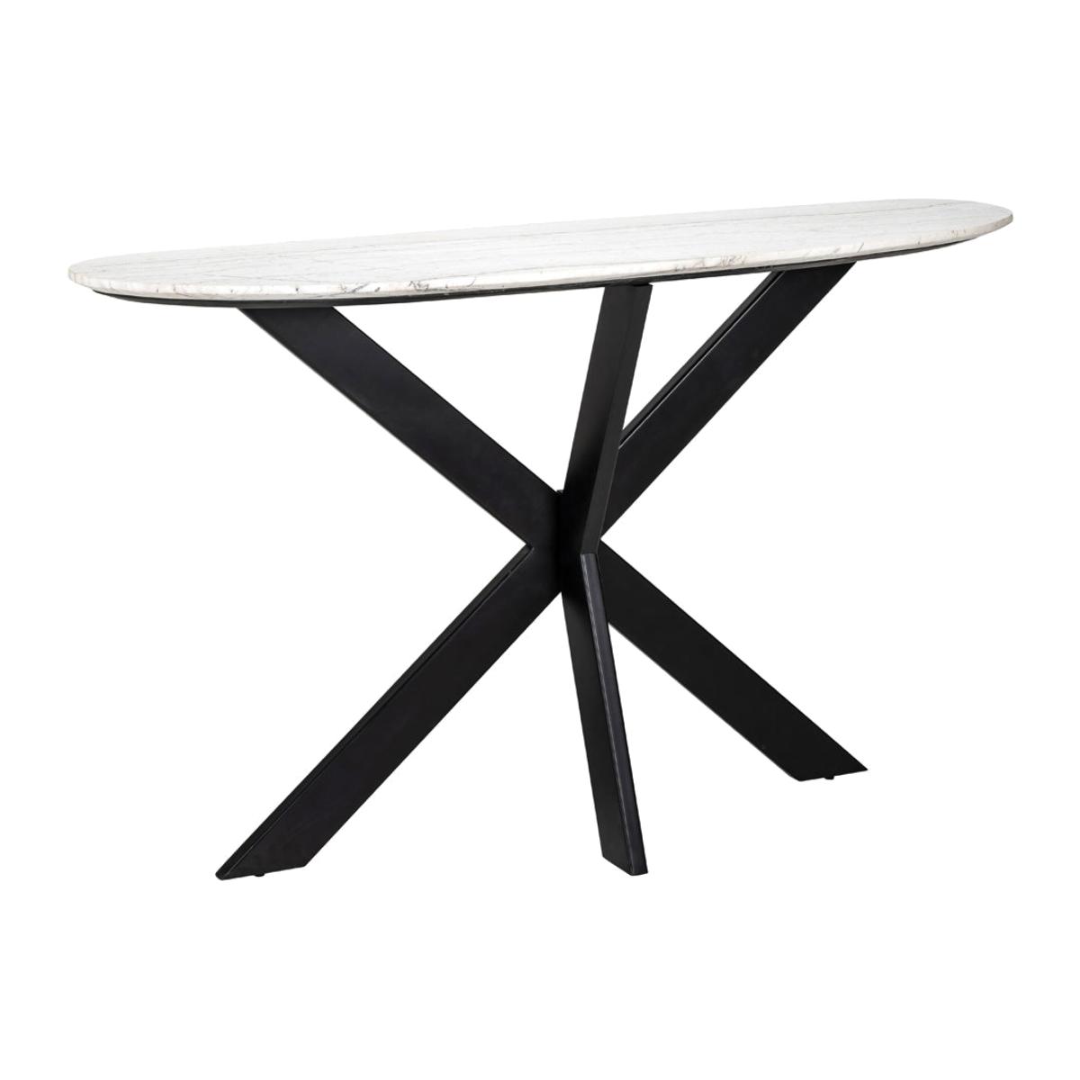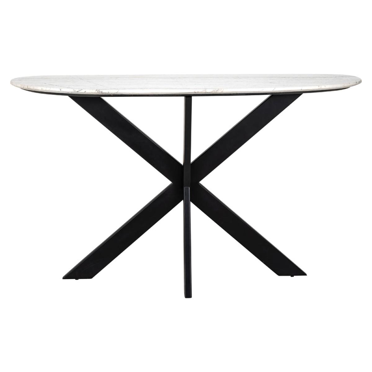 Introducing the Trocadero Console Table - White by Richmond Interiors, a stunning addition to your home decor. Crafted with elegance and sophistication in mind, this console table features a sleek white marble top that contrasts beautifully with black accents. The combination of marble, plywood, and iron creates a striking visual appeal, while the compact design makes it perfect for smaller spaces. Whether placed in your entryway, living room, or hallway, the Trocadero Console Table adds a touch of modern flair to any room. Elevate your interior decor with the Trocadero Console Table - White and make a statement