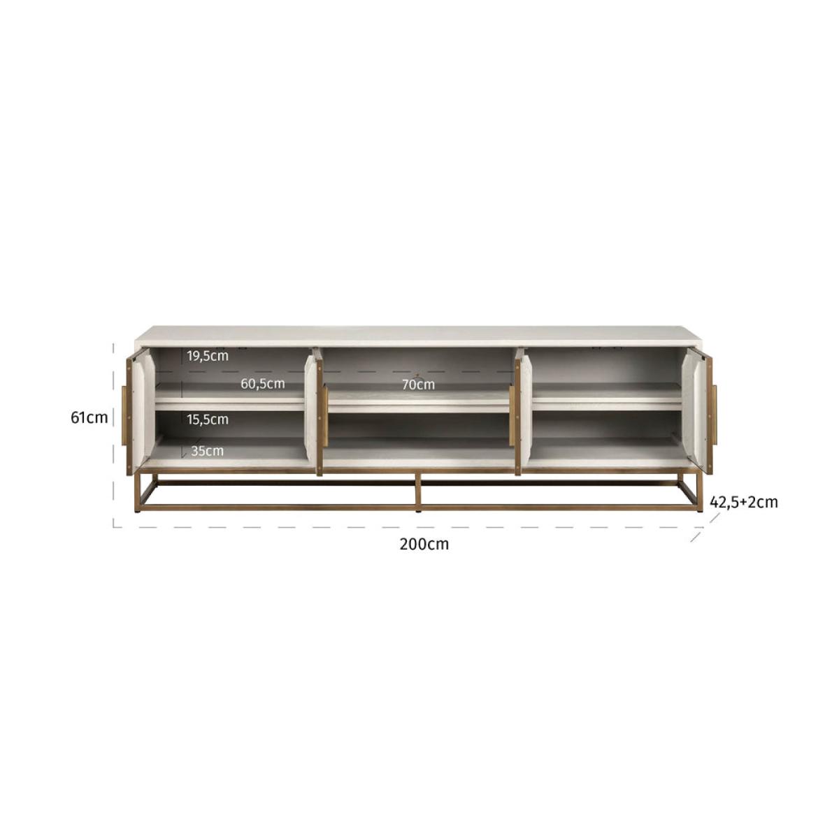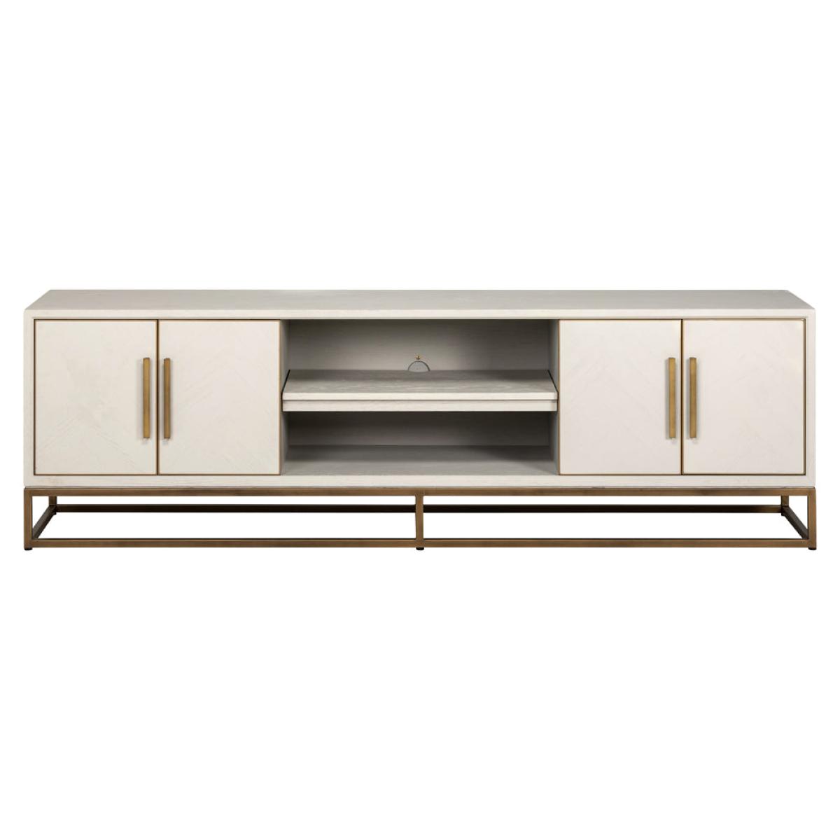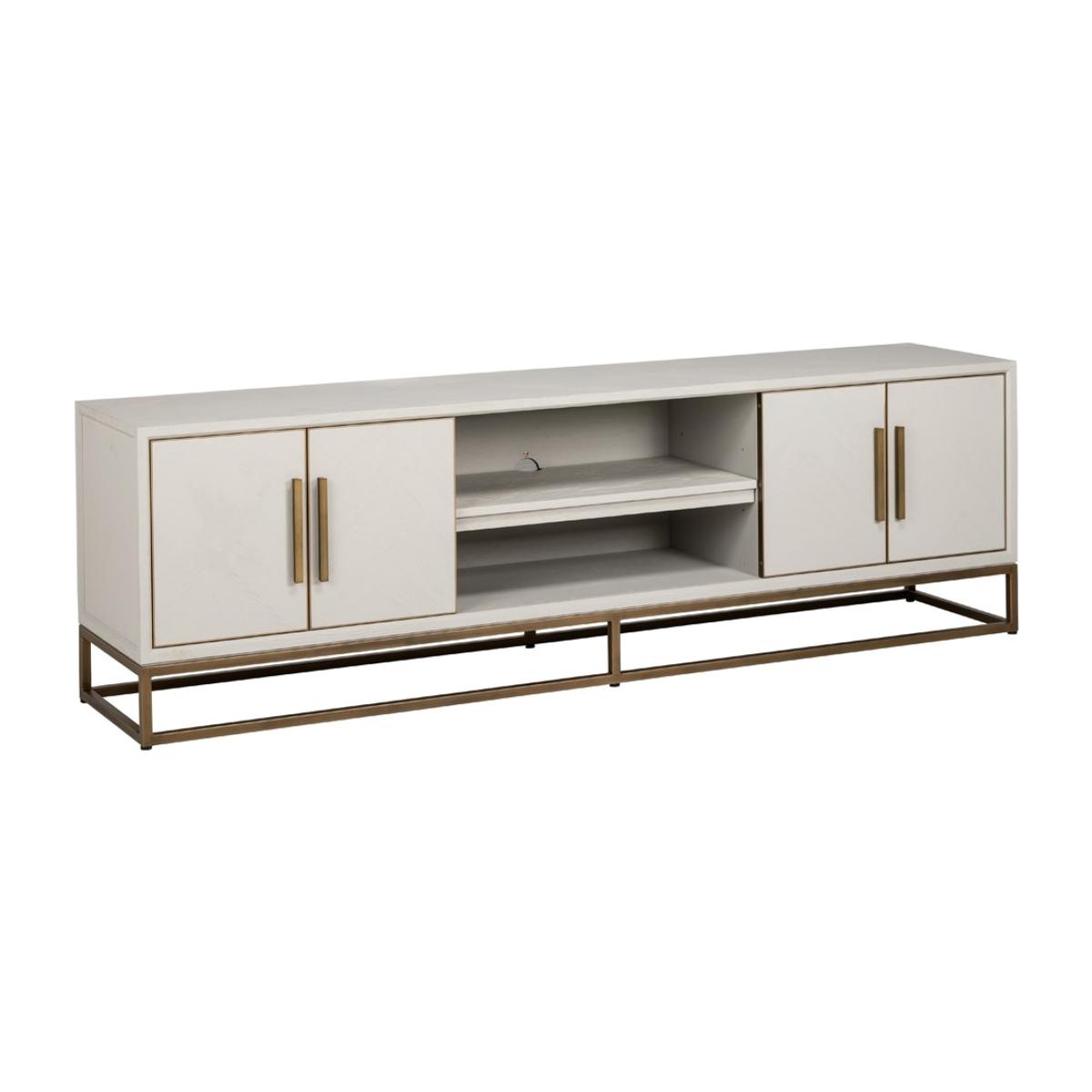 Introducing the Richmond Interiors Whitebone 4 Door TV Unit, a stylish and functional addition to your indoor entertainment space. Crafted from high-quality oak veneer and iron in a sophisticated grey finish, it exudes durability and style. The brass accents add a touch of luxury, elevating the overall look of the piece. Whether used to display your television or to organize your media devices, the Whitebone TV Unit combines form and function seamlessly. Bring home the Whitebone TV Unit to create a focal point in your space and enjoy its practicality and elegance for years to come.