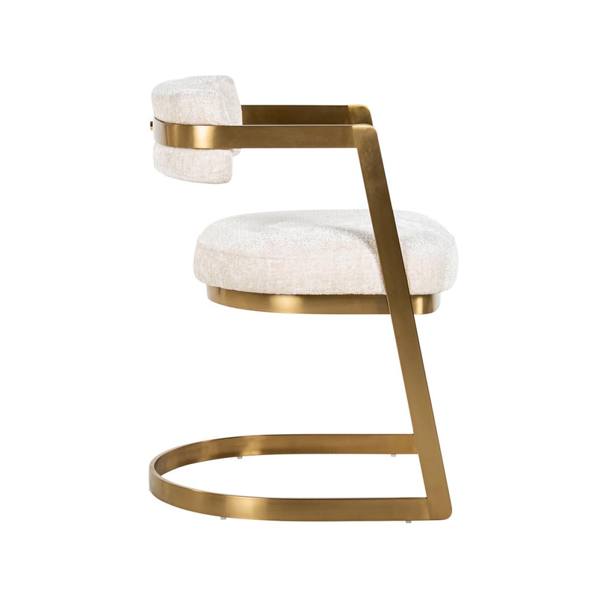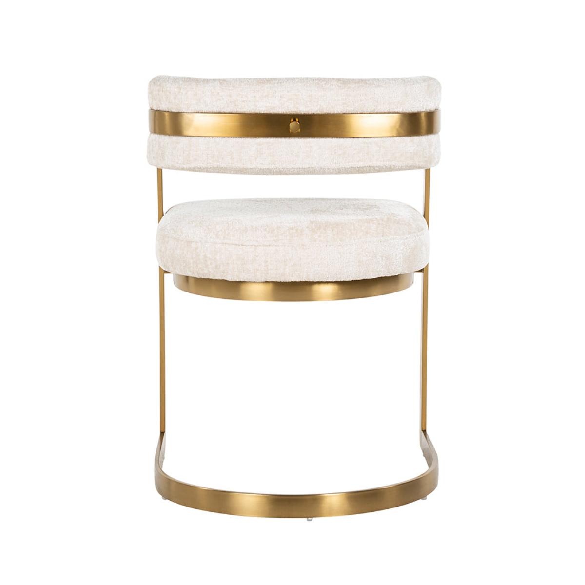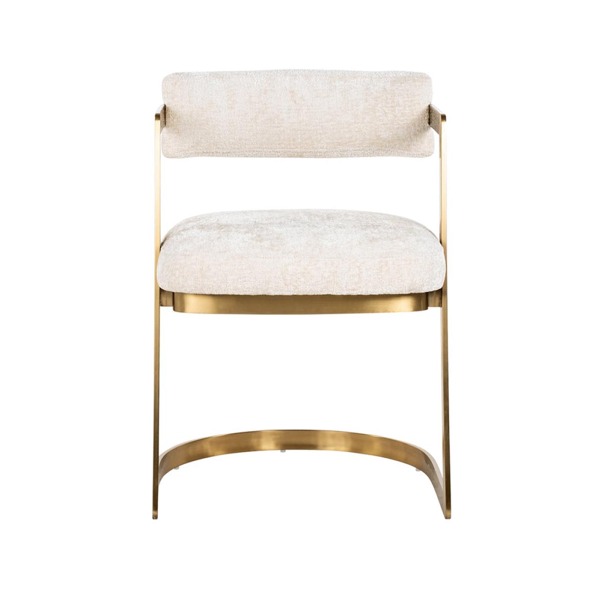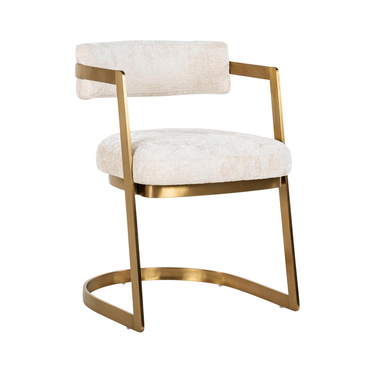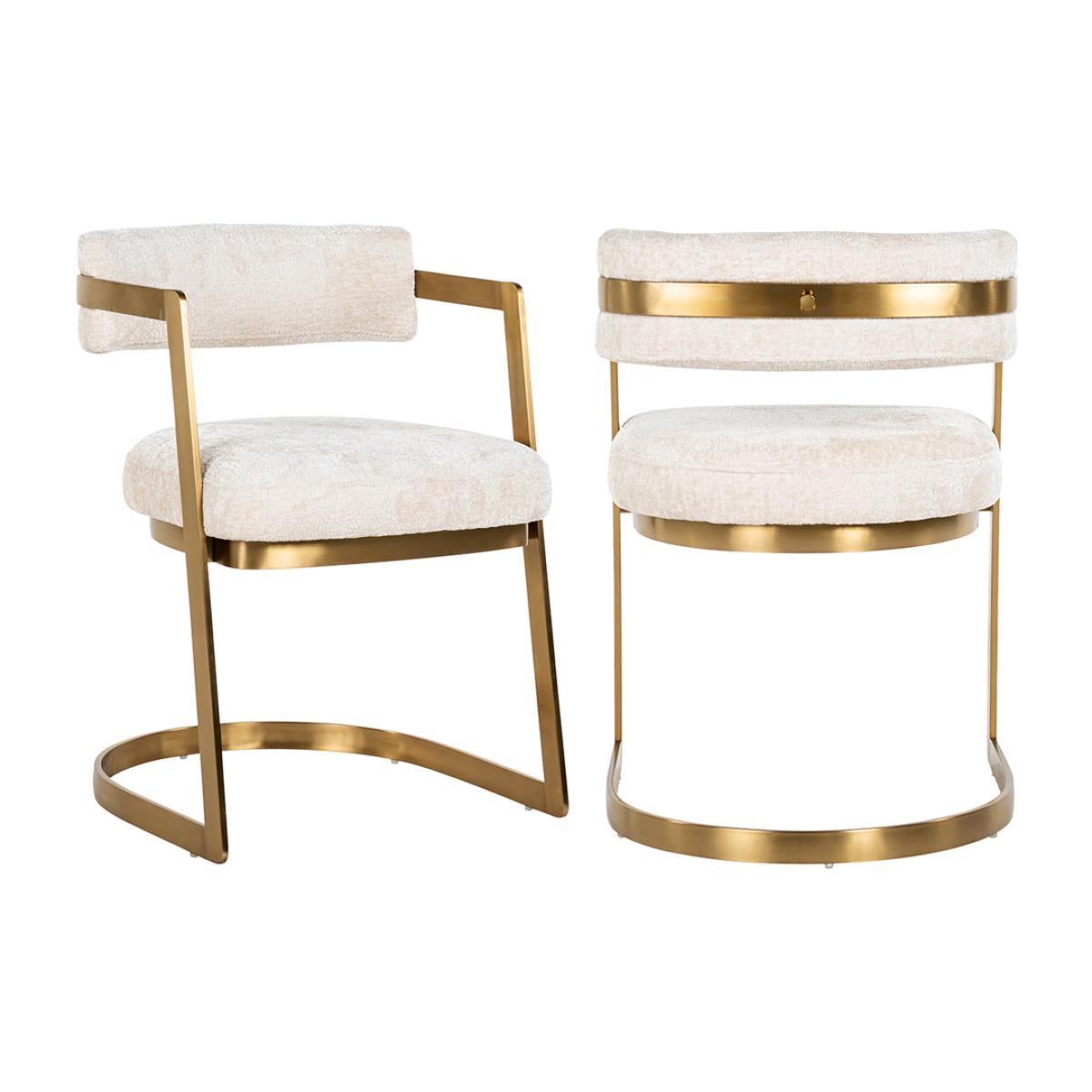 With its clean lines and eye-catching curves, the Jordan Chair exudes pure sophistication and elegance. The chair’s sleek metal frame has a stylish brushed gold finish with a curved backrest and ba. View More. With its clean lines and eye-catching curves, the Jordan Chair exudes pure sophistication and elegance. The chair’s sleek metal frame has a stylish brushed gold finish with a curved backrest and base. The well-padded backrest and seat are upholstered in a textured white chenille fabric, which contrasts beautifully with the brushed gold to create an inviting, glamorous and thoroughly modern feel. The Jordan Chair, by Richmond Interiors, is a perfect addition to the dining room of a modern home but can also be used as an accent chair in a study, lounge or bedroom. The chair is 76. 5cm tall, 51cm wide and 57. 5cm deep.