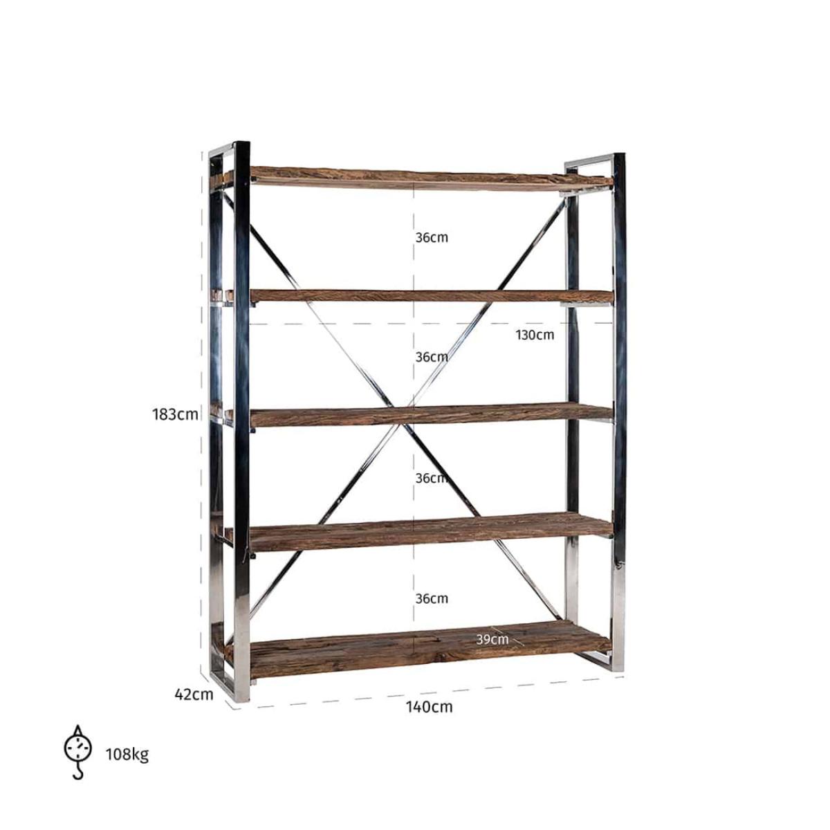 If you're looking for a stylish and versatile bookcase to keep your books and other household items organized, look no further. With its sleek and modern design, this bookcase is a perfect fit for any room in your home, whether it's your living room, bedroom or home office. Dimensions:W:140 x H:183 x D:42cm Materials: Top: Recycled Wood | Legs:Stainless Steel Assembly Required: No Care Instructions:Wipe clean with soft damp cloth