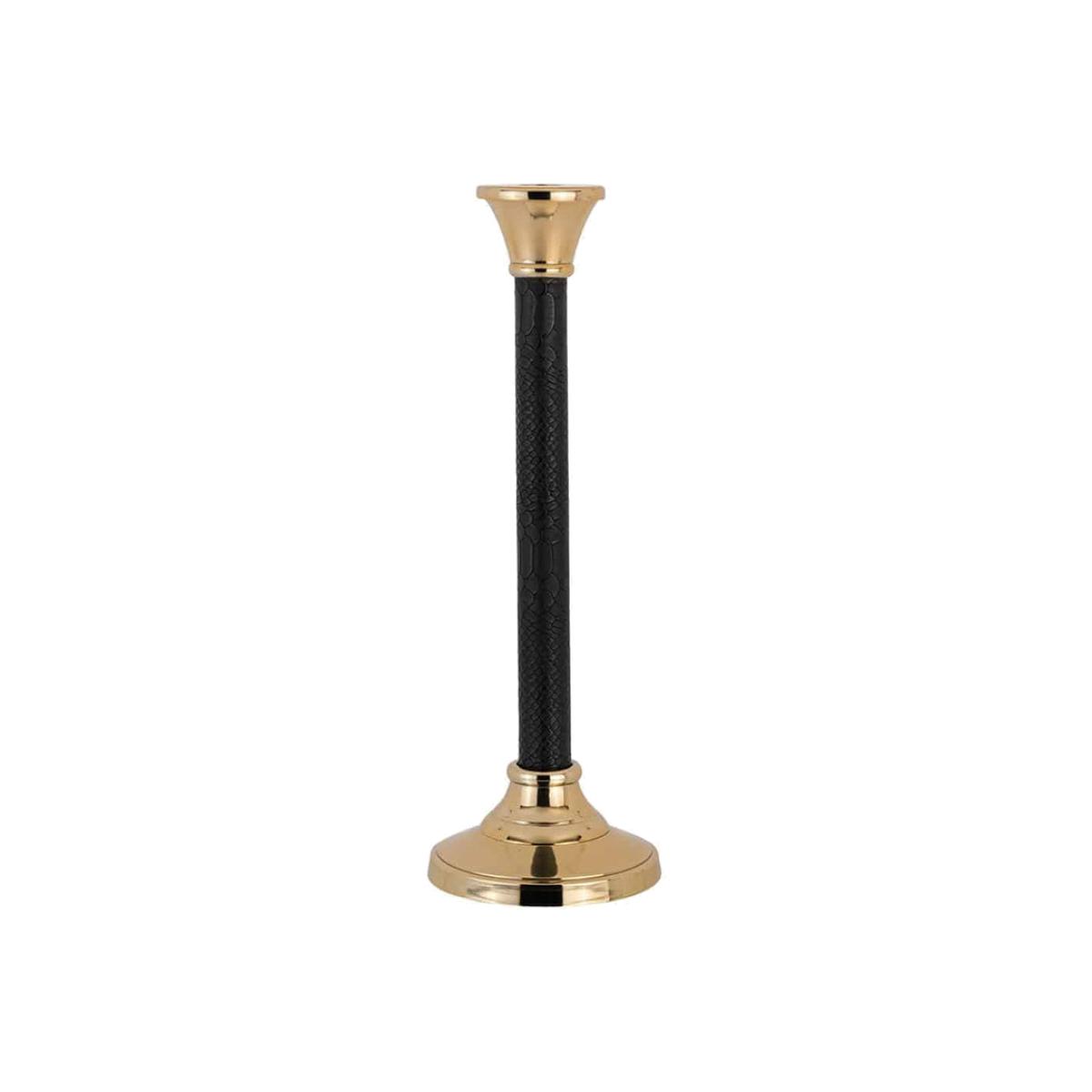 This Richmond Niles candle holder has a classic design with a hint of glamour. Finished with an opulent gold-coloured base and trim, the embossed faux leather black stem features a subtle but timeless snakeskin design that gives the piece a deluxe and quality feel. Pair this holder with a candle in either metallic or black shades to match; alternatively, create a striking contrast against fresh white wax. This lavishly designed candle holder is luxurious with a slightly masculine feel. Measuring 35cm high and 12cm in diameter, this Richmond Niles candle holder is great as a standalone statement accessory or perfect as a pair. Dimensions: H: 35 x W: 12 x D: 12 cm Materials: Aluminium, Pu Leather Assembly Required: No Care Instructions:Wipe with a clean, dry cloth