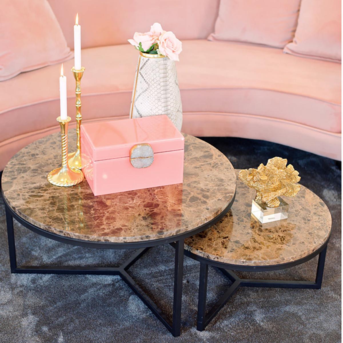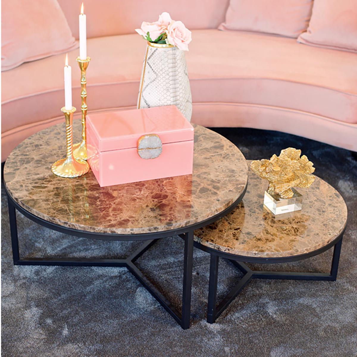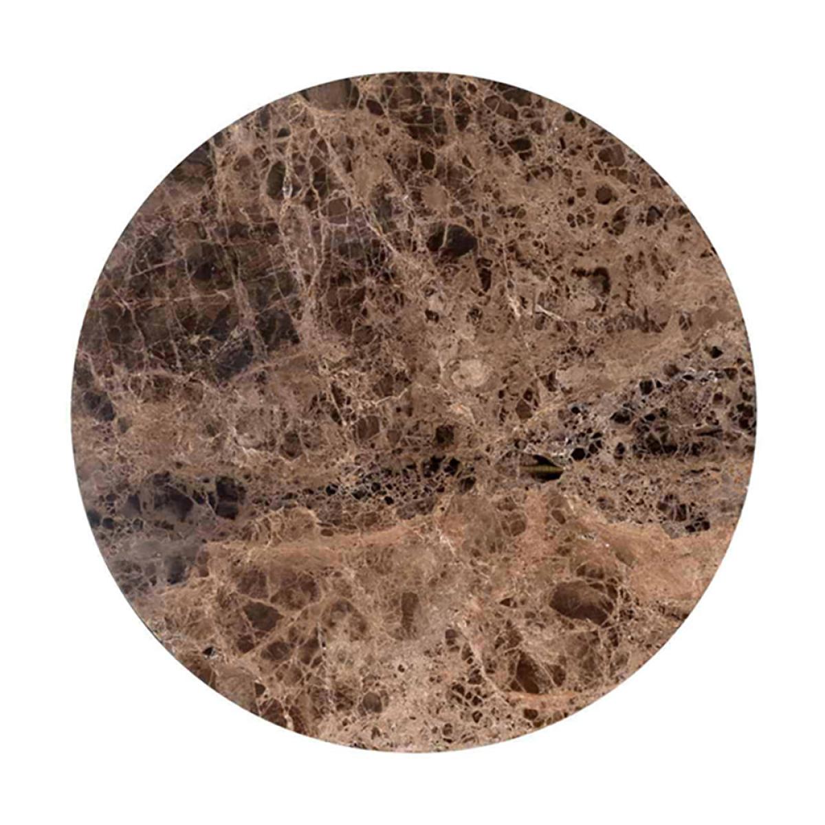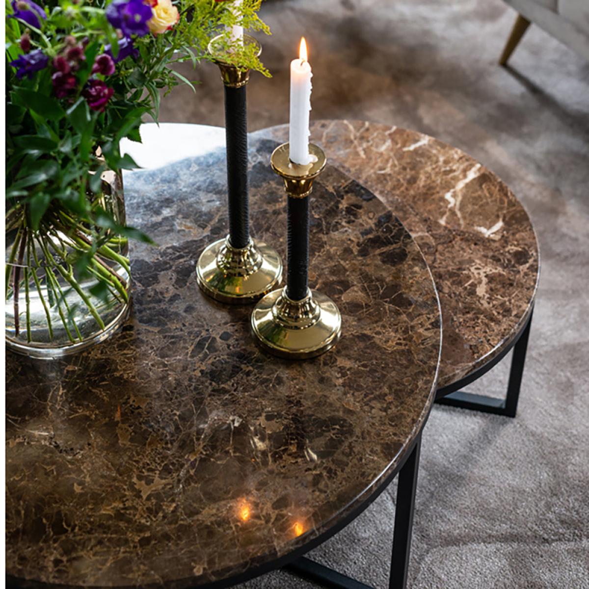 Add a touch of luxury to your home, when you place this round, brown marble coffee table in your living area. The Richmond Orion Brown Coffee Table comes in two different sizes to best suit your sp. View More. Add a touch of luxury to your home, when you place this round, brown marble coffee table in your living area. The Richmond Orion Brown Coffee Table comes in two different sizes to best suit your space. The design of this beautiful coffee table on its metal legs has a gorgeous brown marble tabletop made from Marble Emparador, which will work well in an elegant style living area, study, foyer, or conservatory. Standing at 30cm high and 60cm wide, or 40cm high and 80cm wide, this is the perfect centrepiece. Add a vase with flowers, candles, and coasters to enjoy your space. This product is made from marble which is a natural stone. The beauty of natural materials is that they have an authentic and unique finish which may result in slight variation in the vein, pattern and colour from the image shown.