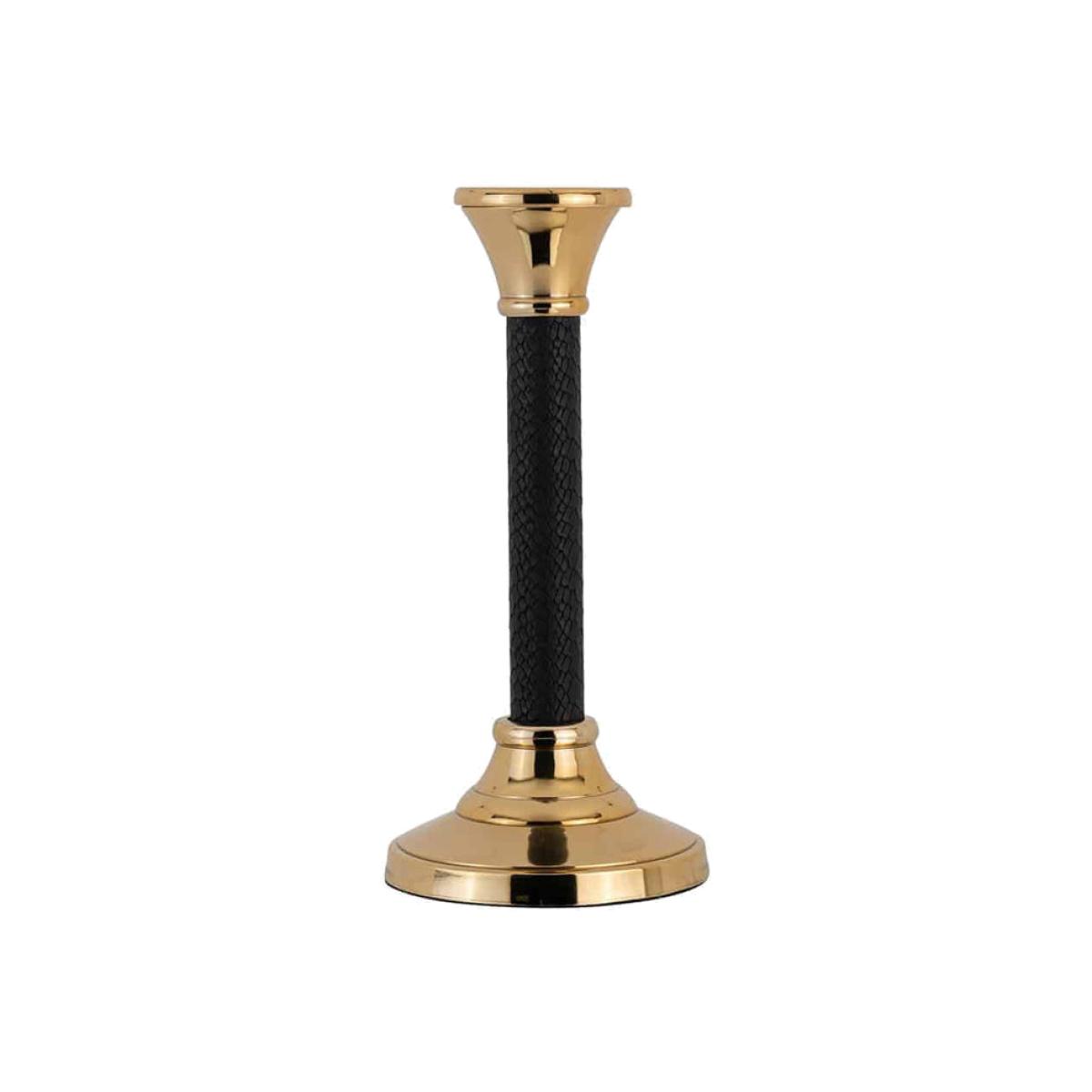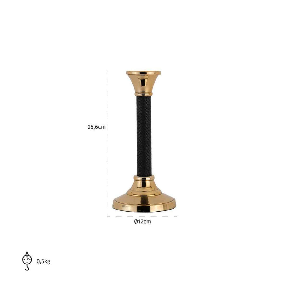 Stylish black leather adds a touch of glamour to this stunning candle holder. The black leather effect on the body of this candle holder contrasts beautifully with the shiny gold aluminium at its top and its base. The leather body of the Richmond small Orvil candle holder also works to bring texture and character to this decorative piece. A great addition to a table, shelf or mantel, the timeless combination of gold and black means this candlestick-shaped holder can work well within many different home décor styles, including classic or contemporary. The Orvil candle holder is 25.5cm tall, 12cm wide and 12cm in depth. Dimensions: H: 25.5 x W: 12 x D: 12 cm Materials: Aluminium, Pu Leather Assembly Required: No Care Instructions:Wipe with a clean, dry cloth