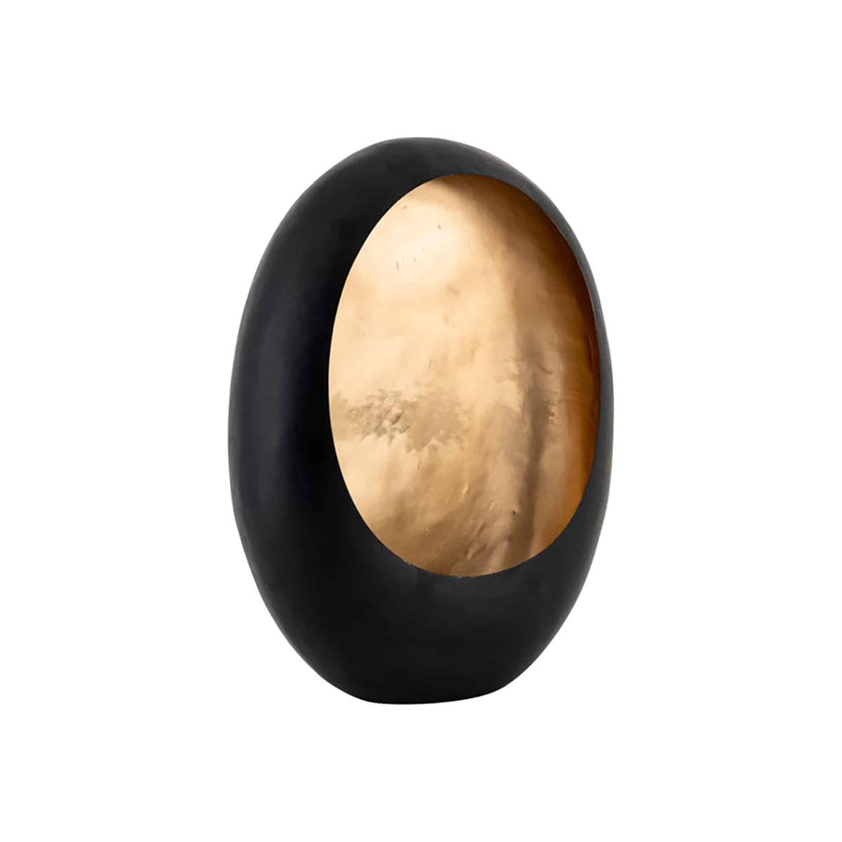 You'd be forgiven for not recognising that the Richmond Roann black with gold candle holder is a candle holder at first glance. It might be perceived as some kind of strange ancient dinosaur egg instead. This quirky piece is full of character and will add a distinctive style to your home. The candlestick itself is black and chic, perfect for a contemporary setting, then the golden centre adds a warm, bright contrast. Rounded edges add welcoming softness. Combine with a Reen black with gold small for a perfect blend of style and sophistication. Dimensions: 45cm x 35cm x 15cm. Weight: 2.1kg. Dimensions: H: 45 x W: 35 x D: 15 cm. Weight: 2.1kg. Material:Iron Assembly Required: No