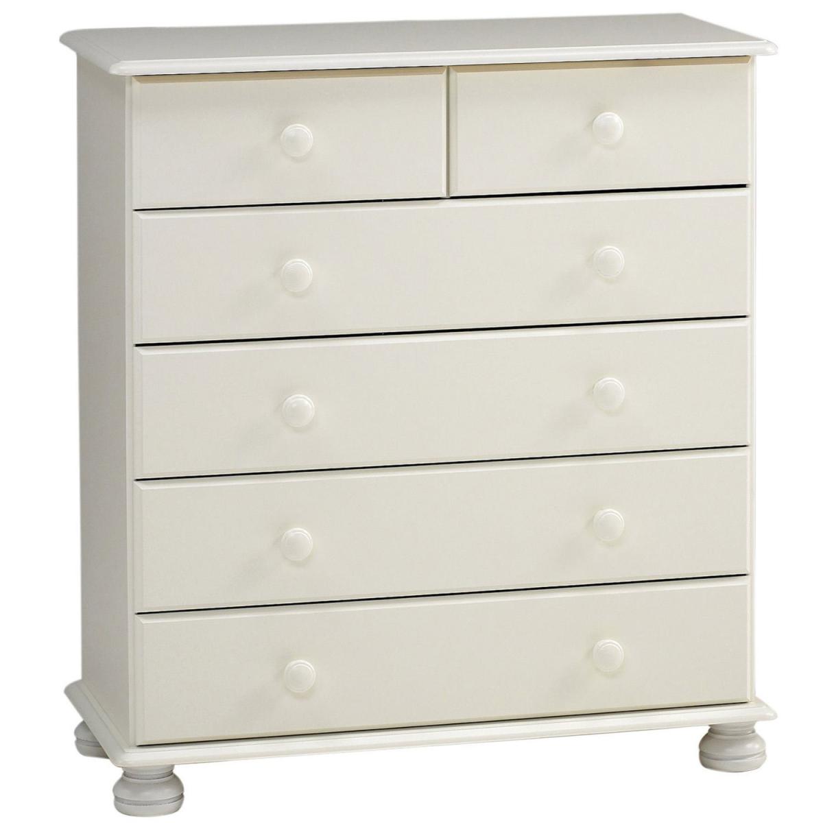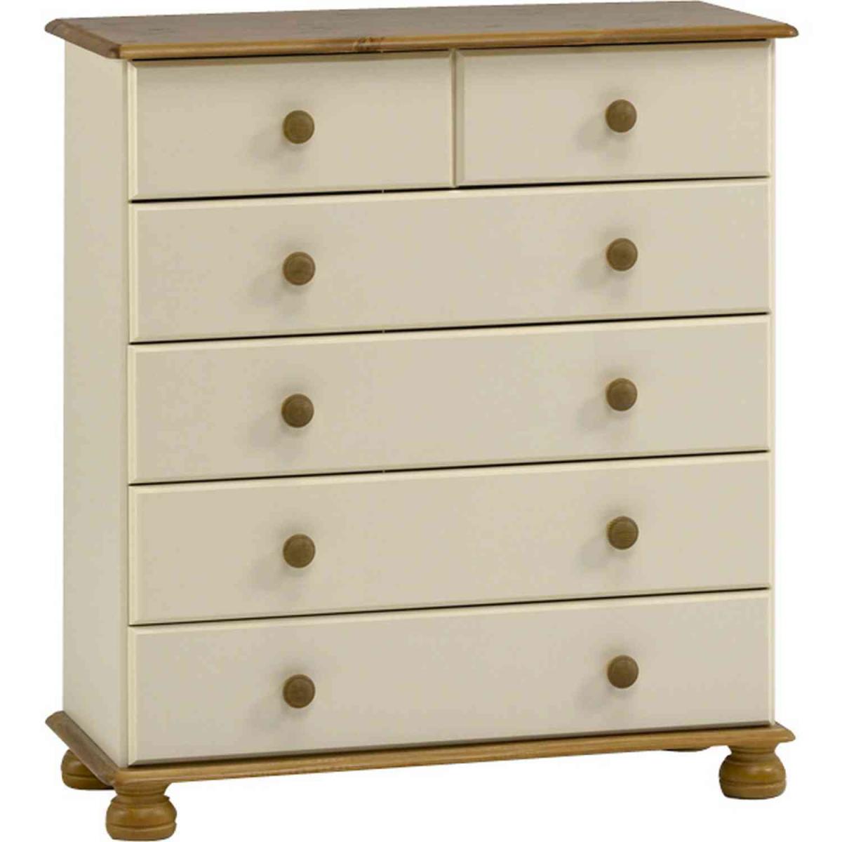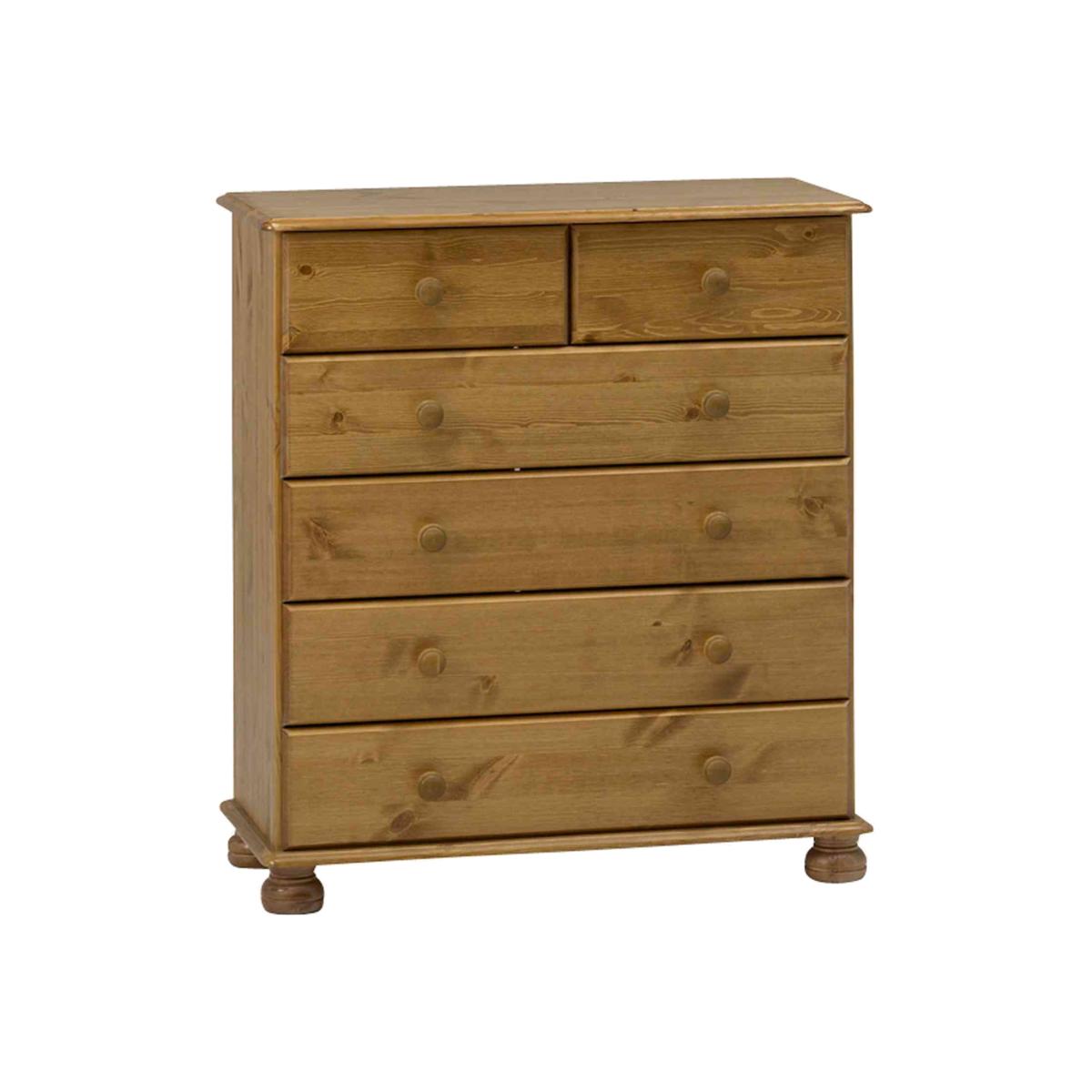 The perfect storage solution for all your treasured items, this wonderful Richmond Six Drawer Chest is formed of a solid pine wood with beautiful ornate feet. The sturdy frame is complete with six spacious drawers of varying sizes, four larger and two smaller. Each drawer is adorned with traditional handles for easy access and a smooth opening, whilst its flat top surface is great for displaying decorative ornaments, floral bouquets or your favourite photo memories. Ideal for the bedroom, study or living room, the stylish yet practical drawers allow you to organise and store all your goods, from clothes and stationery to crafts and cosmetics. In addition, the elegant natural shade will complement a whole array of existing home decors whilst adding a touch of charm to your living area.