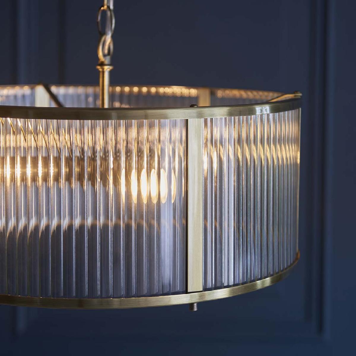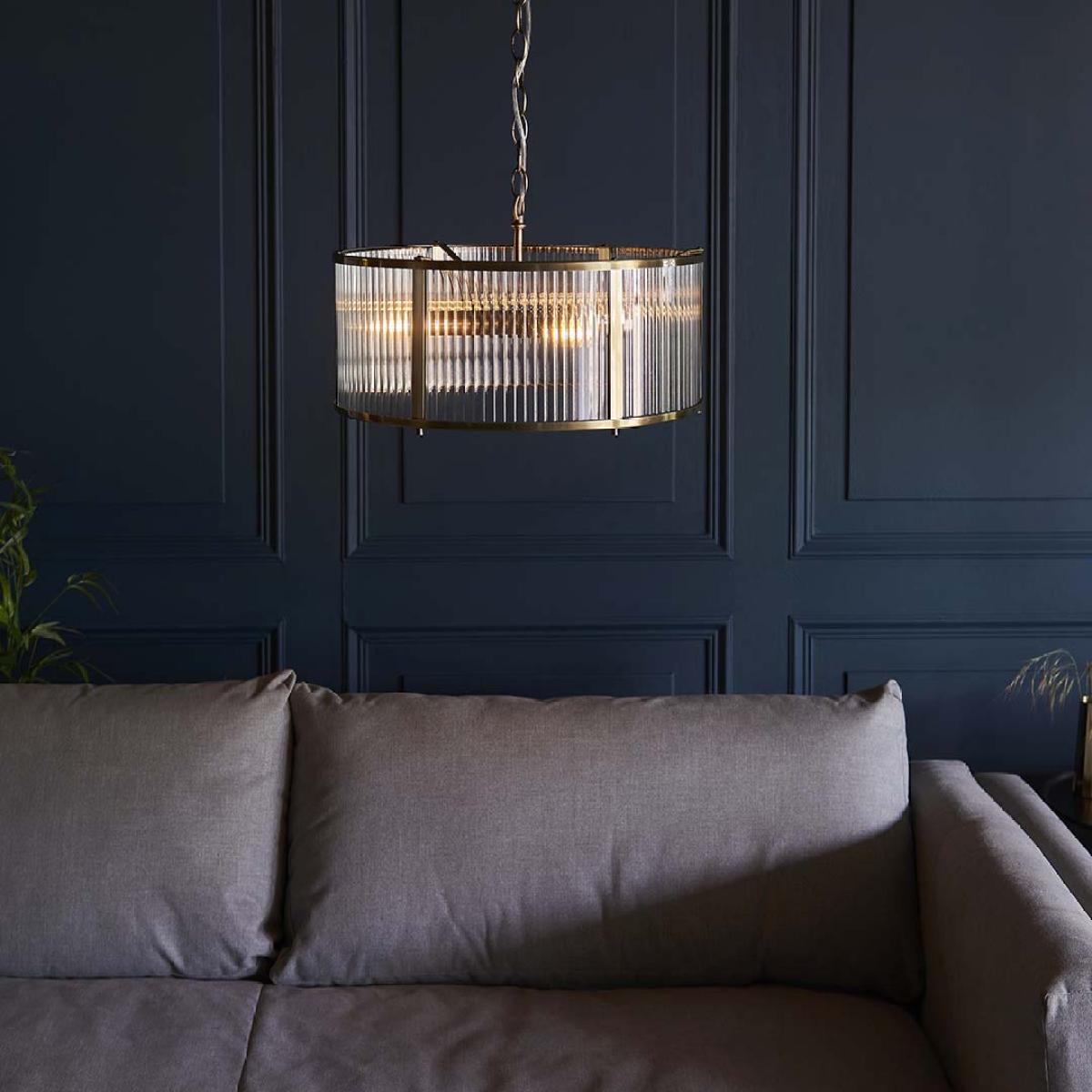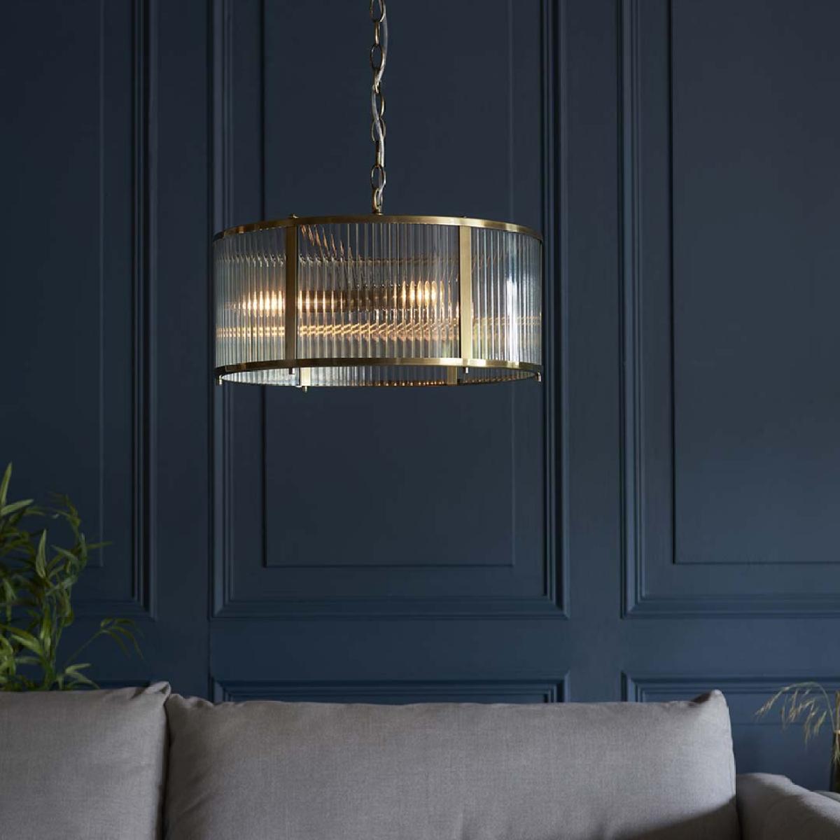 Ridgeton 3-Light Antique Brass Ceiling Light Bring timeless elegance to your home with the Ridgeton 3-Light Ceiling Light. Featuring exquisite antique brass-plated metalwork and a clear ribbed glass panel shade, this fixture exudes vintage charm while casting a warm and inviting glow. Perfect for adding sophistication to any room, it’s an ideal choice for dining rooms, living spaces, or entryways. Key Features: •Dimensions: H40 x Dia45 cm. •Adjustable Drop: Includes a 1.5-meter chain with a clear cable for customizable height. •Dimmable: Compatible with dimmer switches for tailored ambiance. •Bulb Requirement: Requires 3x E14 lamps (not included). For the best effect, pair it with E14 LED filament bulbs, offering energy-efficient lighting without compromising on style. The Ridgeton Ceiling Light effortlessly combines classic design with modern functionality, making it a standout piece for any space.