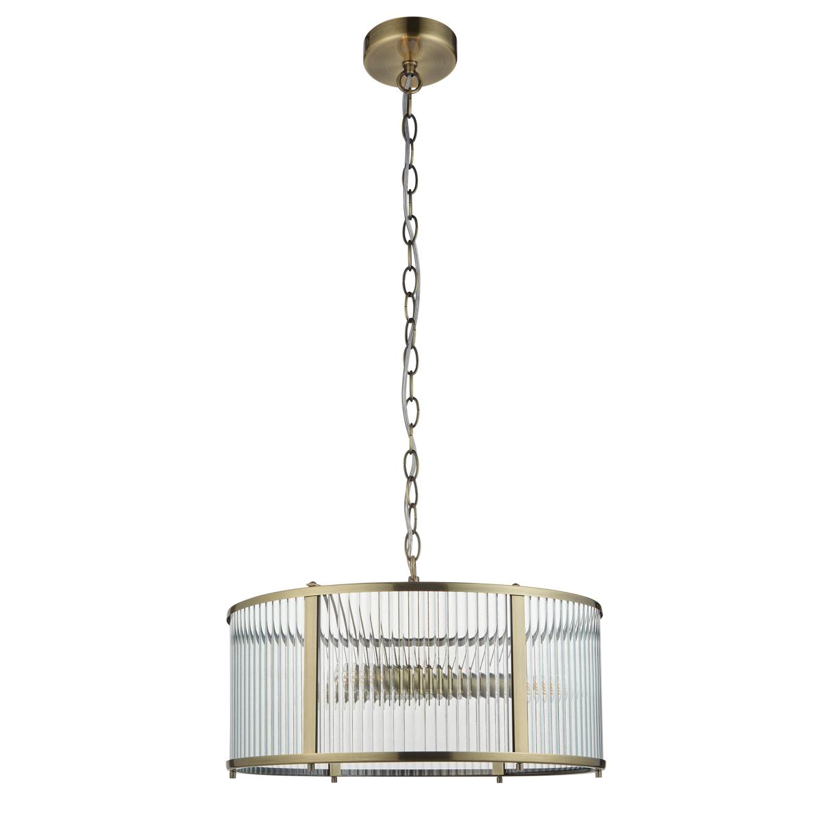 Timeless classic pendant with antique brass plated metalwork, the clear ribbed glass panel shades beautifully diffuse the light. Height adjustable chain means this can be perfectly placed to illuminate hallways, living spaces or dining rooms. Matching flush light also available to create a co-ordinated look.