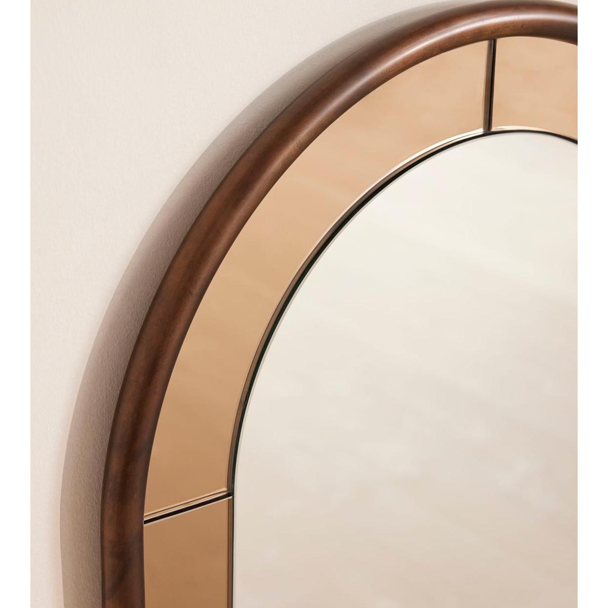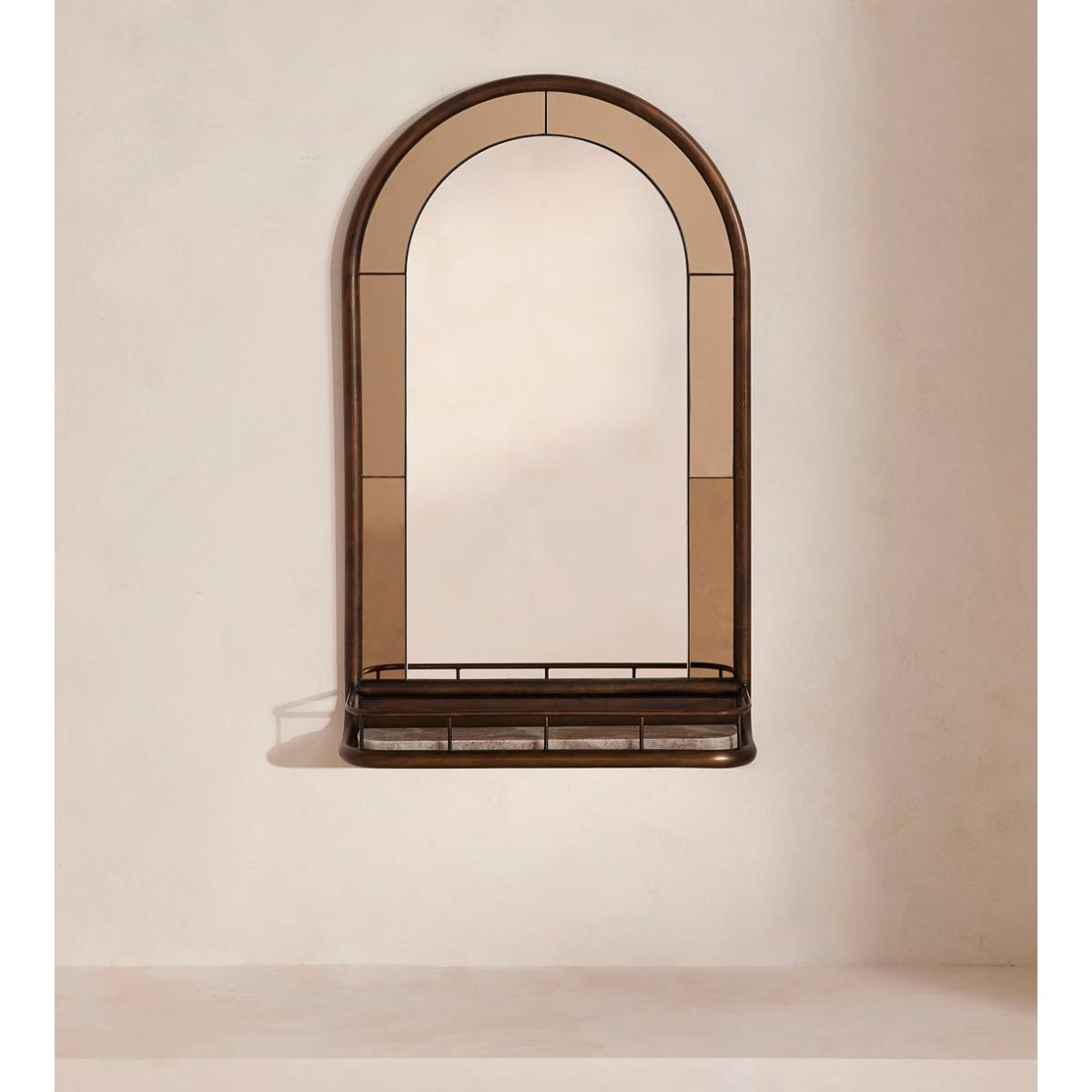 Hand-distressed for a distinctive antiqued patina, the Ridley mirror's brass frame features curved glass panels that follow the lines of its arched silhouette. Smoked glass around the outer edges creates a subtle contrast.