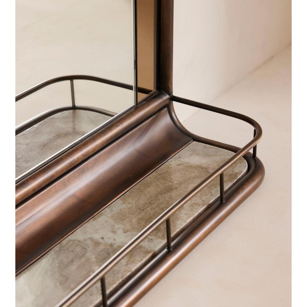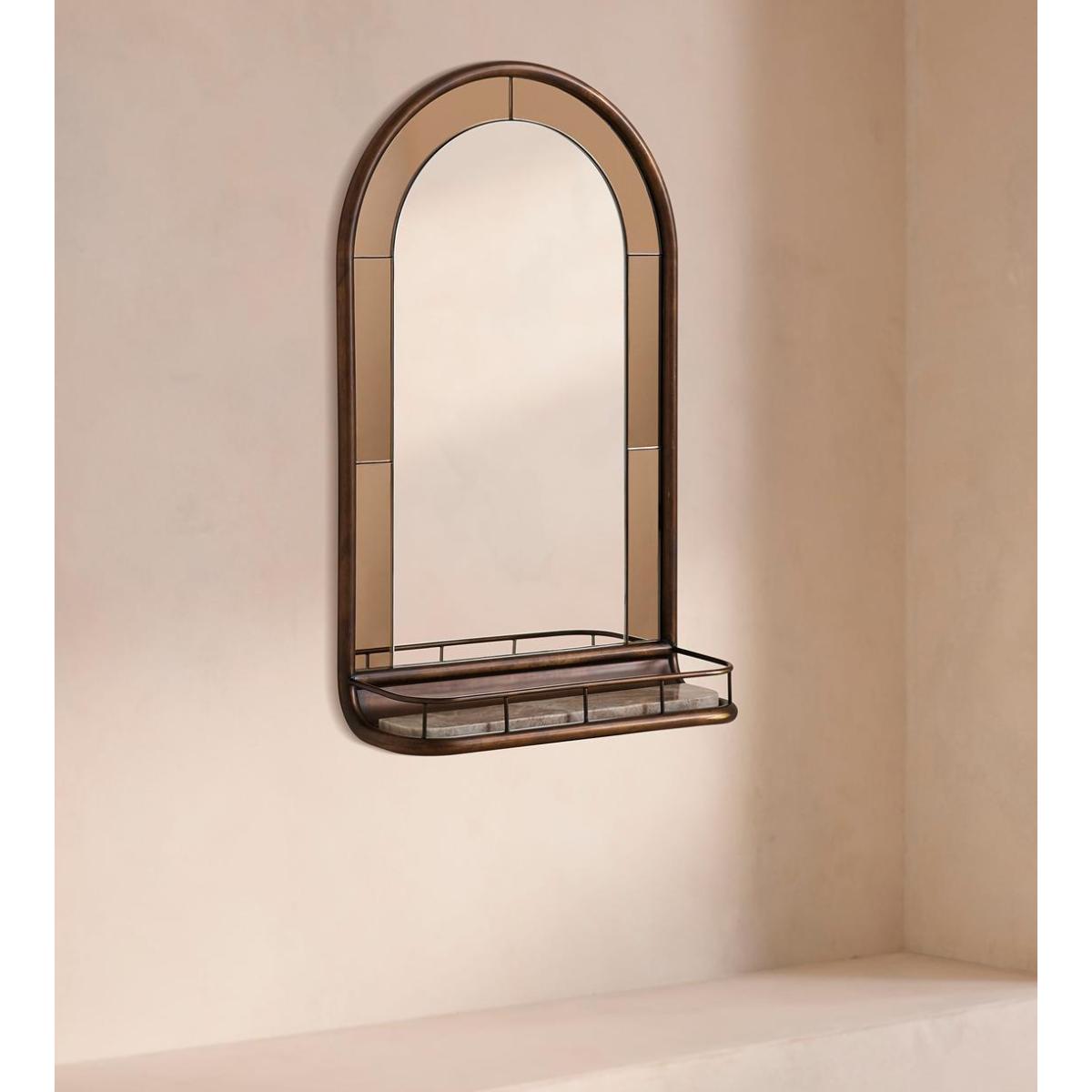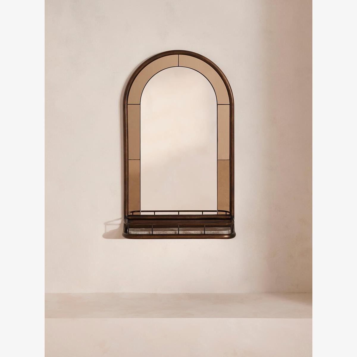 I’m a fan of the Ridley for its simple arched frame and integrated shelf, which makes it as practical as it is stylish. The smoke-tinted glass works particularly well in contemporary, industrial or Scandi-inspired spaces, bringing a subtle warmth without overpowering the room. For best results, hang the Ridley at eye level in an entrance hall or above a slim console; the shelf is perfect for keys, a small plant or a pair of sunglasses. If you’re using it in a bathroom or dressing area, team it with matte-black fittings and warm LED lighting to highlight the mirror’s subtle bronze tone.