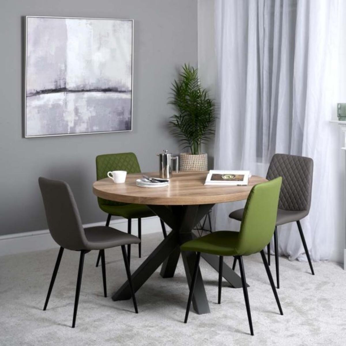 The Ridley Dining Table is a chunky lesson in industrial styling, with a big star formation base made from metal coated in a grey powder paint and a thick top wrapped in a textured oak effect foil. It has a lovely feel and not being real wood is easy to keep clean and is made to last. Round tables are a great way to dine together and encourage conversation.