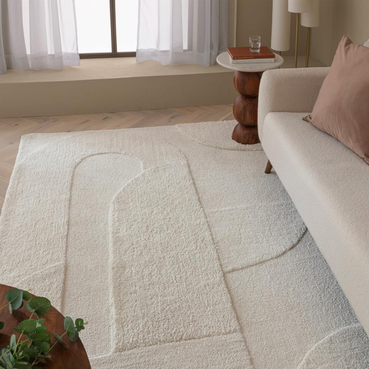 Our Rift modern large rug in cream features a simple yet eye-catching design of overlapping arches carved into the rug pile, giving it a dynamic and textured look that will add interest to your lounge area, bedroom or dining room without drawing too much attention. A gorgeous finishing touch. Made from 100 polyester on a cotton back, with a 36mm pile, this rug is soft and snuggly underfoot. Note Due to differences in how screens display colours, there may be some slight variations in colour from what is pictured. Our Rift modern large rug in cream features a simple yet eye-catching design of overlapping arches carved into the rug pile, giving it a dynamic and textured look that will add interest to your lounge area, bedroom or dining room without drawing too much attention. A gorgeous finishing touch. Made from 100 polyester on a cotton back, with a 36mm pile, this rug is soft and snuggly underfoot. It measures 160cm x 230cm (5.3ft x 7.6ft), making it a fantastic big rug for living rooms. Note Due to differences in how screens display colours, there may be some slight variations in colour from what is pictured.