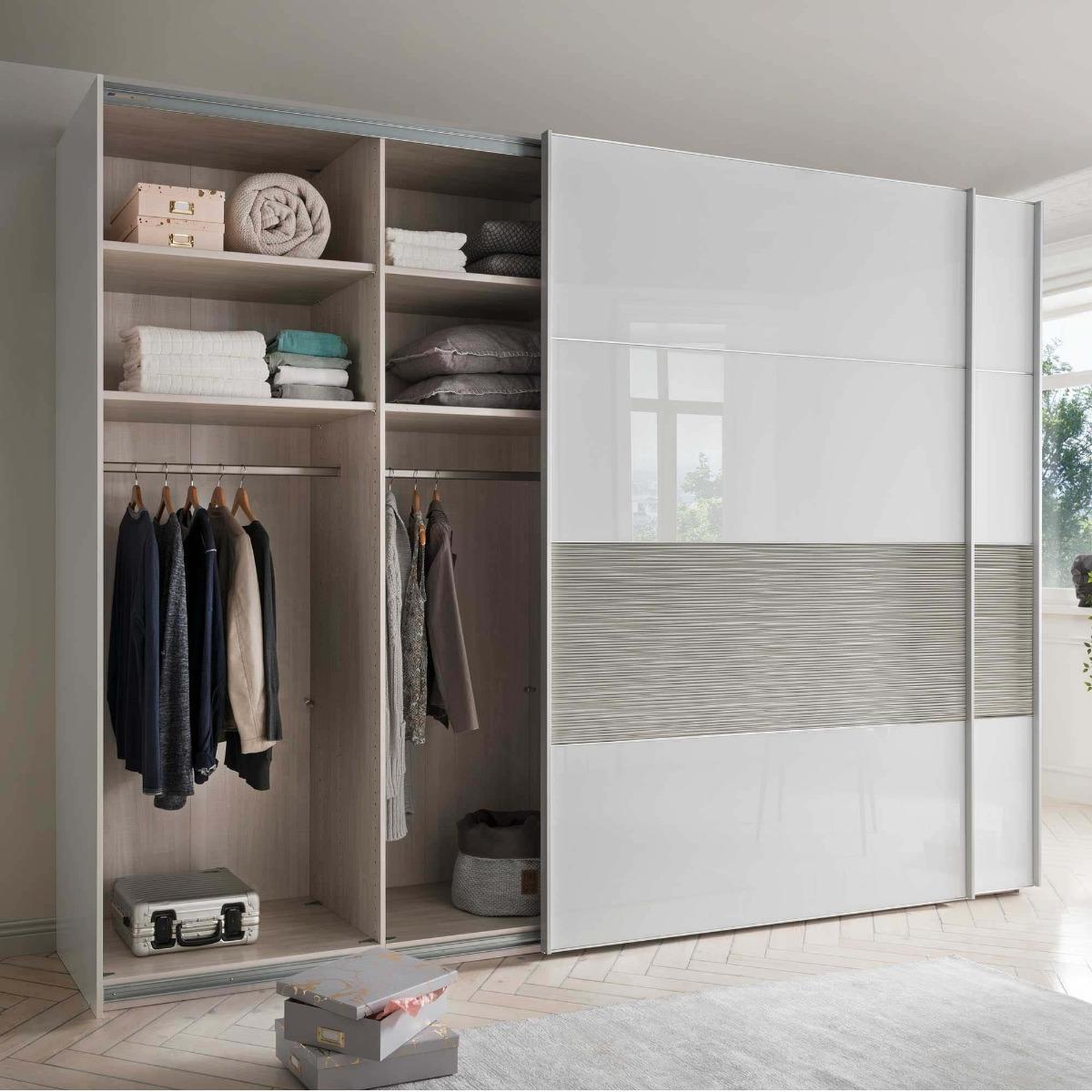 Design. Showcasing gorgeous white glass doors with chic grey panels, the Riga sliding wardrobe will give a light and breezy feel to any bedroom. Its modern design is made to be seen, with high quality evident in every inch. Offering optional lighting and internal storage features, this smart sliding wardrobe can really be customised to suit your needs. Please note this item is delivered and fully assembled by our trusted supplier.
