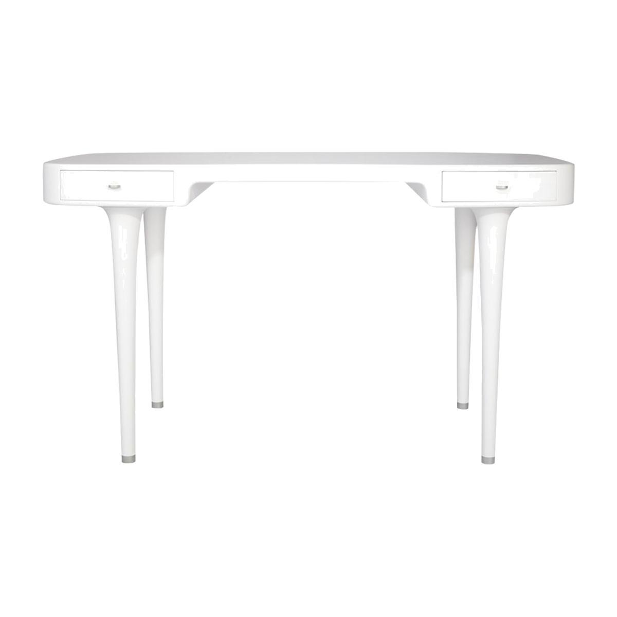 Loosely inspired by traditional jeweller's tables, the refined and minimalist white Riga Desk was beautifully designed by Marc Newson in 1995 and exquisitely crafted by Cappellini. Designed specially to suit tight spaces, the Riga Desk is crafted from wood in a matte lacquered white finish. The perfect addition to any compact home, the desk features two practical drawers finished with anodised aluminium pulls and feet in the same material. A small and light design, the Riga Desk would lend a touch of contemporary, clean-lined design to any home.