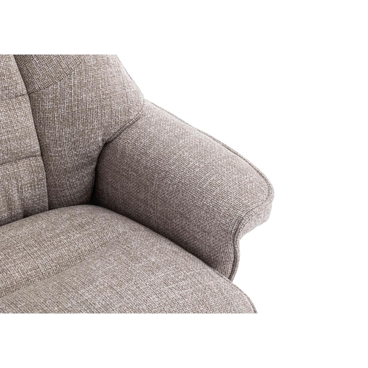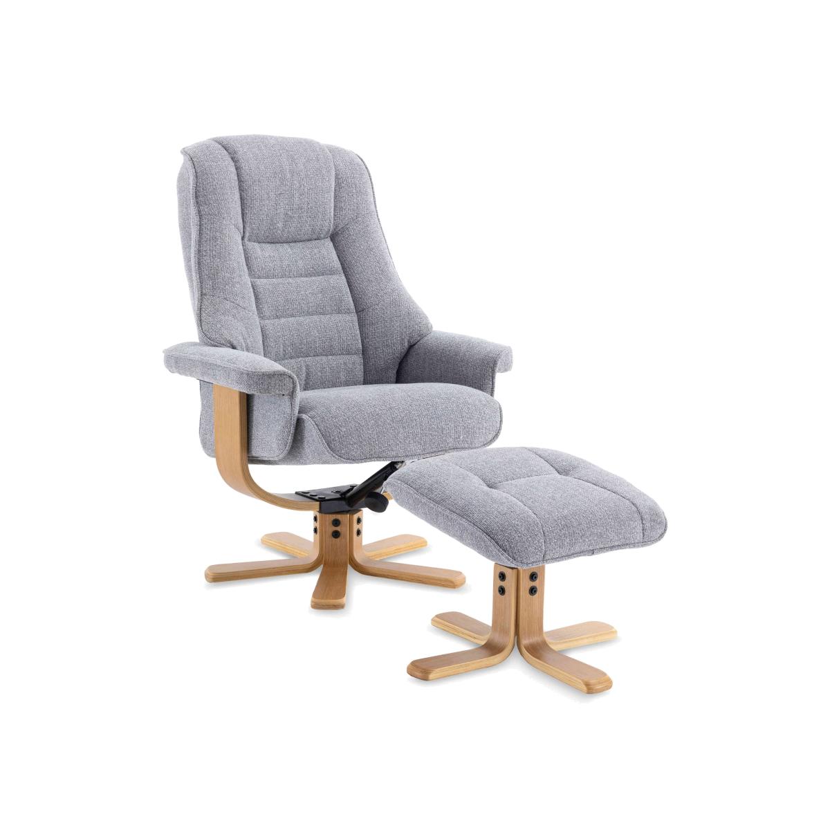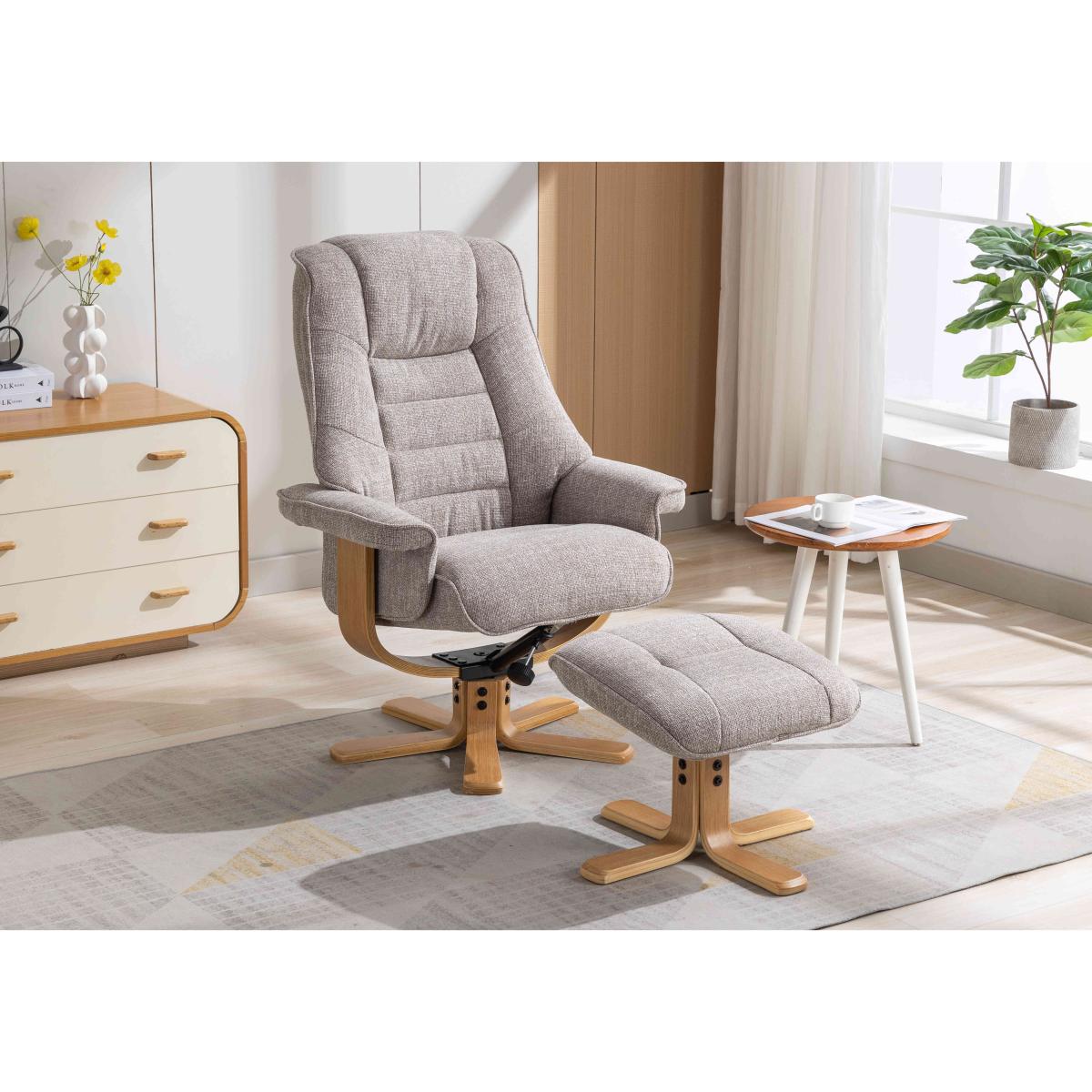 You’ll feel instantly relaxed when you take a seat on the Riga swivel armchair. Complete with a matching footstool, this chair reclines and swivels 360 degrees and has an adjustable headrest. Why you'll love it This chair and footstool set is such a stylish way to relax. With a recliner and 360-degree swivel function for your kind of comfort. Easy push-back recline mechanism. Adjustable tilting headrest. High-back and sumptuous body-hugging cushioning for wonderful support. Wooden U-shaped frame and star-shaped base. Beautifully upholstered in soft, high-quality fabrics in a choice of colours. The matching footstool ensures head-to-toe relaxation. Find this swivel armchair and footstool at Furniture Village. What you need to know Medium comfort level. Seat suspension: S springs. Seat cushioning: foam and fibre. Seat cushion is fixed. Back suspension: foam core, fibre top. Back cushioning: foam and fibre. Back cushion is fixed. Arm cushioning: foam and fibre. Arms and feet are removable for ease of access. Please allow time for the recliner mechanism to ease. Minor gaps are necessary to ensure ease of motion and may be exaggerated depending on floor type. Some fabrics can show wear on areas of more use or in direct sunlight. Clean regularly using a soft brush or vacuum with the curtain attachment. Deal with any spills promptly. Professional cleaning advised for oil- and grease-based stains. Please read our upholstery care guide for more advice.