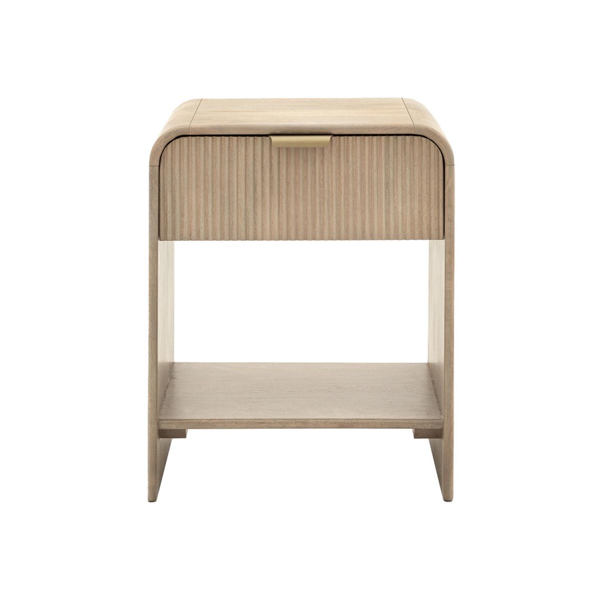 Prepare to fall in love with the Rigato range. Defined by its distinctive ridged surfaces, curved edges and luxurious brass accents, this collection adds texture and style to any room. The Rigato Bedside Table features a spacious drawer providing ample storage for essentials whilst serving as a stylish accent piece. Its sleeks silhouette and cool-toned wooden finish makes it a versatile addition to any contemporary interior.