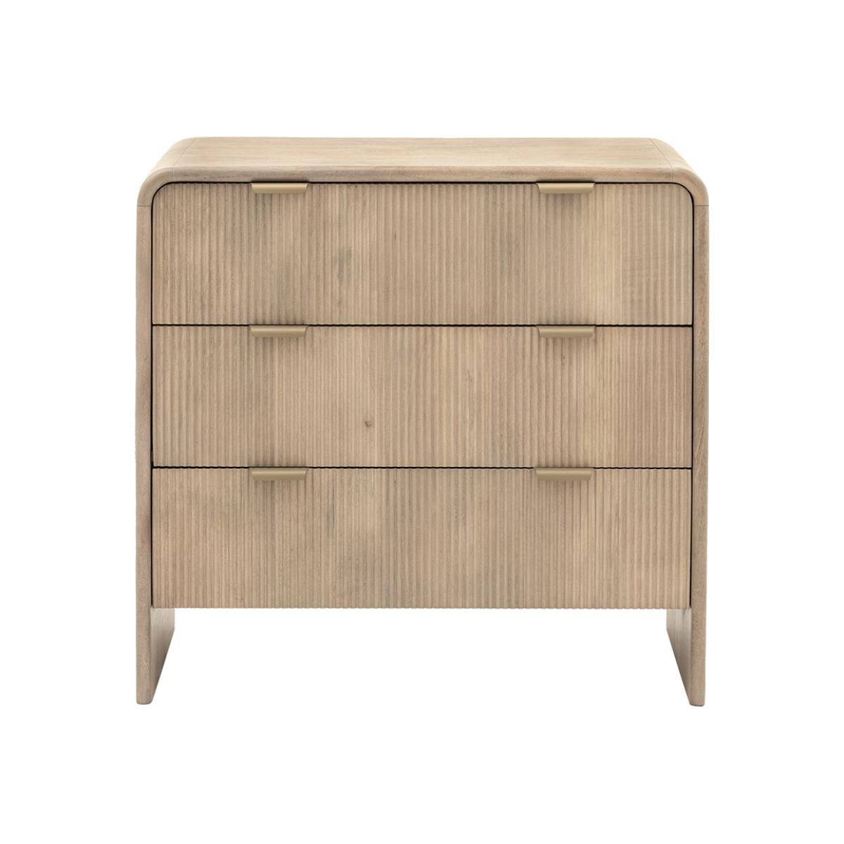 Prepare to fall in love with the Rigato range. Defined by its distinctive ridged surfaces, curved edges and luxurious brass accents, this collection adds texture and style to any room. The Rigato Chest of 3 Drawers offers ample storage within its three spacious drawers, perfect for keeping your home clutter-free. Its sleek silhouette and cool-toned wooden finish makes it a versatile addition to any contemporary interior.