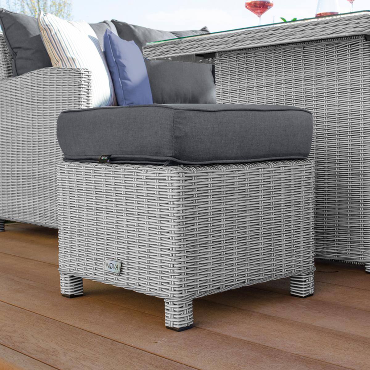 The Nova - Heritage Right Hand Ciara Casual Dining Rattan Corner Sofa Set with Glass Table Top - White Wash is a dining set with a difference. Made with a strong duracore rattan weave that uses a mixture of full rod and half rod rattan that offers increased durability and longevity of the rattan. The synthetic rattan weave is famed for its weatherproof qualities and is protected from the sun's UV rays, meaning it will not fade, as well as frost and snow so it will not crack or go brittle. This allows you to leave your rattan outside all year round, even throughout the coldest and dampest months, without damage to your rattan. This great corner sofa set allows room for people to sprawl out on the sofa and also includes 3 footstools which can double up as extra seating. This set is paired with a fantastic casual dining table that is also finished with a stylish glass table top. This set comes complete with thick padded cushions throughout. We advise keeping the cushions inside when not in use as they are not waterproof. However, the cushion covers can be unzipped and are machine washable. The high-quality PE rattan is completely weatherproof and can be left outside all year round without risk of weather damage. This set comes complete with a 7 year guarantee to ensure quality and peace of mind. Set Includes: 1 x Left Hand Sofa Piece 1 x Right Hand Sofa Piece 2 x Footstools 1 x Casual Dining Table Padded Cushions Throughout Product Features: 7 Year Guarantee Height Adjustable Table Glass Table Top Powder Coated Aluminium Frames 100% Weatherproof Rattan
