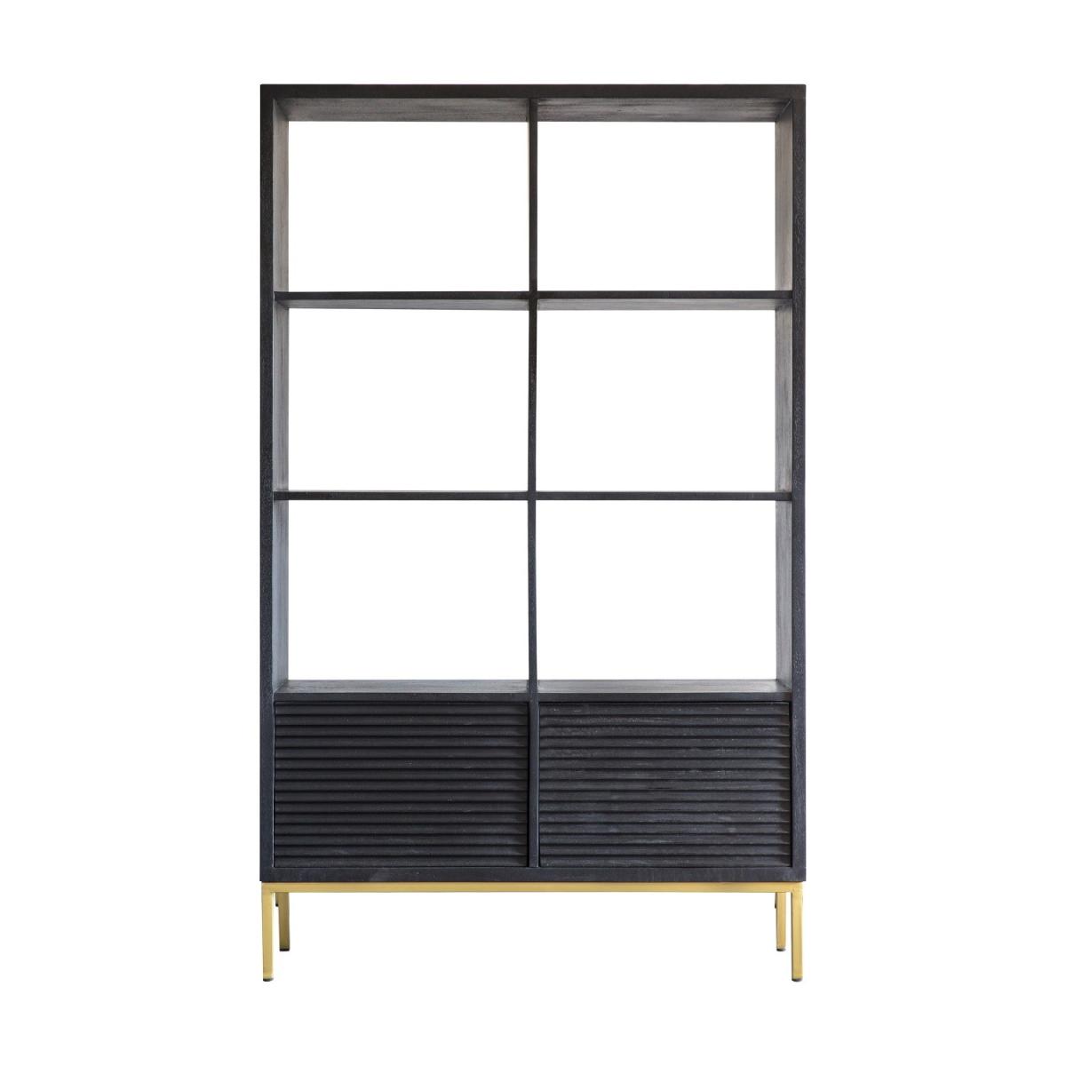 The Riley 2 door and open shelf display unit features a stunning detail to the front that adds dimension to the room. The sideboard made up from mango wood and mango wood veneer which has a dark black stain added, which still lets you see the natural wood grain and knots through it.
