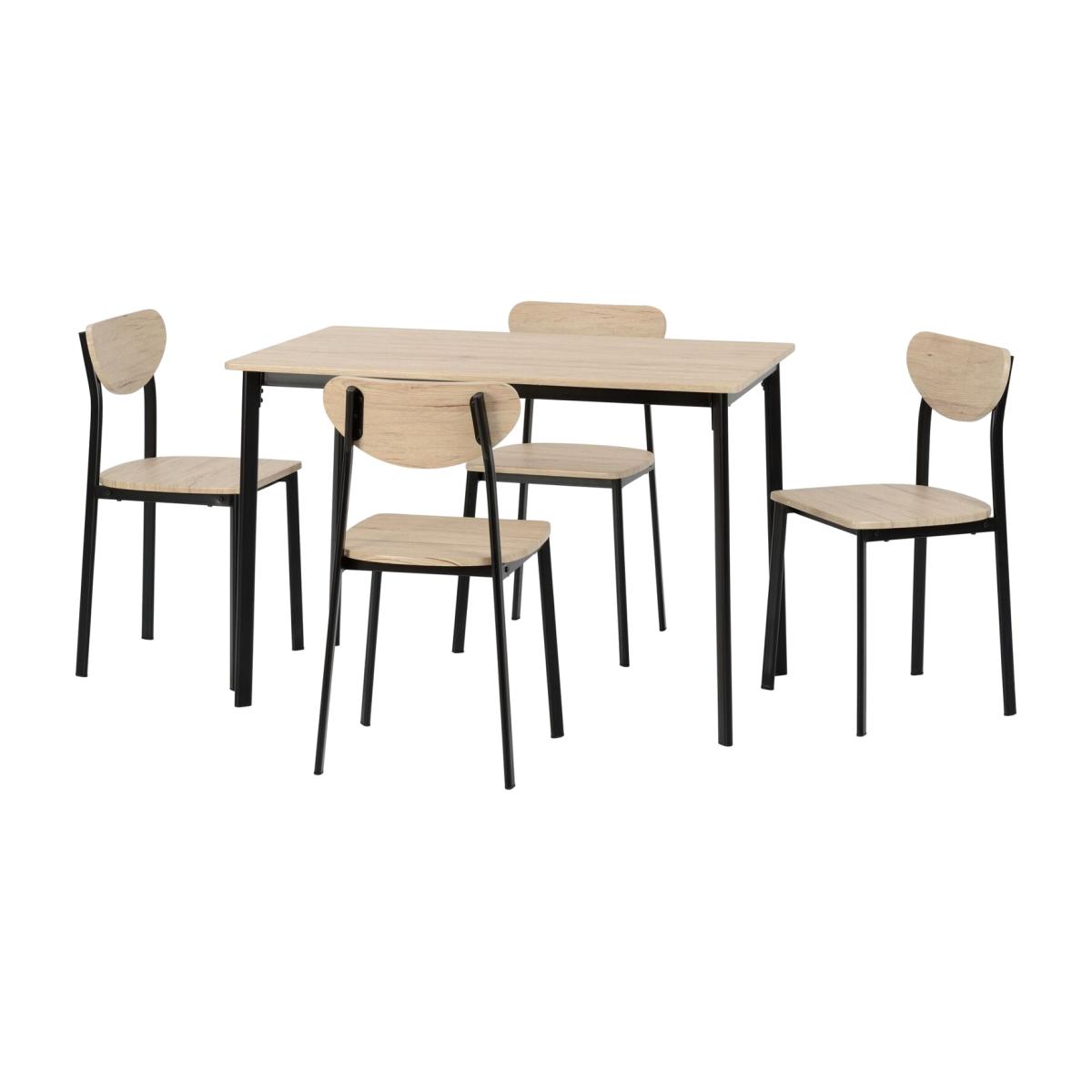 With a light oak tabletop and sturdy metal base, this dining table and its accompanying chairs are a great set to finish any living room or dining area. The set includes one dining table and four matching chairs with a restrained, contemporary design, seating a total capacity of four people. It is made from manufactured wood and steel. Assembly is required. UK Mainland delivery only, between 9am - 9pm (weekdays) the courier will contact you on the day of delivery to offer a time slot. This takes place within 10 working days (Ground floor only). Please also ensure that we have a note of your up-to-date address and contact information, to be passed to the couriers.