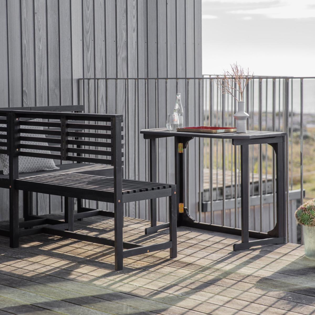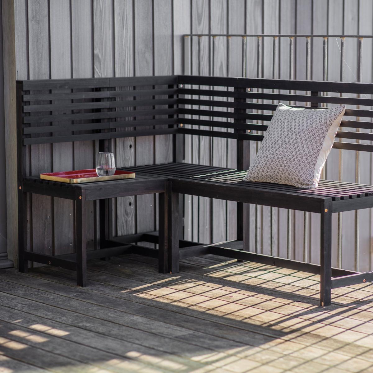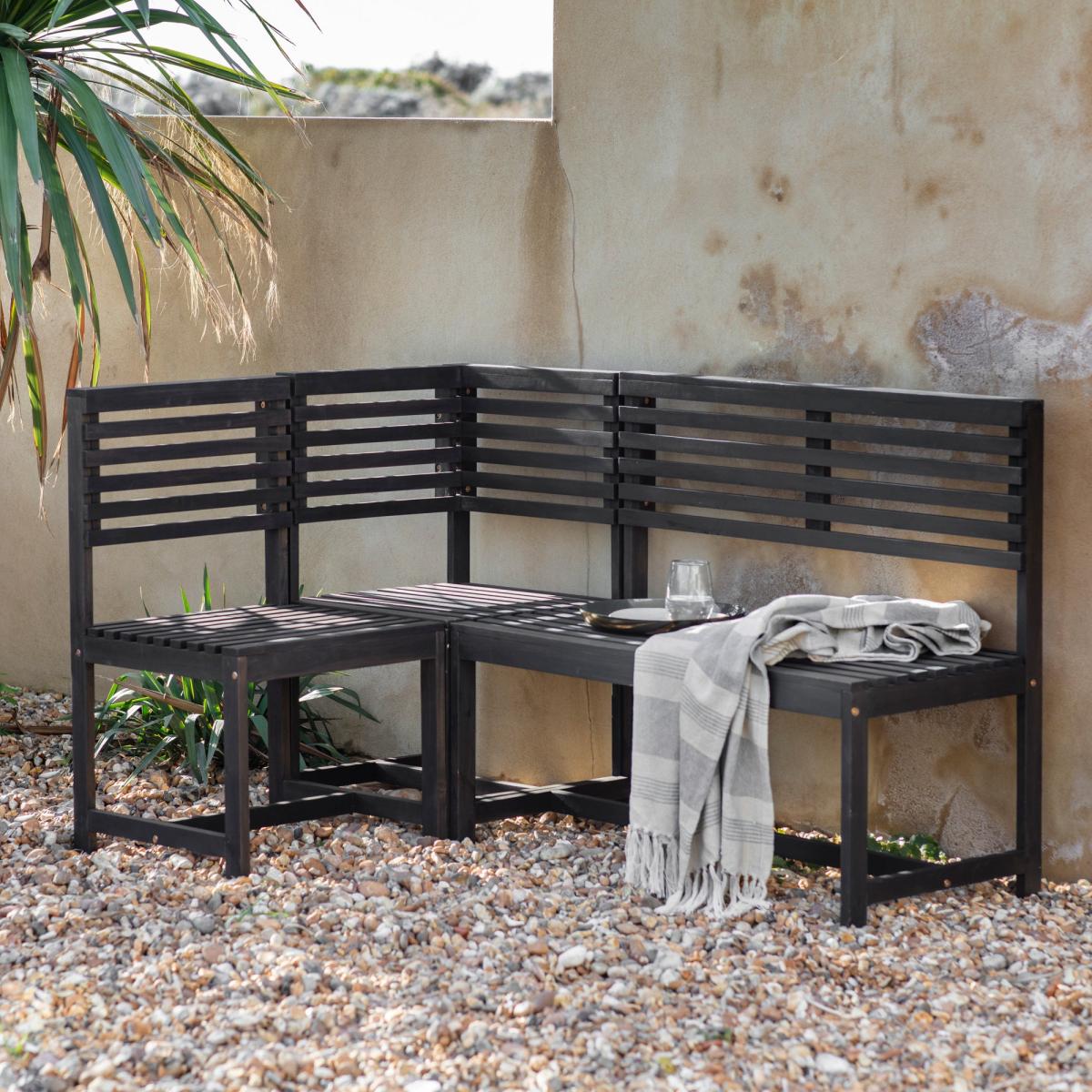 This Balcony Bench Set is designed for use on balconies, but looks equally good in the corner of a patio or garden, and goes with our matching Balcony Table. It creates a corner bench. It is crafted from acacia wood with a charcoal painted finish. The set is also available in a natural-look finish. It is part of a collection of outdoor furniture which offers a great range of pieces, so you can select the ones to suit your requirements.