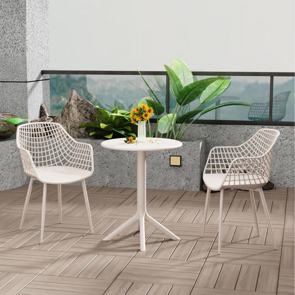 The Rimini Lattice compact bistro set comprises a round perforated pedestal table with two precision cut lattice style plastic arm chairs available in a choice of striking colours. The plastic used in manufacturing this set contains a special UV inhibitor to protect against colour fade and is treated with a weather resistant paint coating making this set ideal for use either indoor or outdoor use. The table legs contain metal internally to improve stability. The set is very easy to clean too, making it hassle free. The set can be very easily assembled - the legs need fixed to the chairs using the screws and Allen key provided, and the table pushes together together. This also means it is very easy to disassemble for winter storage should you wish.