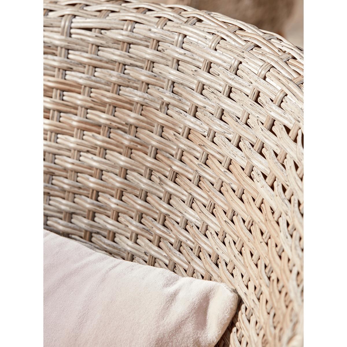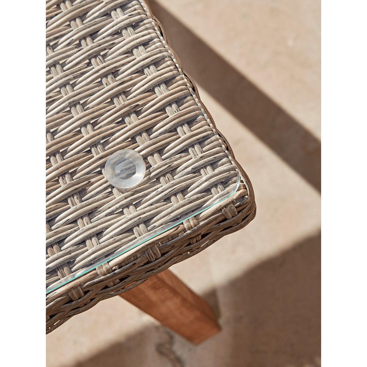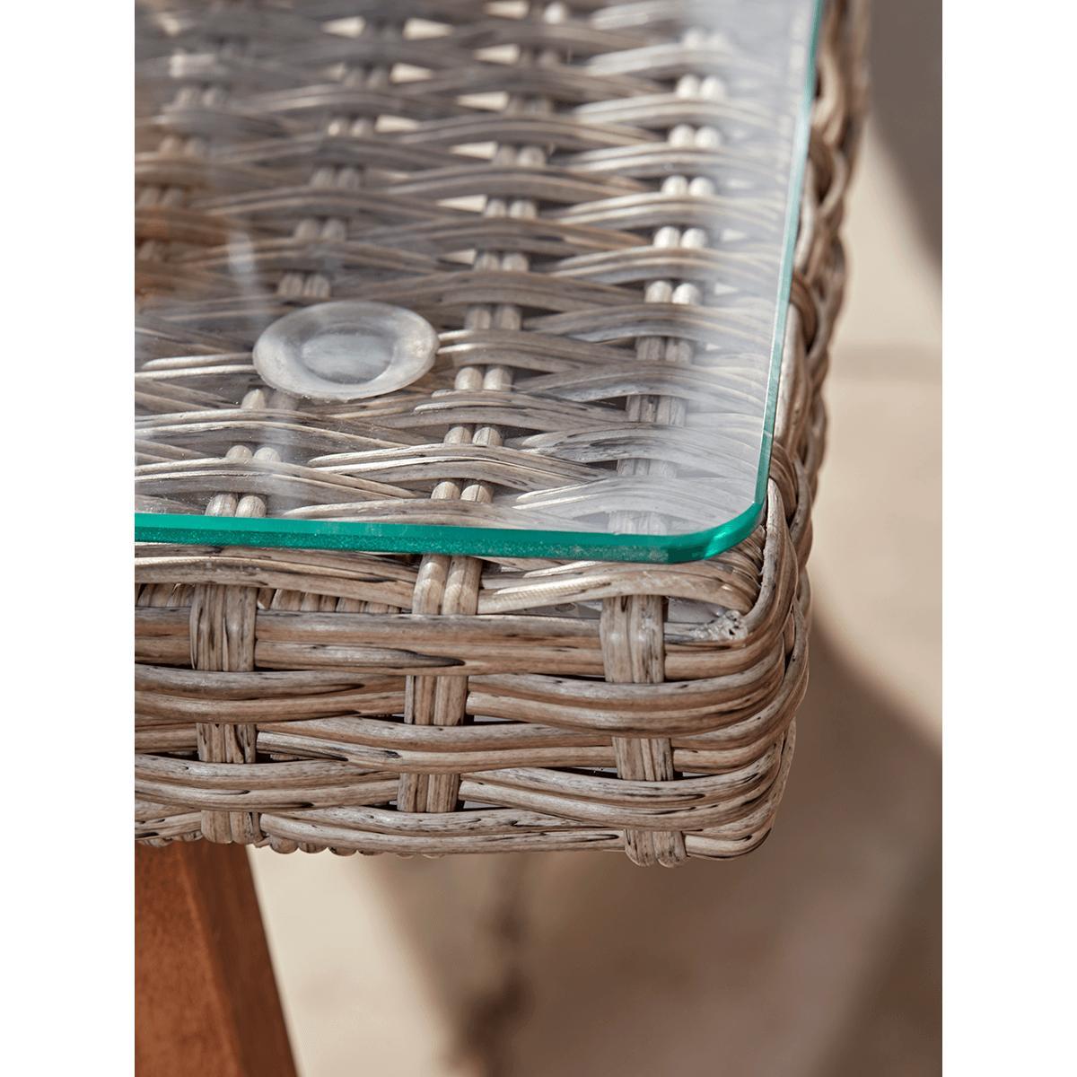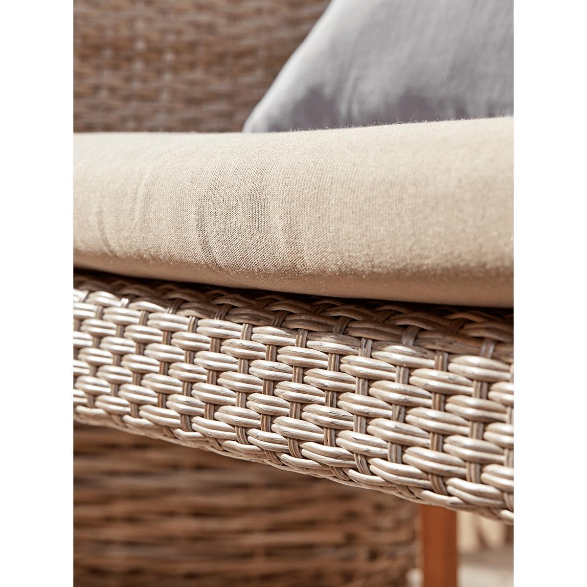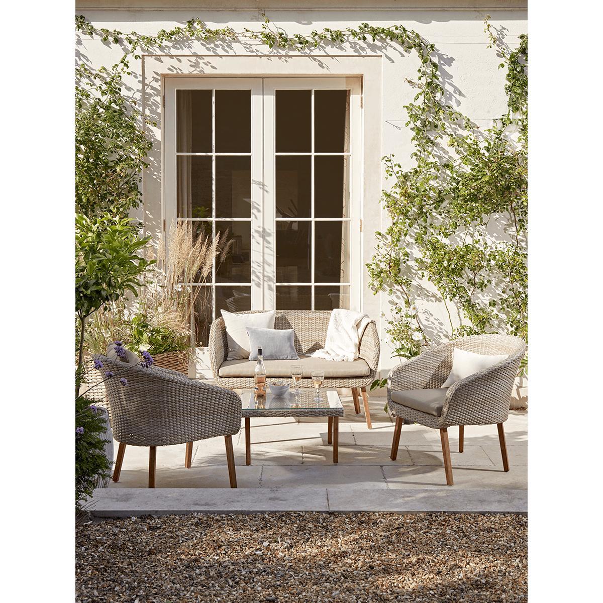 Made from natural toned faux wicker and warm acacia wood, our attractive outdoor lounge set is the ultimate in outdoor lounging luxury. Each set includes a coffee table with a reinforced glass top, a sofa and two chairs, each with a cosy, warm sand seat cushion for comfort. Also includes four scatter cushions in a matching warm sand colour (not pictured).