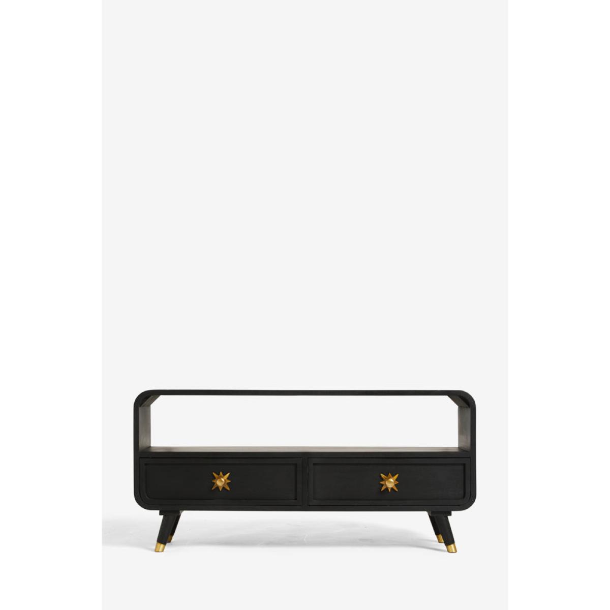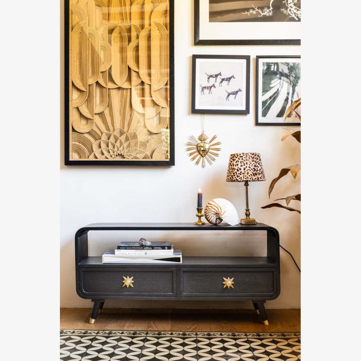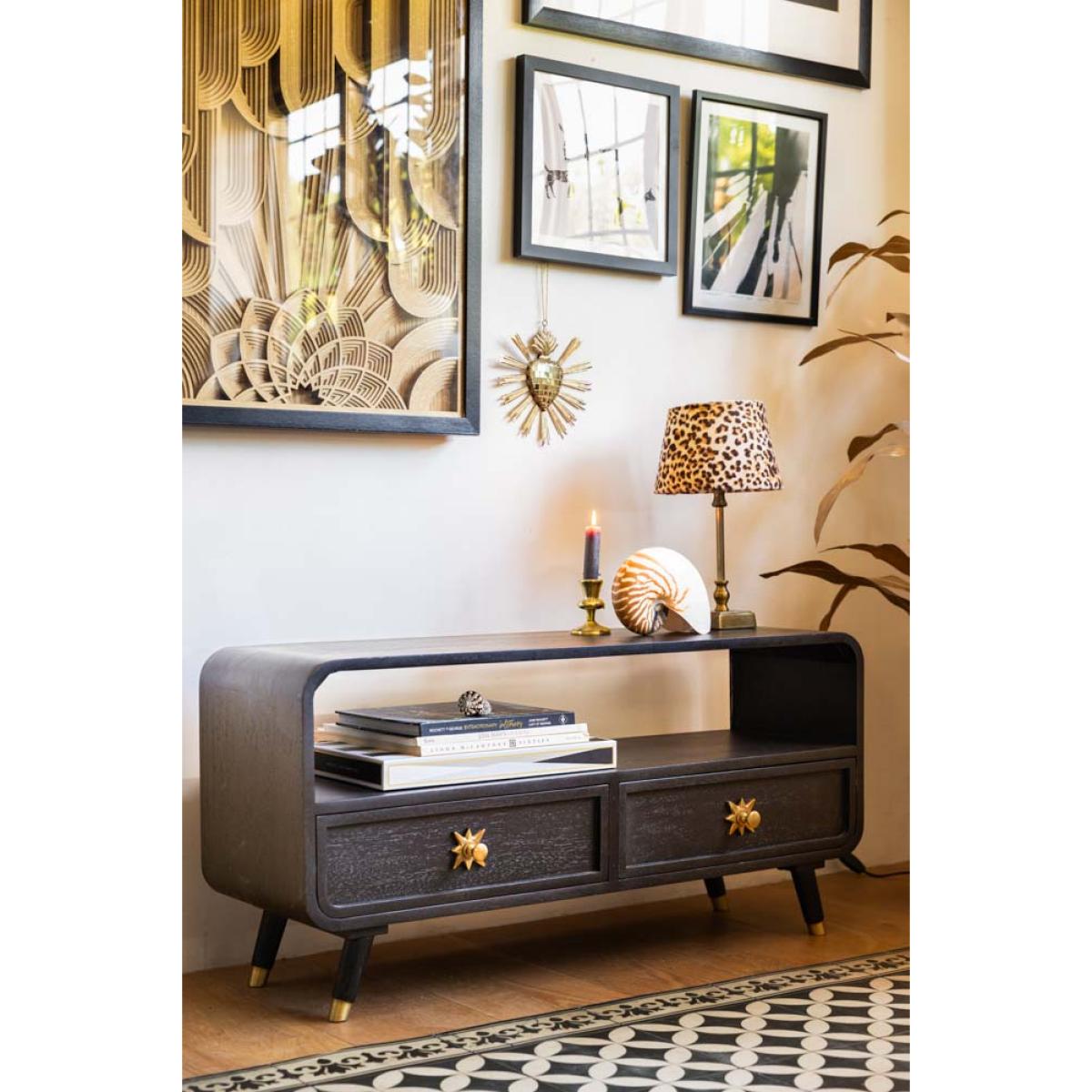 This retro-style TV stand is a showstopper of a piece in dark-stained wood with gold-footed mid-century style legs and fabulous gold star handles. It’s practical, too, with two generous drawers that are big enough for all your TV paraphernalia so you can keep the rest of your living space neat as a pin. The beautifully curved design of this piece makes it easy on the eye and encourages the flow of the room, yet it’s compact enough for smaller homes or apartment living. A forever buy you’ll treasure for years for come.  - Ringo TV Unit  - Material: Mango Wood, MDF  - Measures: H47cm x W99cm x D30cm