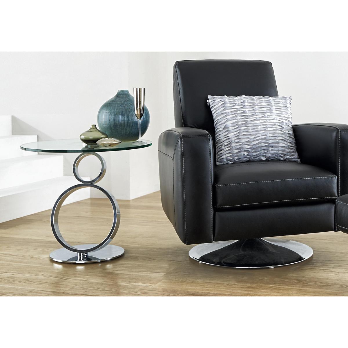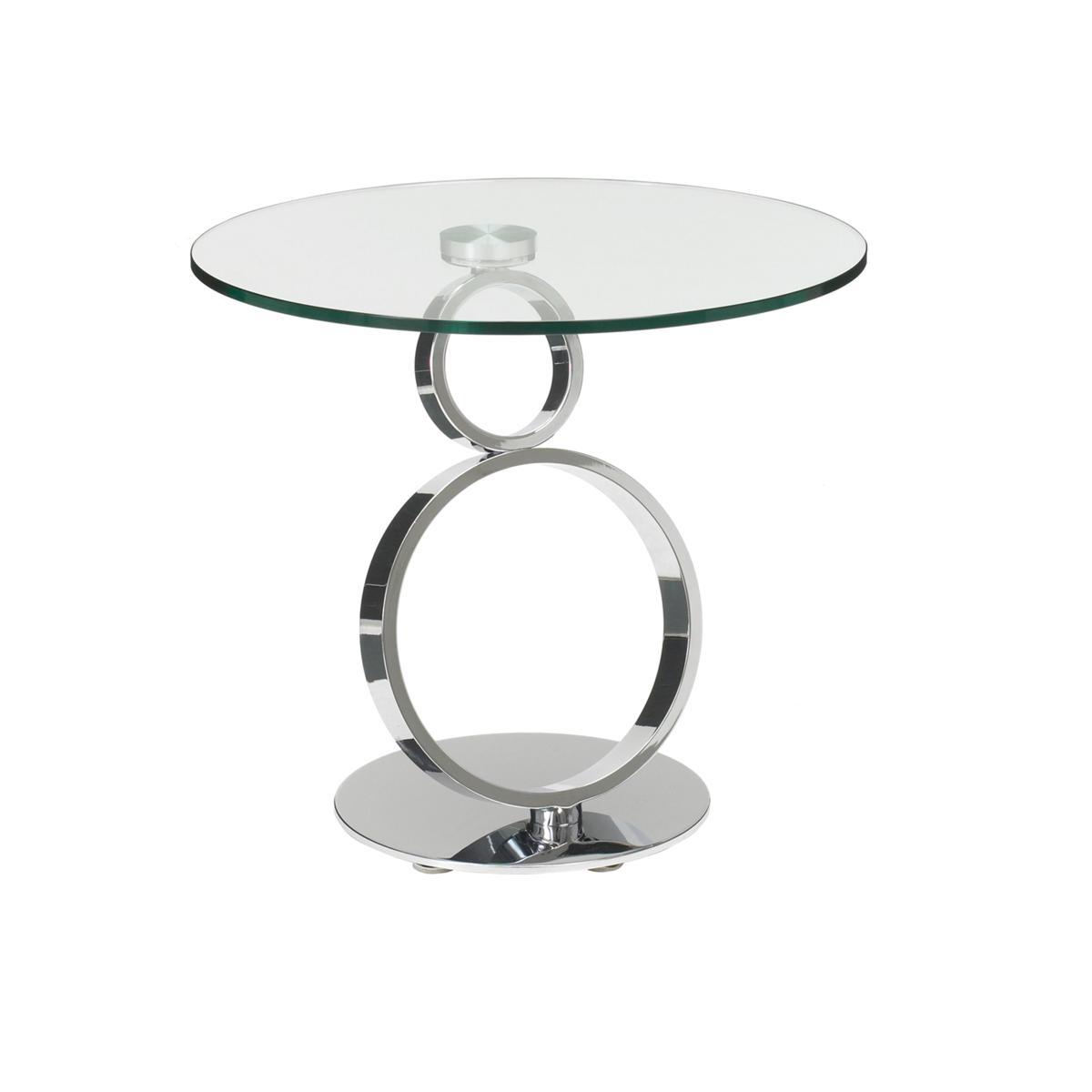 Contemporary chic designed to complement any modern interior. The circular clear glass tops are supported by sparkling chrome plated rings mounted on a stunning chrome plated circular base. Contemporary chic lamp table. Circular toughened glass top. Chrome plated rings mounted on a chrome plated circular base.