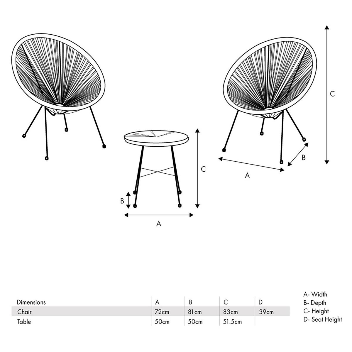 Add a burst of colour and stylish funky design to your outdoor space, whether you enjoy hosting garden parties or sipping on a relaxing drink in the garden, the Rio 3 Piece Bistro Set will surely be a talking point amongst your guests. Complete with two comfortable rounded chairs and a matching table, this set adds sleek lines and bright pops of colour from the PU string weave, contrasted with dark powder coated steel frame for stability. With a clear glass table top that complies with the British Standard Safety Glass, you can enjoy modern transparency, a handy space to place your drinks and snacks and an easy to wipe clean surface.