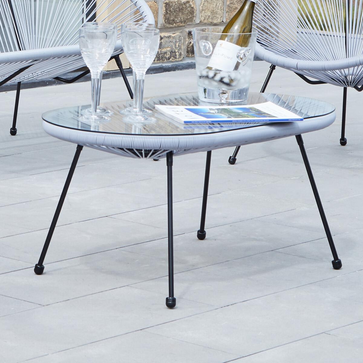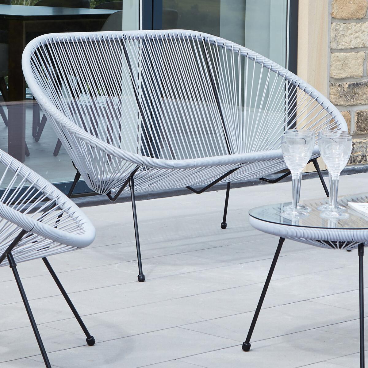The Rio Bistro Set in Grey; comprising of 2 matching chairs a sofa and a coffee table, is made from a soft synthetic weave, which is durable, weatherproof and UV protected. This outdoor bistro table and chairs also features a powder coated, steel frame, which creates a high quality finish. Using this strong, durable, and weatherproof material further ensures that this outdoor set is both long lasting and maintenance free along with providing a comfortable occasional seating set. The side tables are topped with high-quality safety glass, which complies with British Standards. Product Dimensions: Table - L: 50cm, W: 90cm, H: 42cm. Chairs - L: 78cm, W: 72cm, H: 84cm. Sofa - L: 79cm, W: 135cm, H: 85cm Packaged Dimensions: Weight: 32kg, L:139cm, W: 93cm, H: 50cm Please note this item is a large piece of furniture that will require some self assembly. Please ensure you have space to receive delivery. This product will be dispatched by one of our trusted suppliers. You’ll be contacted by their selected courier about your delivery. This item can be delivered to all UK Mainland postcodes with the exception of the following postcodes starting with; AB, BT, DD, IV, KW1-14, PA21-38, PH, TR17-27 & ALL ROI.