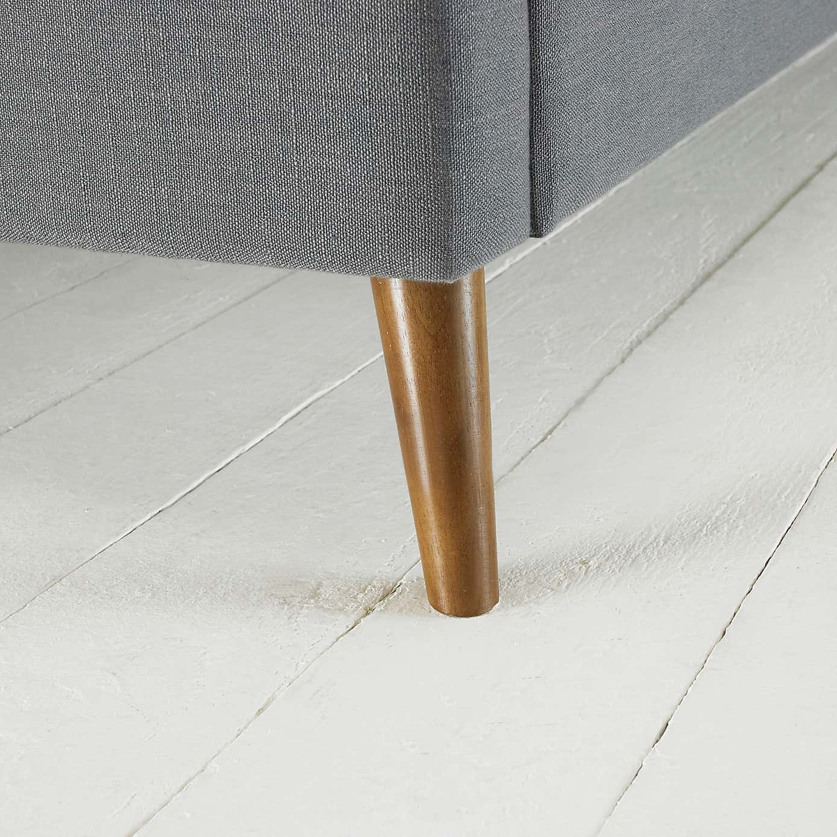 Offering a modern, retro design, the Rio bed frame is upholstered in a stylish grey, linen-effect fabric and features a sumptuous foam-cushioned headboard complete with a single line of button detailing. This trendy, self-assembly bed frame is built with a sturdy wood and metal frame with fitings pre-installed for easy assembly and comes complete with solid wooden feet with an oak finish and a sprung slat base for added comfort.