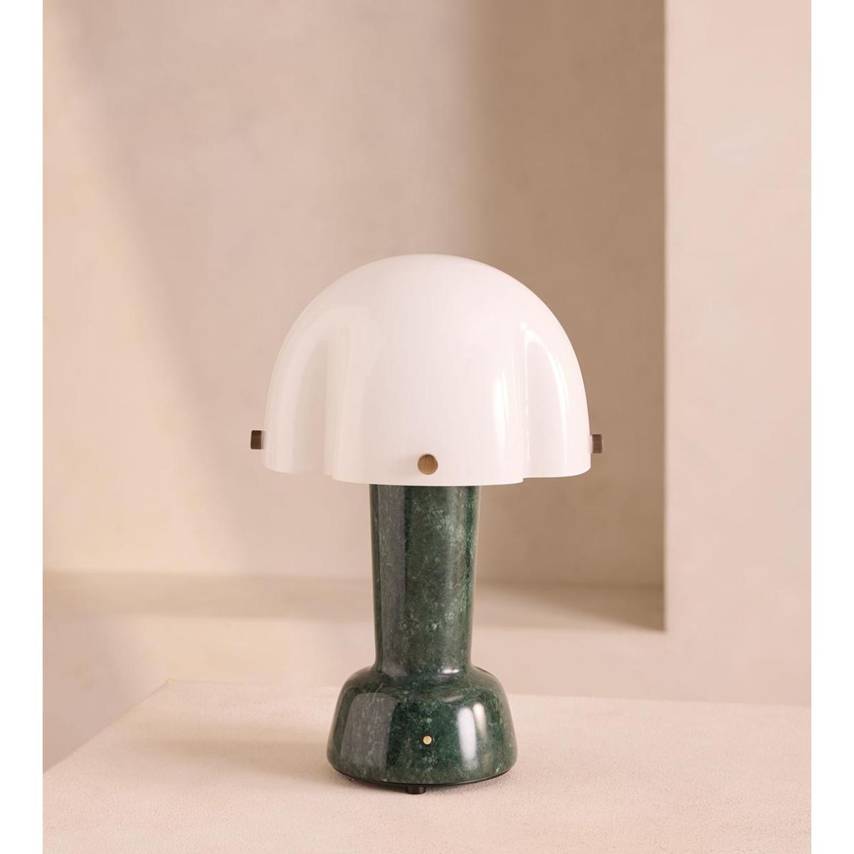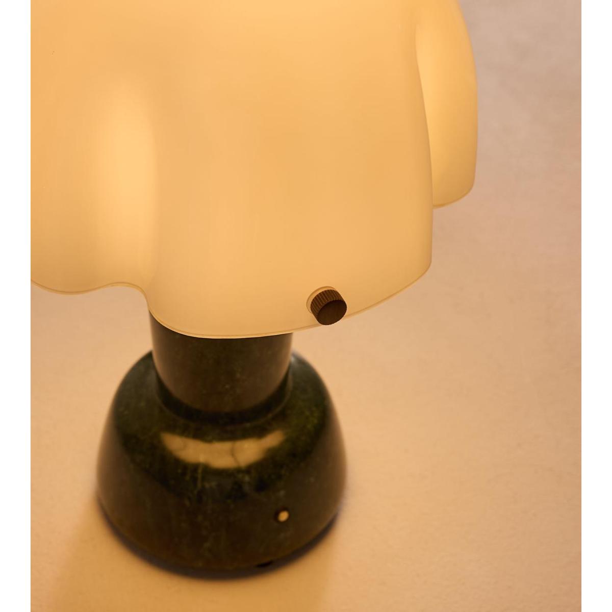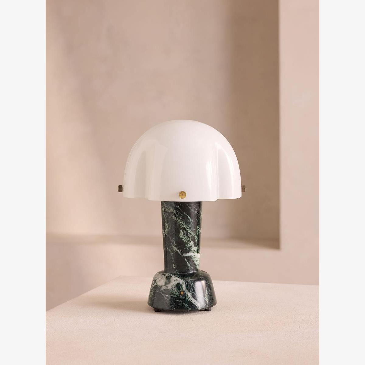 A domed shade made from moulded glass is perched on a solid, rechargeable base carved from green marble. Designed to adapt to your space, this portable and rechargeable lamp can be picked up and placed wherever you need it, whether it's on your bedside table or home workspace. Carved from India green marble, its solid base holds a domed shade moulded to look as though it has been softly folded at the corners.
