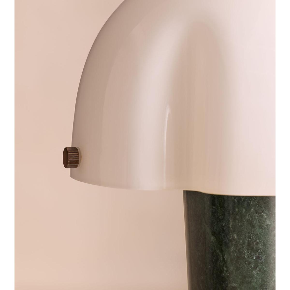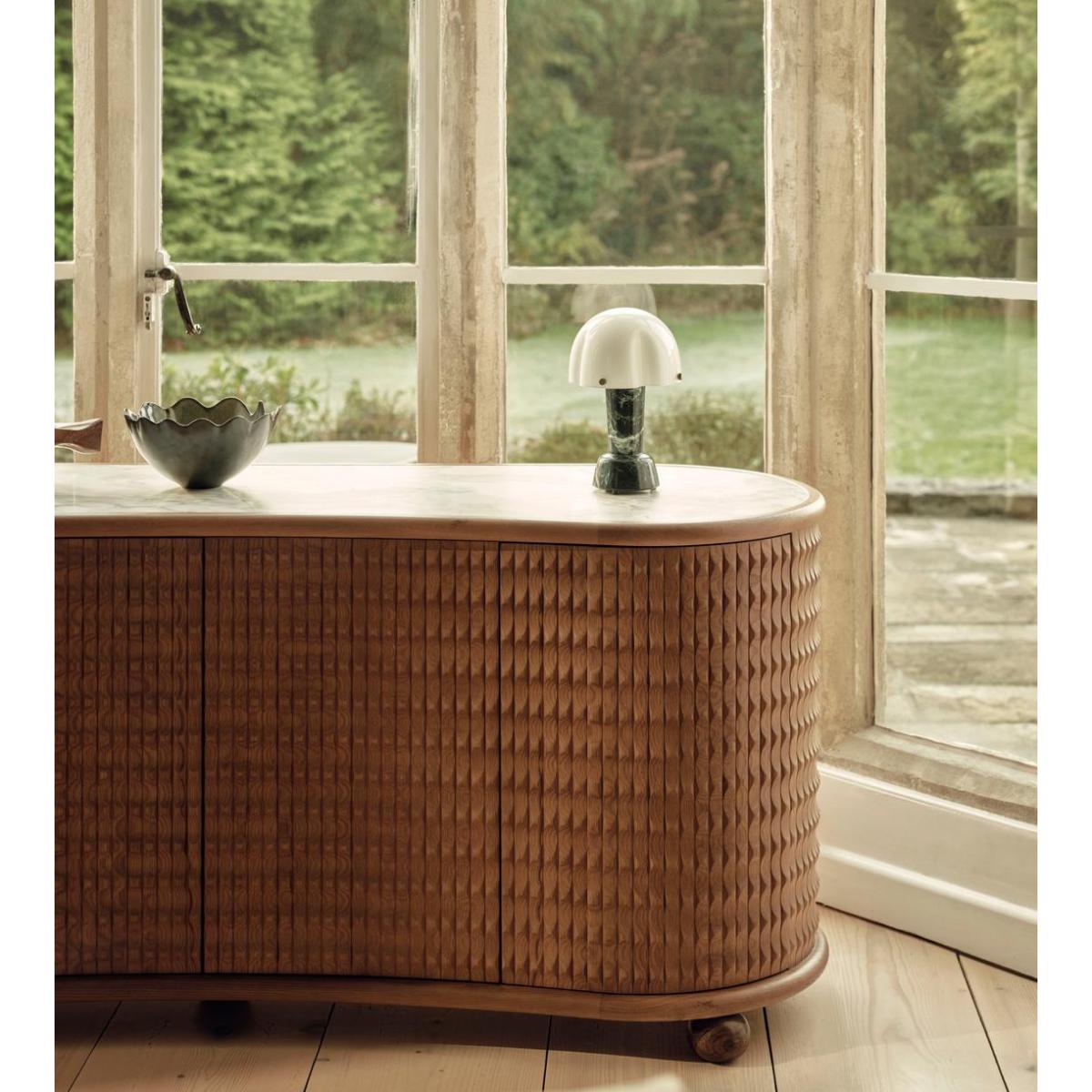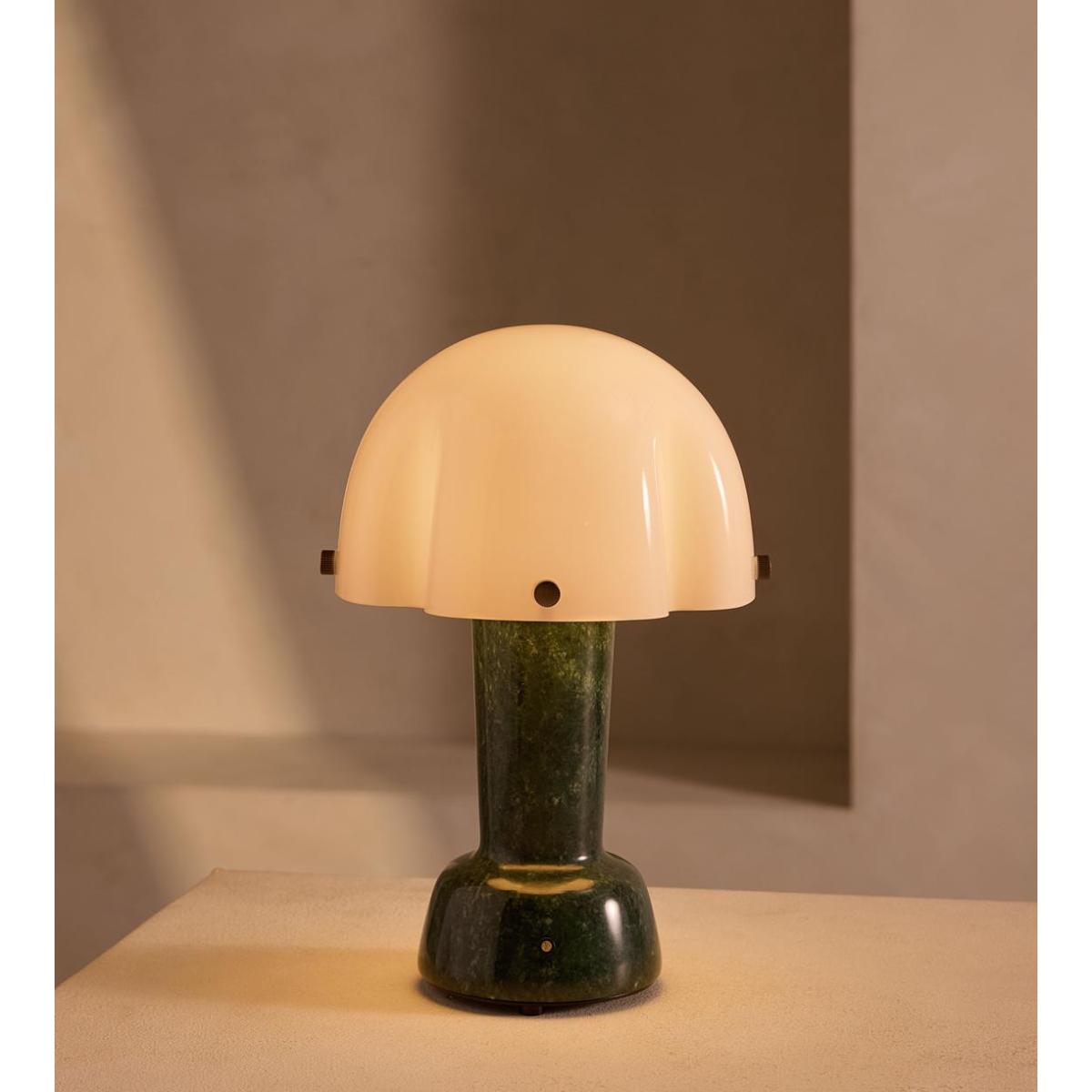 A domed shade made from moulded glass is perched on a solid, rechargeable base carved from green marble. Designed to adapt to your space, this portable and rechargeable lamp can be picked up and placed wherever you need it, whether it's on your bedside table or home workspace. Carved from India green marble, its solid base holds a domed shade moulded to look as though it has been softly folded at the corners.