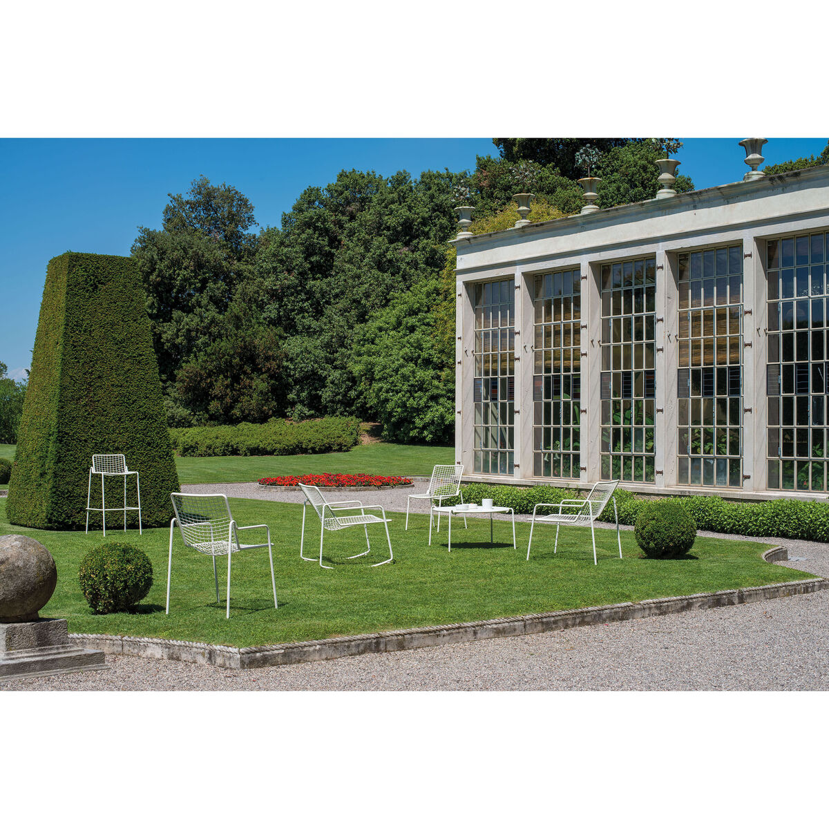 The “Rio R50” collection is a tribute to the Rio armchair, one of the historic models by Emu, which is celebrating its 50th anniversary this year. The Rio armchair was produced between 1960 and 1970. The retro grace of this mesh metal collection is updated by the use of modern materials and manufacturing techniques. The aerial silhouette of this high stool represents a minimal, refined graphic sign. The metal mesh makes the volume of the chair intangible. With its simple, essential lines, Rio 50 finds its place in different environments, from the house to the garden. With more than fifty years’ experience in metalworking, Emu expresses its style in gardens and on terraces all around the world. Emu creations have become icons in the world of "made in Italy" design and quality. The Rio 50 high stool consists of a structure in ASFORM steel tube, high-quality steel with advanced mechanical capacities and high weight-resistance. The steel tube is characterised by a clearly visible "R" in the area where the seat joins the backrest. All its structural welds are carried out using Ming technology, which provides better resistance to stresses and reduces the risk of rust while, for greater precision, the steel wire mesh is electro-welded to the structure. As with all EMU steel products, a cataphoresis pre-treatment is applied, followed by the application of a thermosetting powder paint. So the product is covered with a layer of paint of uniform thickness, offering a high degree of adhesion and resistance. The presence of nylon caps at the end of the feet helps protect the product and make it easier to move around.