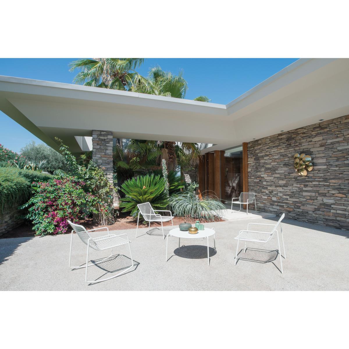 The “Rio R50” collection is a tribute to the Rio armchair, one of the historic models by Emu, which is celebrating its 50th anniversary this year. The Rio armchair was produced between 1960 and 1970. The retro grace of this mesh metal collection is brought up to date by the use of modern materials and manufacturing techniques. The ethereal silhouette of this low armchair represents a minimal, refined graphic sign. The metal mesh makes the volume of the chair intangible. With its simple, essential lines, Rio 50 finds its place in different environments, from the house to the garden. With more than fifty years’ experience in metalworking, Emu expresses its style in gardens and on terraces all around the world. Emu creations have become icons in the world of "made in Italy" design and quality. The Rio 50 low armchair consists of an ASFORM steel tube structure, high-quality steel with advanced mechanical capacities and high weight-resistance. The steel tube is characterised by a clearly visible "R" in the area where the seat joins the backrest. All its structural welds are carried out using Ming technology, which provides better resistance to stresses and reduces the risk of rust while, for greater precision, the steel wire mesh is electro-welded to the structure. As with all EMU steel products, a cataphoresis pre-treatment is applied, followed by the application of a thermosetting powder paint. So the product is covered with a layer of paint of uniform thickness, offering a high degree of adhesion and resistance. The presence of nylon caps at the end of the feet helps protect the product and make it easier to move around.