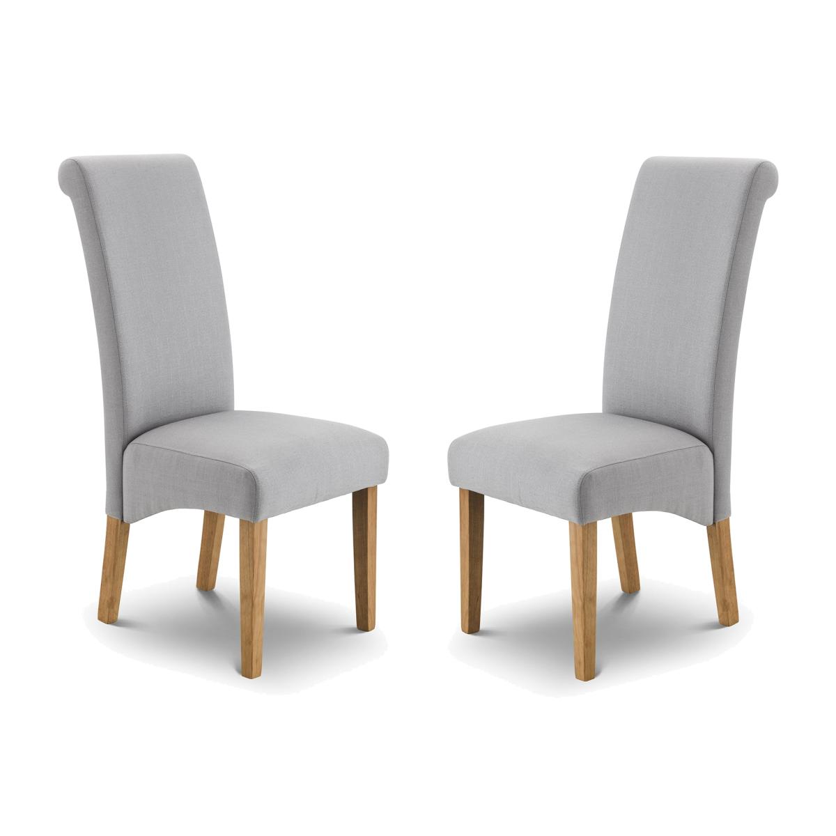 * 2 x Dining chairs* Tall scroll back* Hardwood frame Featuring a stunning scroll back design and upholstered in modern linen effect fabric, these chairs exude sophistication. The hardwood frame, foam, and fabric upholstery ensure durability and support, while the sprung and webbed seat base adds extra comfort.